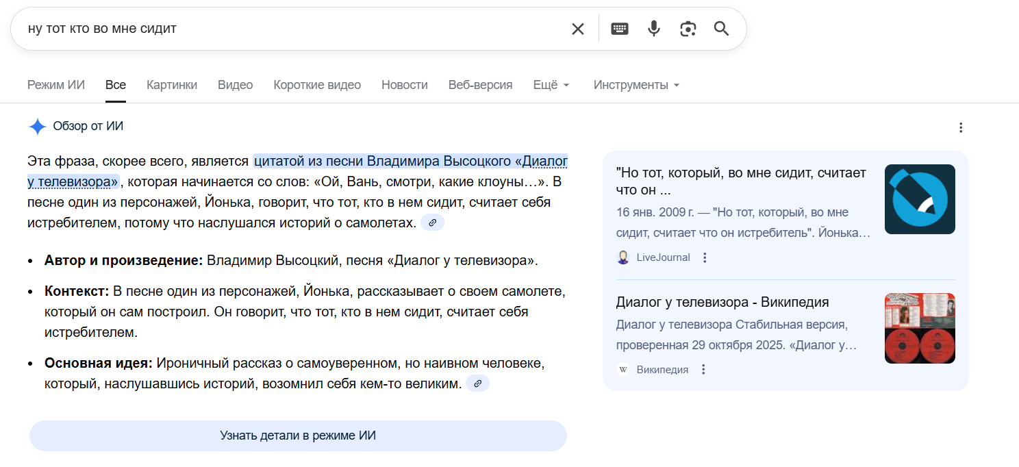 >>326406428 (OP) Они все ебанулись. Мне несколько дней назад поисковая нейронка гугла выдала, что 5070 вышла в июне 2024. Т.е. она была даже не в состоянии подтянуть данные с википедии или сайта нвидии и выдумывала данные на ходу. Или вчерашний пример пикрил, этот даун даже не смог по фразе опознать песню