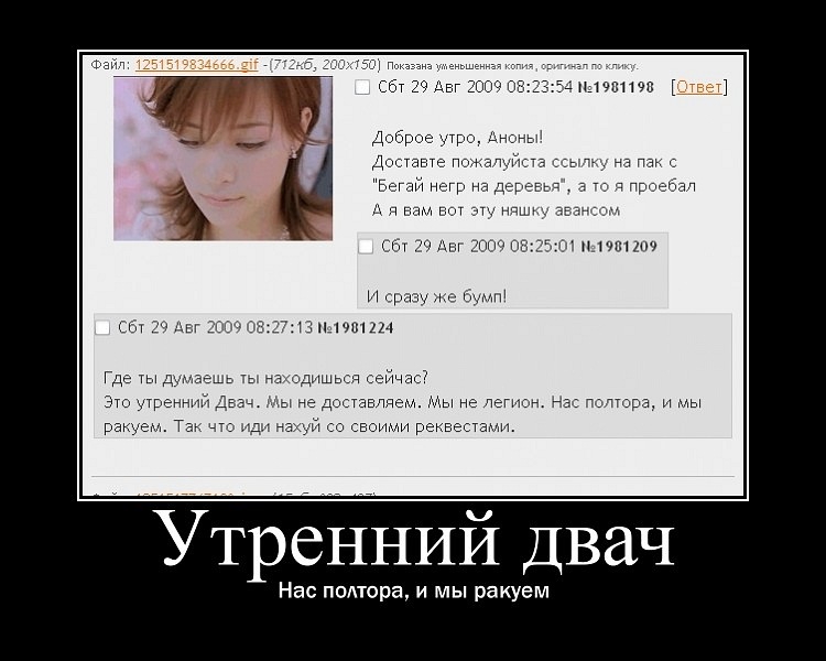 >>326679275 > Поэтому у меня и неприязнь к тем, кто в конфах сидит. Тут без спору. > И то, что смысл потеряли здесь сидеть, когда аватарки запретили, раздражает. Тут хз. Я бы предположил, что люди получили баны + заняты. ... Но и без этого мало актива было. (А тот, который мог бы начать что-то - исчезал на глазах (наверное надо большими буквами писать "без аватарок") Схуяли забанили "страшно? А ведь тебя предупреждали!" > не буду же я один Постараюсь тебе в этом подсобить. Но у меня технические вопросы.