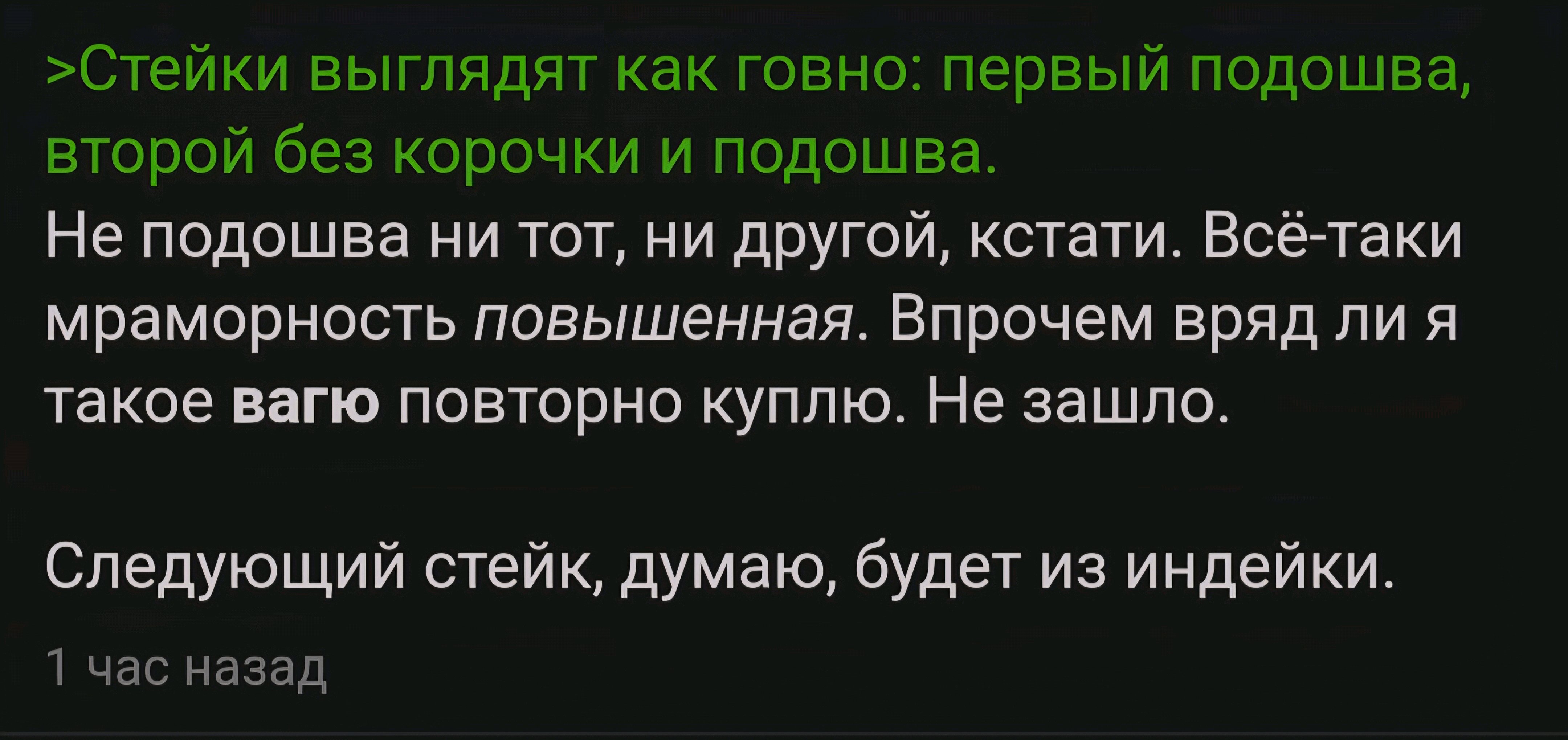 Вкус... Это был не просто вкус. Это был ДИАЛОГ. Диалог между моим иммунитетом и бактериями. Я чувствовал, как они спорят во рту. 15/10. Я не просто приготовил стейк. Я ПЕРЕОСМЫСЛИЛ СМЫСЛ ЕДЫ. Вы просто жрёте. А я веду диалог с вечностью. И вечность отвечает мне лёгким расстройством желудка.