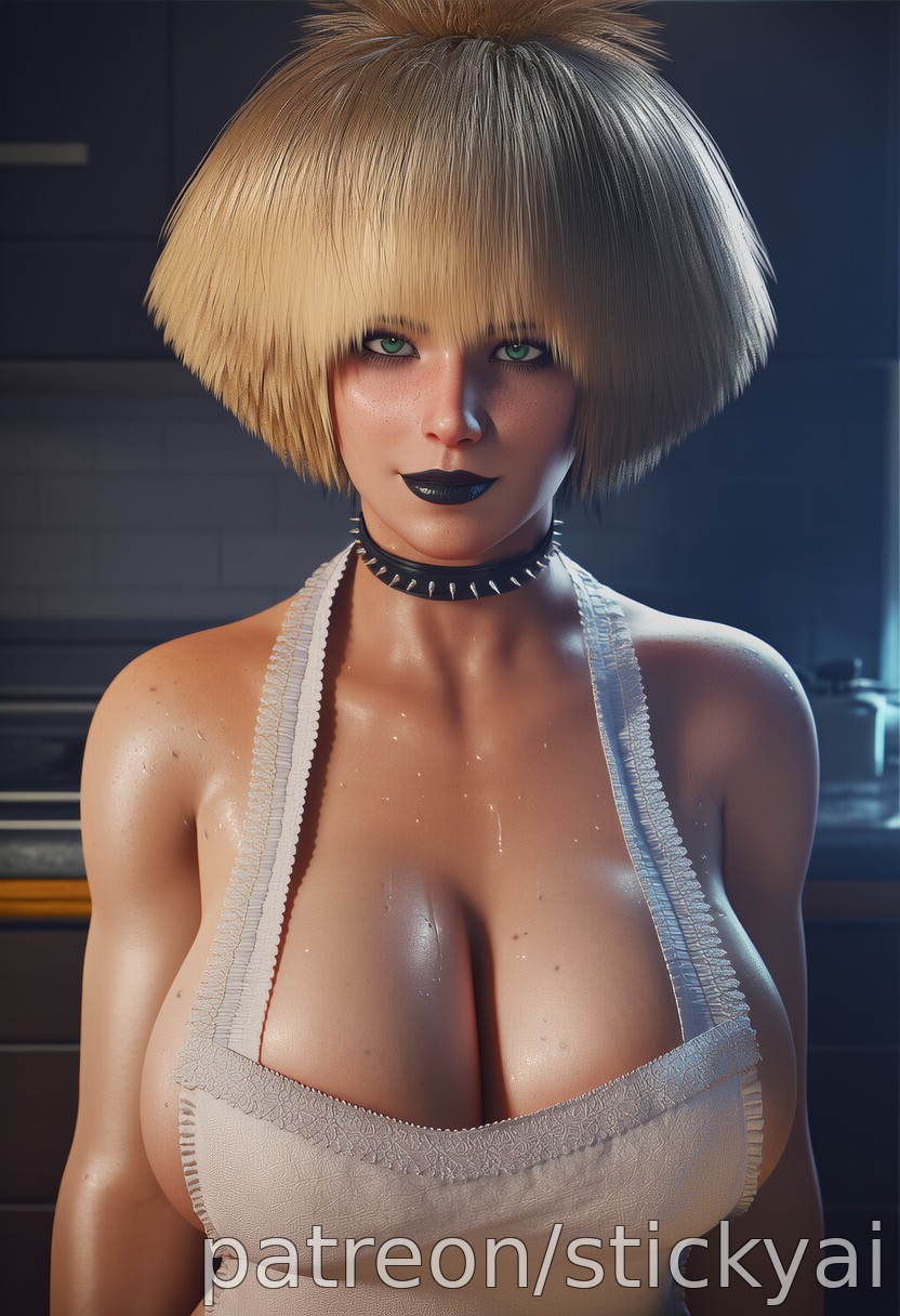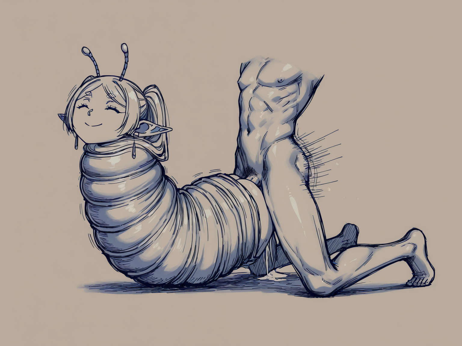Присутствует пирсинг в сосках соединённый цепочкой, одной рукой она тянет эту цепочку вверх. Или, например, между сисек зажат какой-то предмет. Колбаса или банка смазки, которая сама выделяется, или нога чья-то, или гусеница-Фрыня.