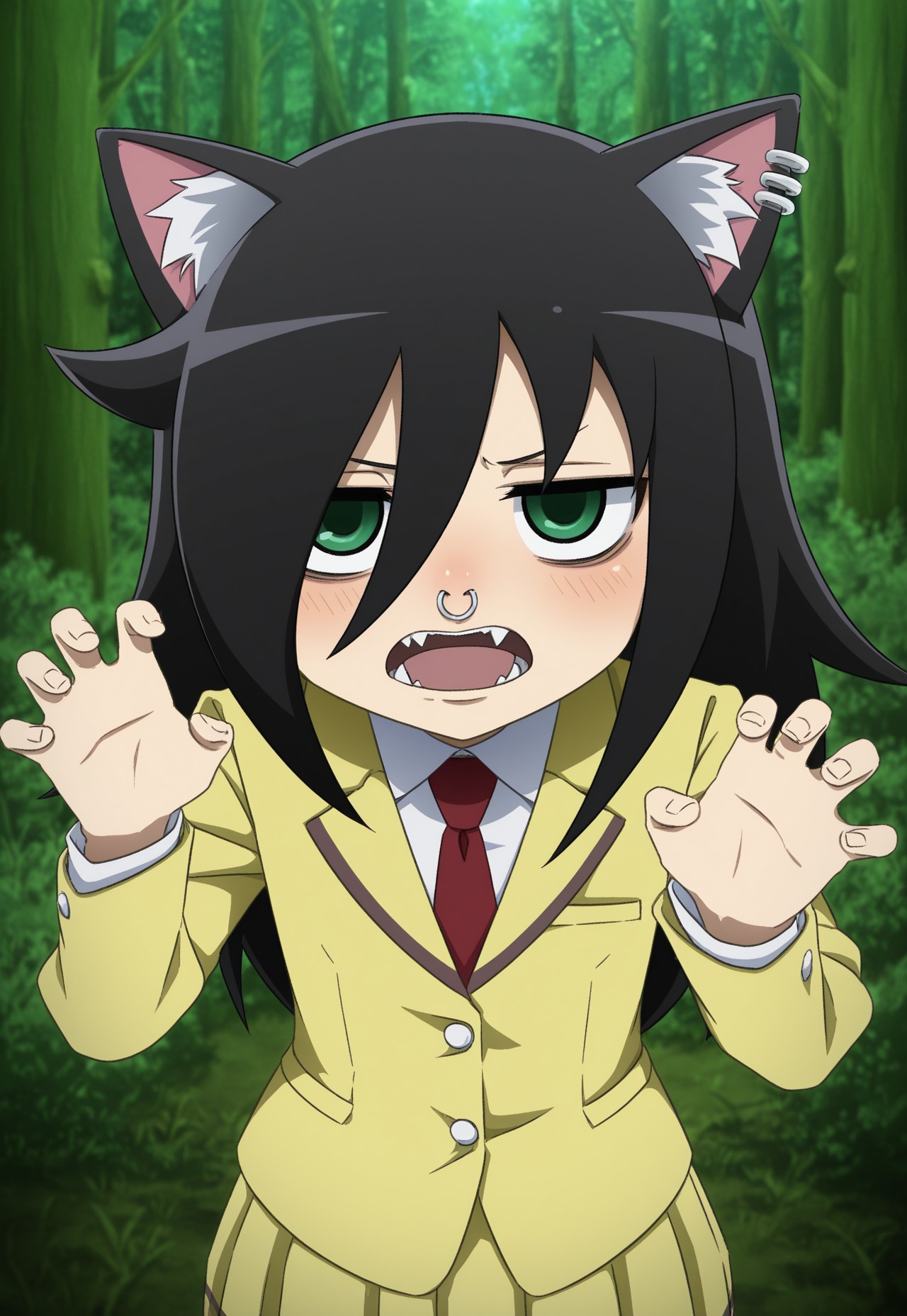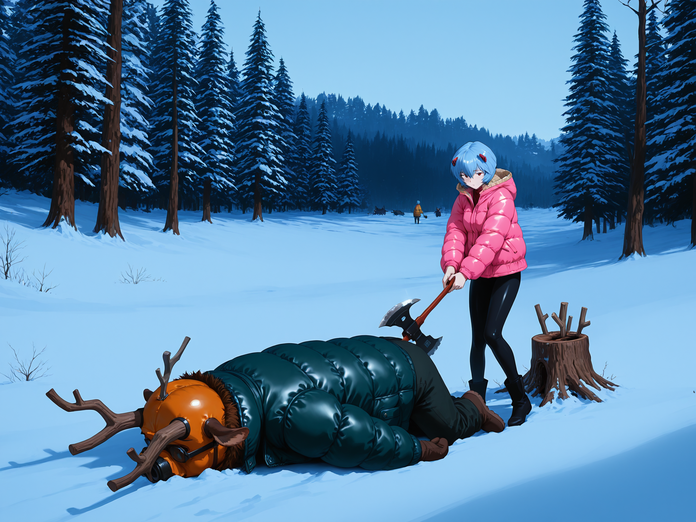 Сидит на пеньке за косарь, на ногах кожаные гачи-ремни с шипами. На шее тоже ремень с шипами.