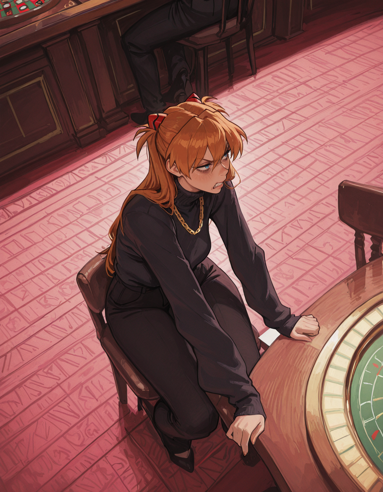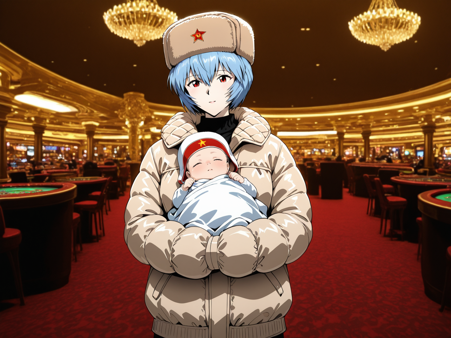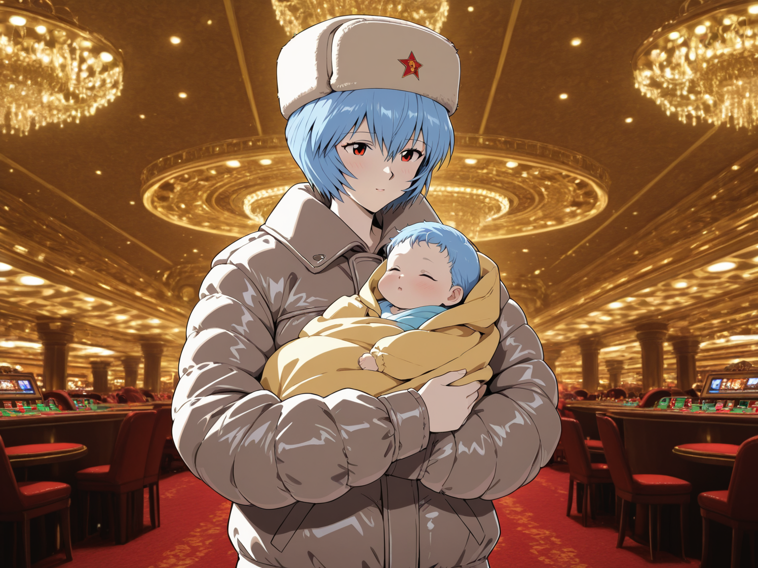 >>326831315 >>326830961 >малиновый костюм. Рей в малиновом пиджаке, водолазке, черных штанах и золотой цепью на шее и чтобы Аска подавала ей пиво тарелку с закусками в баре.