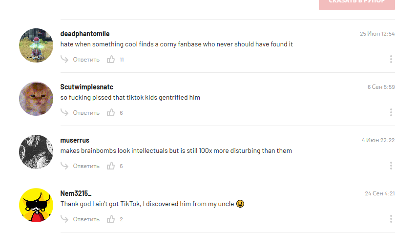 >>326828669 Чисто из за этого он 100% взял его с тренда? Даже при том что вот он написал скрин оставил >>326828424. Я имею ввиду он мог узнать об этом ТОЛЬКО из форса? Физически невозможно или впринципе ни одна живая душа до этого форса в тиктоке не знал о существовании этого клипа и даже в теории не мог чи я не понимаю нихуя
