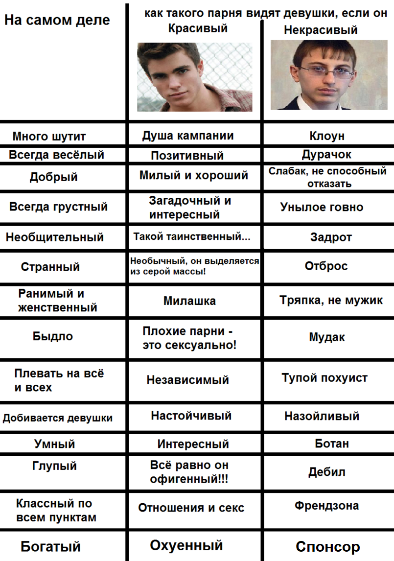 >>326841700 Когда ты накачаный секси хуй с ебалом 10/10, то тянки сами подкатывают. Когда ты всратый уринослав в картофельным ебалом, ты можешь услышать такие фразочки как: - я же девочка, я стесняюсь)) - я сейчас не ищу отношений -Ты такой замечательный парень, ты найдешь кого-то получше -У меня сложный период сейчас -Ой, извини, заснула вчера, поэтому прочитала и не ответила. -я сейчас погулять не смогу, напиши ближе к выходным (спойлеры, в выходные тебе даже не ответят) -Мне нравятся решительные и уверенные парни (полная хуйня, чет к мажорчикам стесняшам бабы клеятся будь здоров)
