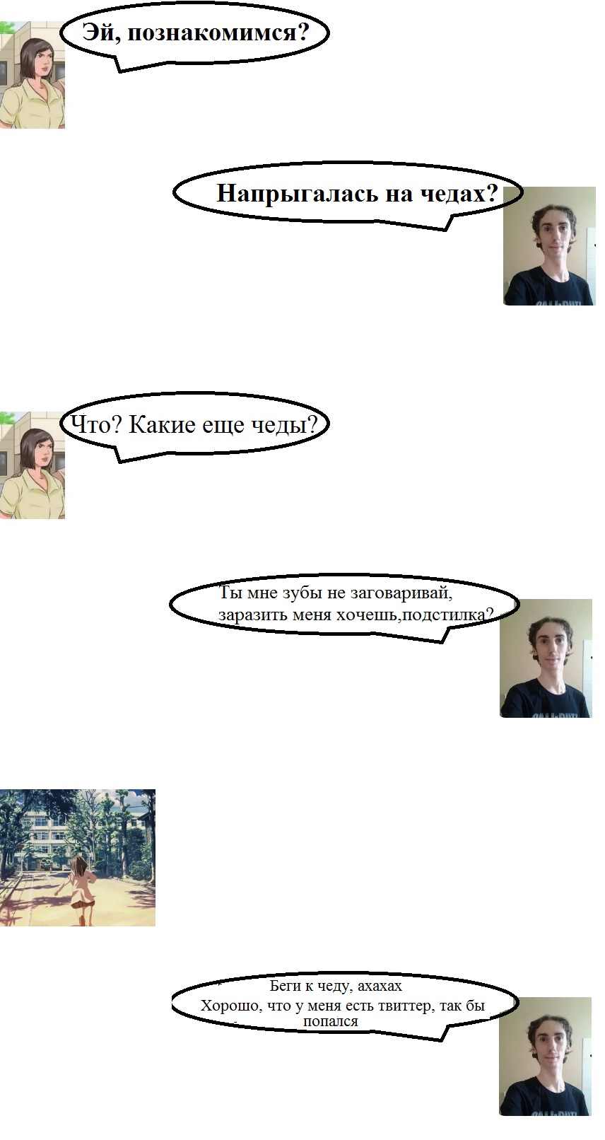 Кстати да. Я охуел когда она мне показала скрин, там пердикс 20 лет пишет. "привет, а у тебя красивая грудь😏". Сам блять дрищ прыщавый, Маркаряна чтоли насмотрелся? Ты еще блять напиши "привет, а у тебя пухленькая писечка?"