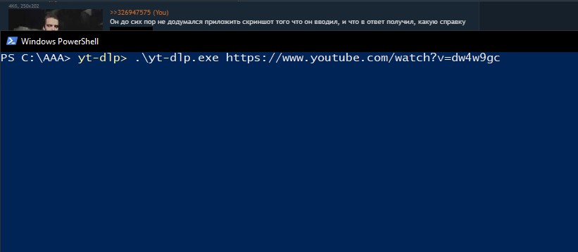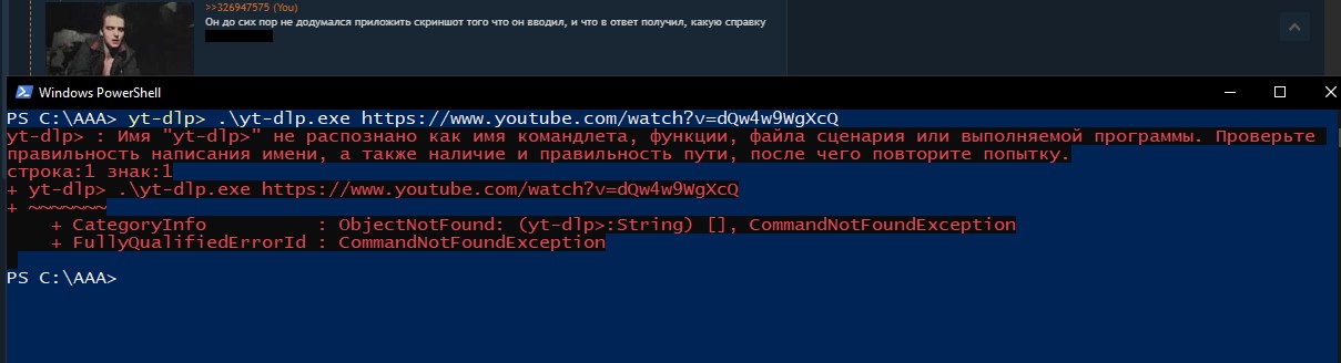 >>326947929 А дальше всё качается лул, ты что-то криво делаешь, ты просто открываешь powershell через шифт в папке где лежит ytp-dl и ffmpeg, всё, видишь как у меня на первом скрине путь выглядит и как приложение жёлтым подсвечено, а у тебя нет, у тебя хуйня какая-та в пути.