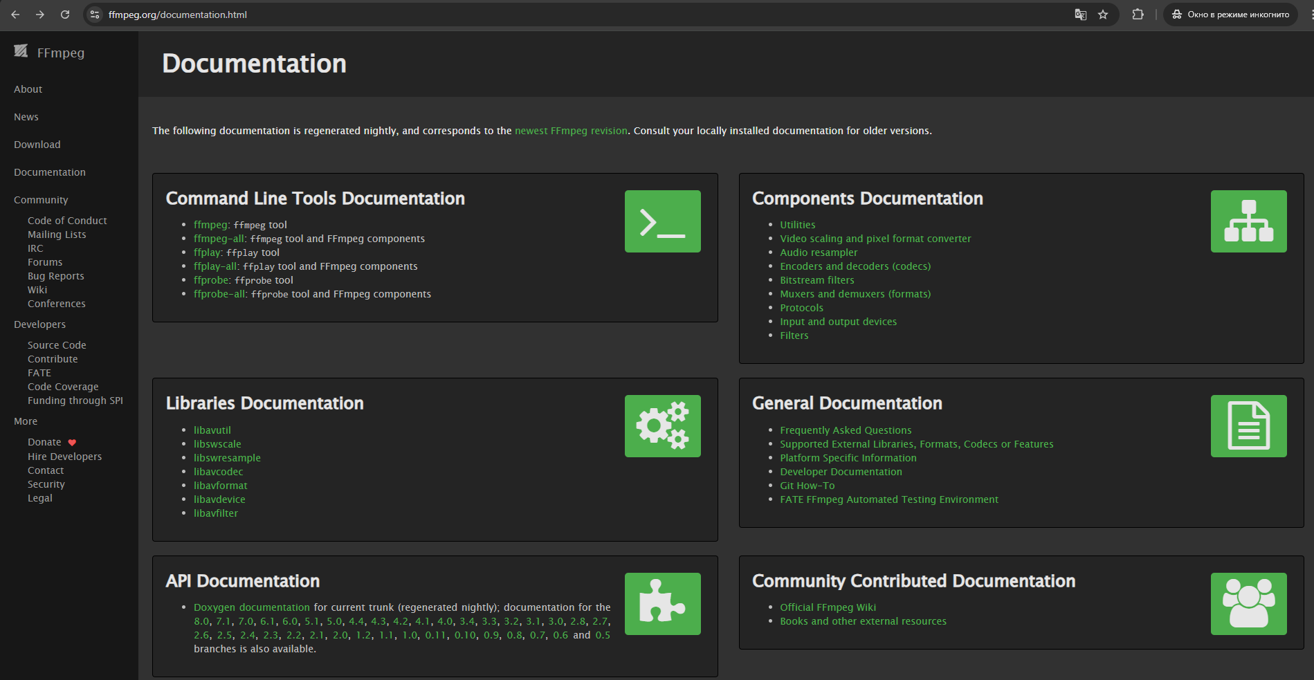 >>326985437 >Нихуя не просто, запомнить все ключи... Особенно если сделать надо прямо сейчас, а ты гуглишь как. И тебе попадаются не охуенные туториалы кратко объясняющие логику работы, а всякие сборники типа 100 ЛУЧШИХ КОМАНД FFMPEG Нахуя гуглить какие-то левые туториалы, если там все есть в официальной документации, прямо на сайте.