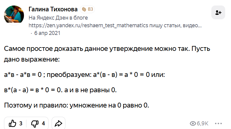 Отсюда следует, что ноль обладает особым свойством при умножении, которое доказывается так:
