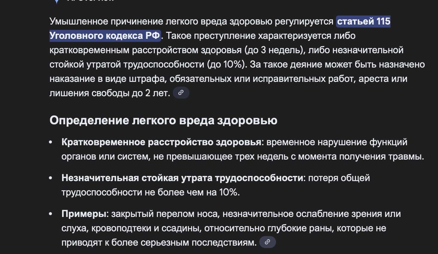 >Примеры лёгкого вреда здоровью >Ушибы и ссадины: Множественные кровоподтёки, синяки и ссадины. >Переломы: Закрытый перелом носа. >Другие повреждения: Относительно глубокие раны, которые вызывают кратковременное расстройство здоровья. >Функциональные нарушения: Незначительное снижение зрения или слуха, связанное с потерей трудоспособности