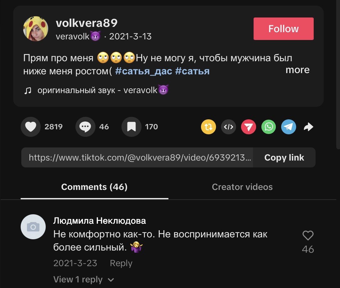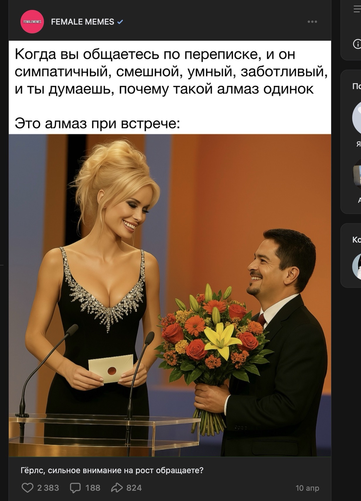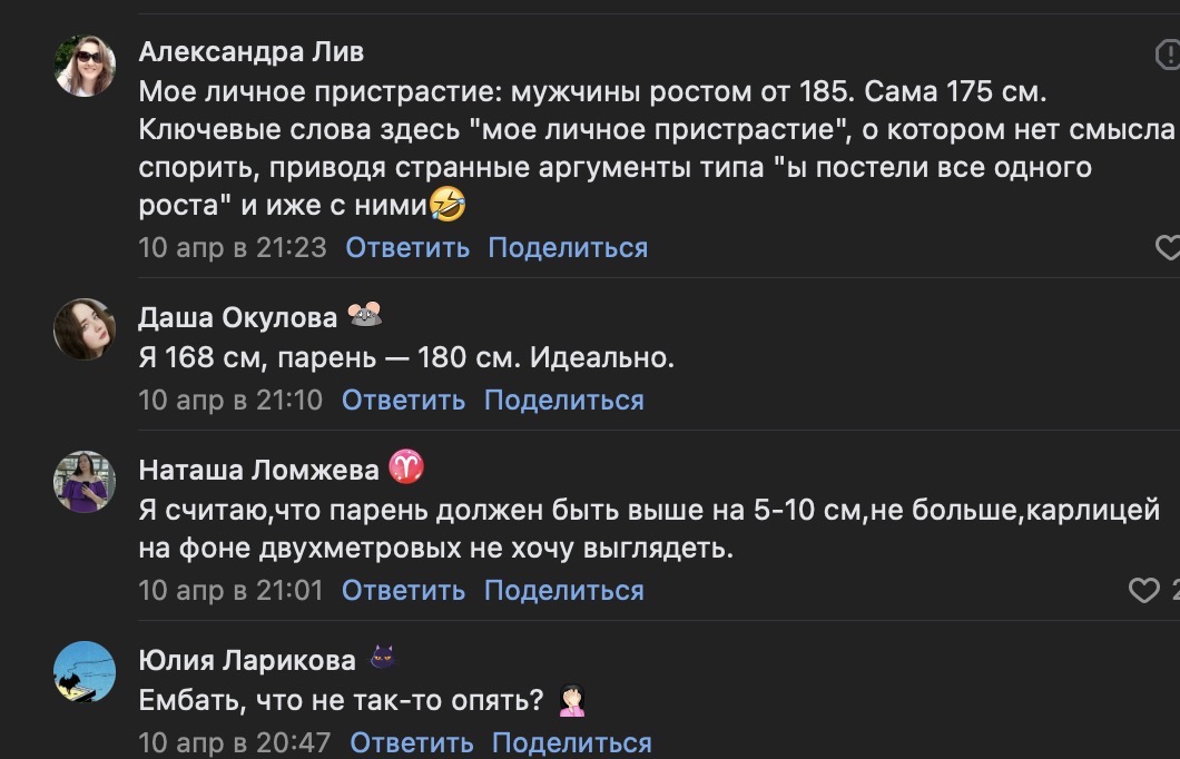 Невероятный копиум. Общался с тян 187см, у нее был бывший (высокий), пара симпов, в итоге чел с другого города блять к ней ехал на поезде с цветами. Вроде с ним в итоге и замутила И это всё до 19лет, она ещё и на лицо не очень