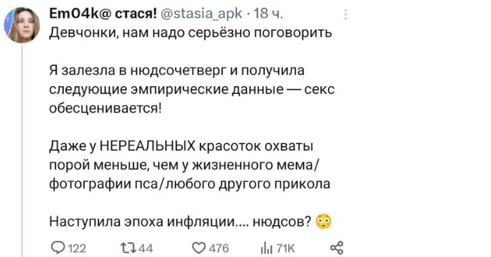 Просто поколение 80х постепенно выкатывается из ебли. Гормоны уже так не ебашат, уже и со здоровьем проблемки появляются, тут уж не до ебли. Ну а те кто нас на рынке ебырей должны сменить - их элементарно мало чисто количественно. Достаточно посмотреть на возрастно-половую пирамиду. скуфандэпало