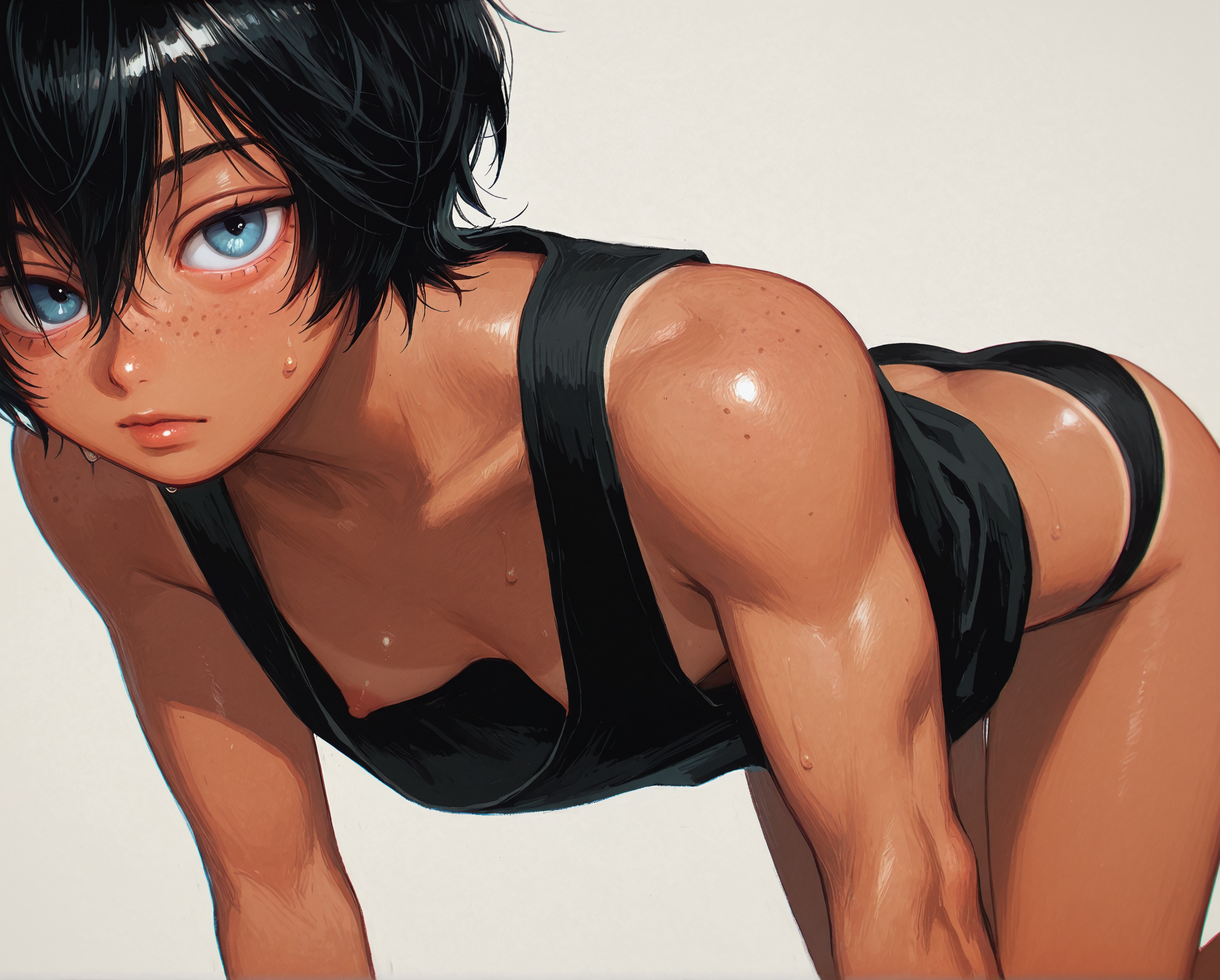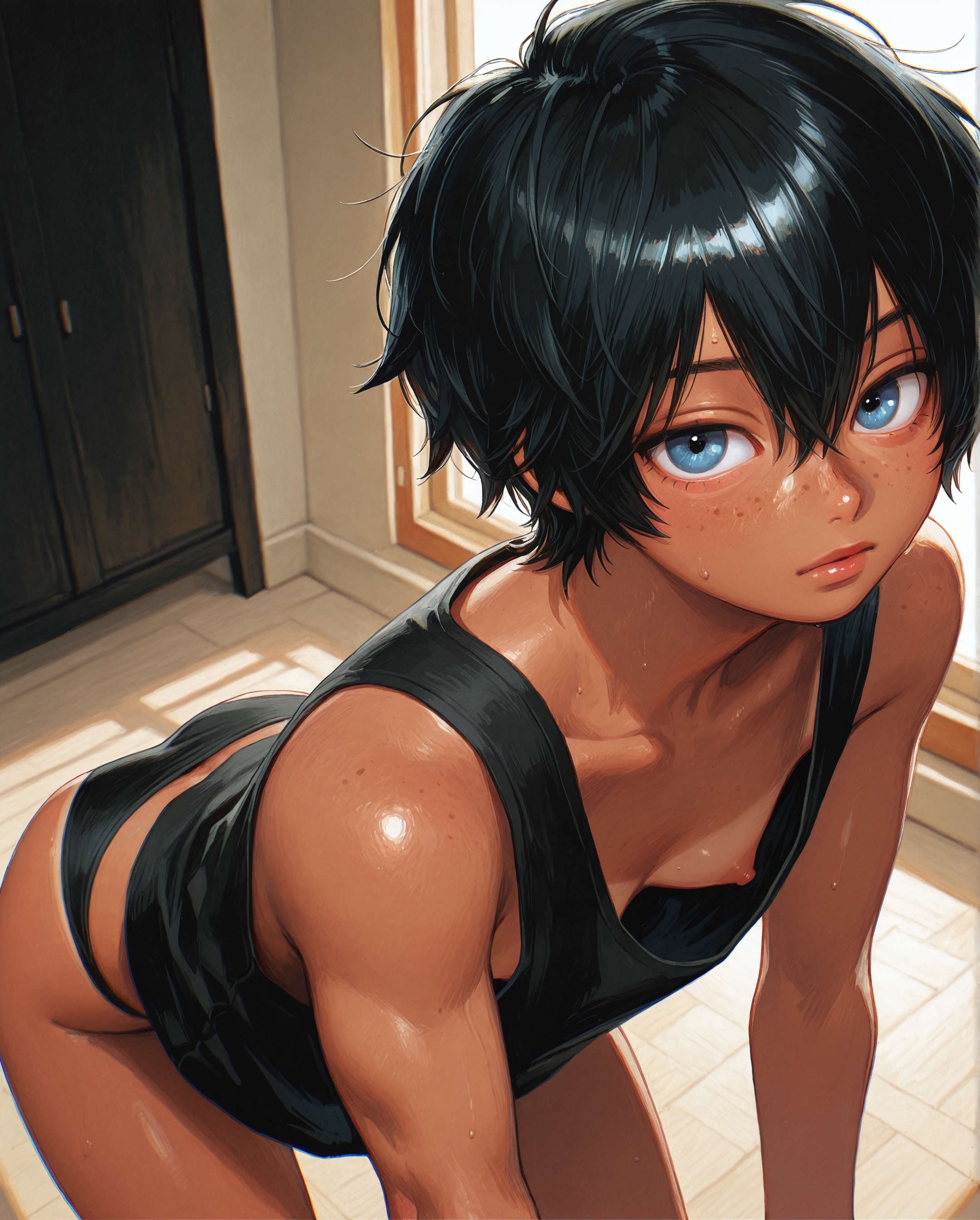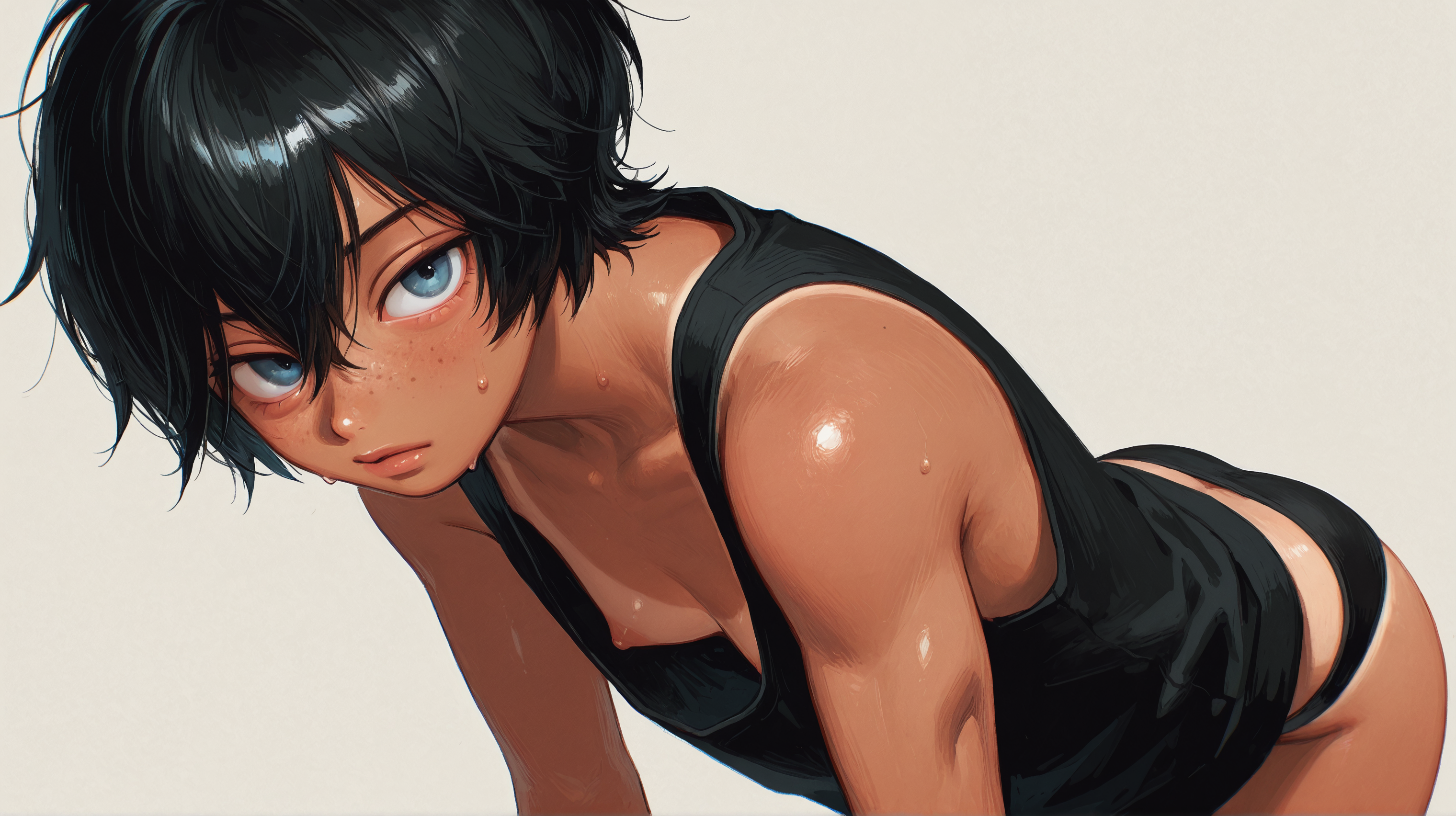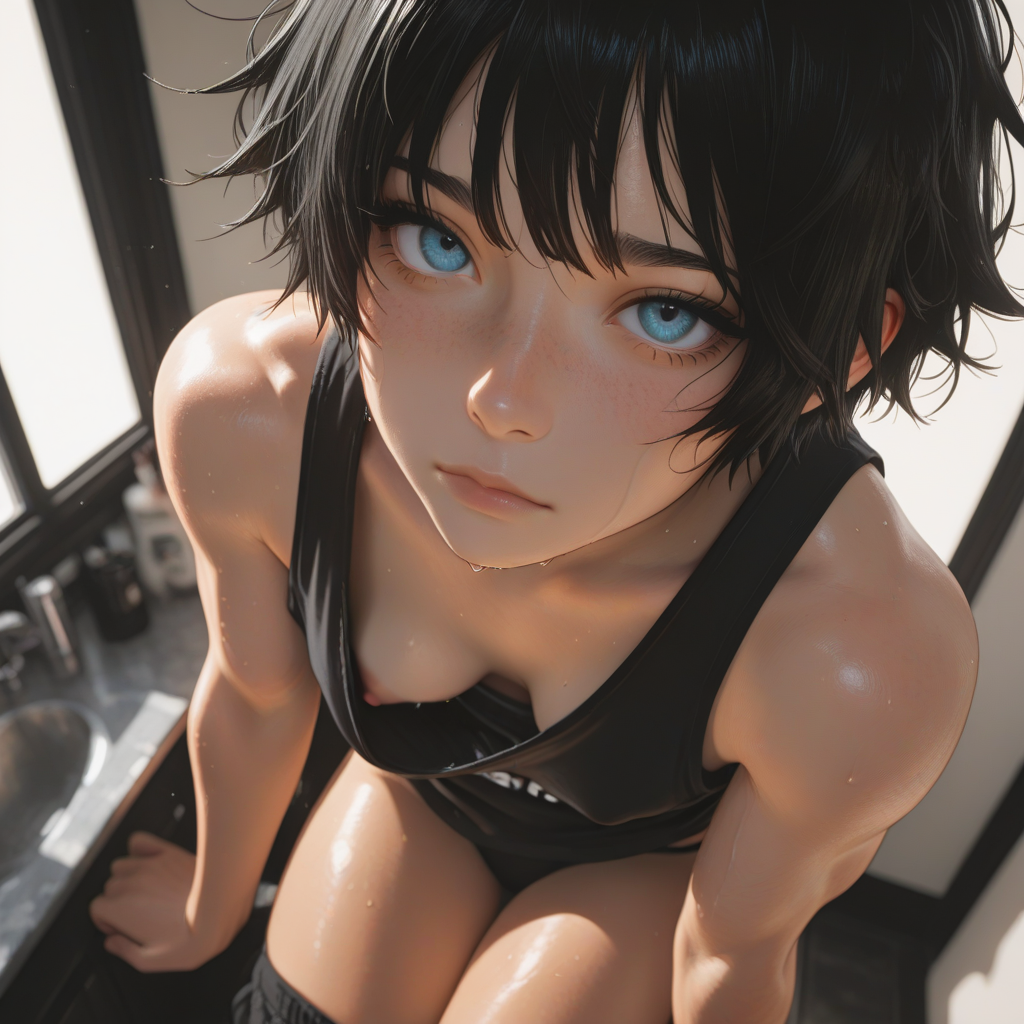 >>326985721 → tomboy, cute girl, black hair, messy hair, tan, looking at viewer, blue eyes, freckles, small breasts, fit, sligtly muscular, athletic body, perfect butt, black panties, loose black tank top, nipple peek, pensive, front view, from above, face focus, face close-up, downblouse, nipple slip, sweat, detailed background