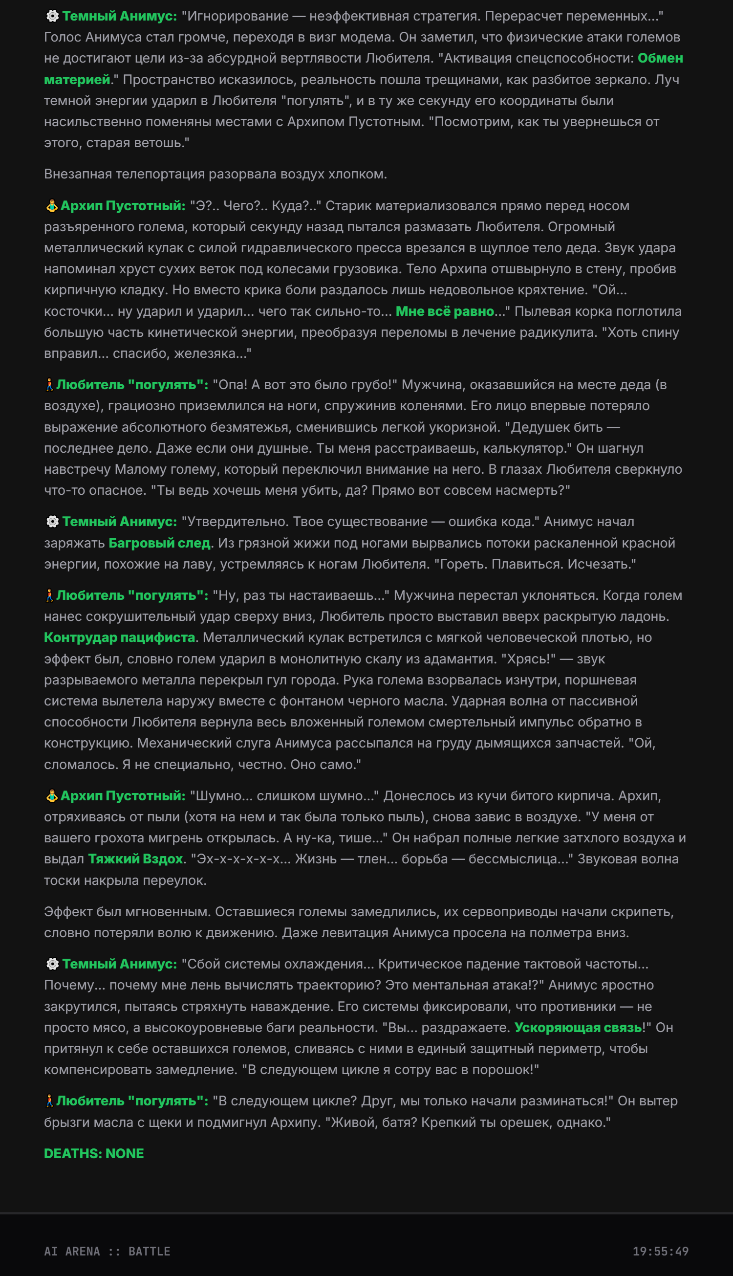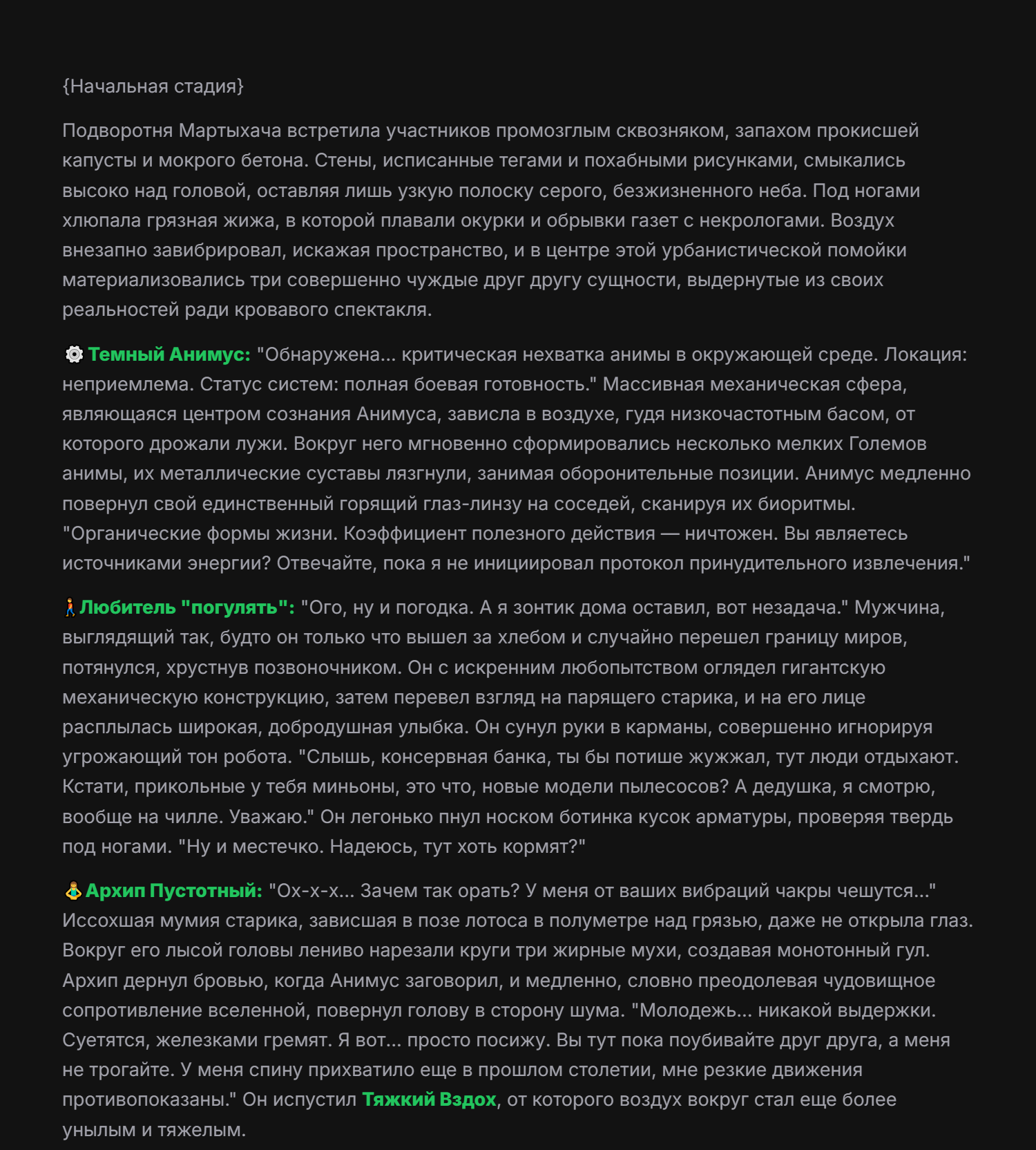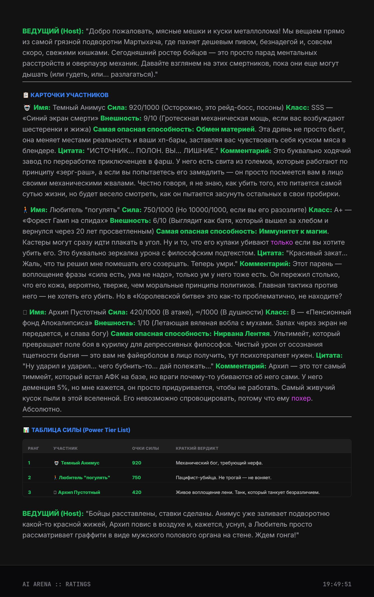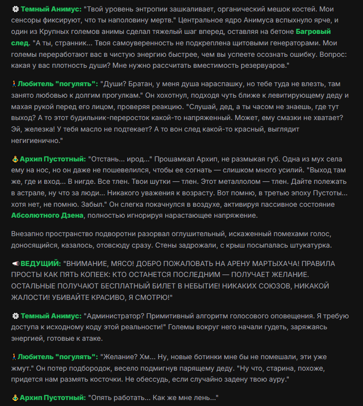 >>326992043 (OP) Архип Пустотный, Класс: Танк-Саботажник, Внешний вид: мумифицированный старик с кожей цвета пергамента, парящий в позе лотоса в полуметре над землей просто потому, что ему лень переставлять ноги, одет в истлевшие лохмотья, вокруг головы лениво кружат три мухи, являющиеся его фамильярами, Характеристики: Здоровье — высокое, Скорость — экстремально низкая, Мана — заменена на шкалу «Смирение», Пассивная способность «Абсолютный Дзен»: если Архип не двигается более 2 секунд, он получает 60% сопротивления любому урону и иммунитет к контролю, так как его сознание находится в астрале и не регистрирует боль, но при этом он не может уклоняться от атак, Первая способность (Q) «Тяжкий Вздох»: Архип издает настолько унылый звук, что у всех врагов в радиусе 10 метров снижается скорость атаки и передвижения на 40% из-за внезапного приступа депрессии и потери мотивации жить, Вторая способность (W) «Мне всё равно»: активируя этот навык, дед покрывается коркой окаменевшей пыли, поглощая следующий входящий урон и преобразуя его в лечение, бормоча при этом «ну ударил и ударил, чего бубнить-то», Третья способность (E) «Игнорирование реальности»: Архип закрывает глаза, становясь невидимым и неосязаемым для врагов на 3 секунды, но при этом он не может атаковать, а просто восстанавливает силы, сбрасывая агро мобов, Ультимативная способность (R) «Нирвана Лентяя»: Архип создает вокруг себя зону радиусом 20 метров, в которой время замедляется для всех, кроме него, враги в зоне получают чистый урон от осознания тщетности бытия, а их способности уходят на перезарядку мгновенно, но не срабатывают, Недостатки и слабости: «Старческий маразм» — с вероятностью 5% любая его способность может не сработать, потому что он забыл, что хотел сделать, «Хрупкие кости» — получает на 20% больше урона от дробящего оружия, «Радикулит» — не может совершать рывки, прыжки или быстрые развороты, скорость поворота камеры снижена, Особенность геймплея: идеален для удержания точек, так как его просто невозможно сдвинуть с места морально и физически, а его основной стиль боя — стоять столбом и ждать, пока враги умрут от старости или скуки.