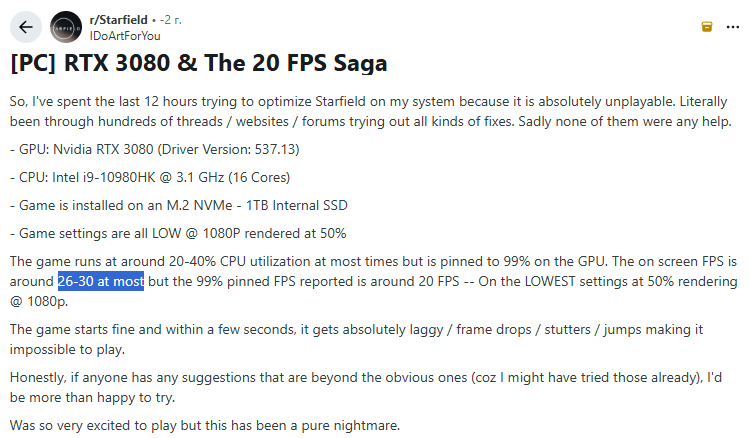 >>327053637 Если ты не видишь проблем с оптимизацией стартового старфилда ни тут, ни в инете, то ты явно в глаза долбишься, либо просто слепой. Вот тебе ИТТ. 2 года назад, 3080, i9-10980 >>327049769