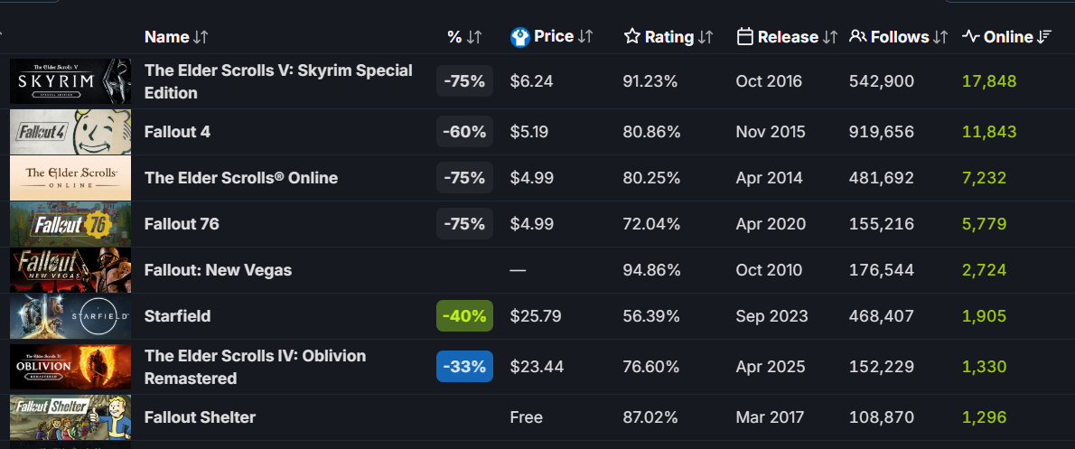 >>327051594 Почему там у TES Online онлайн выше чем у Обливион Ремастер? Это хуйня а не статистика. Обливион объективно лучше. У меня куплены обе игры, я проверял.