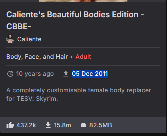 >>327060644 CBBE скайримовский уже через год (5 ноября 2012) выглядел офигенно. Тут за 2 года даже с СДК ничего подобного не сделали. Притом что текстурки кожи, вроде как, лучше