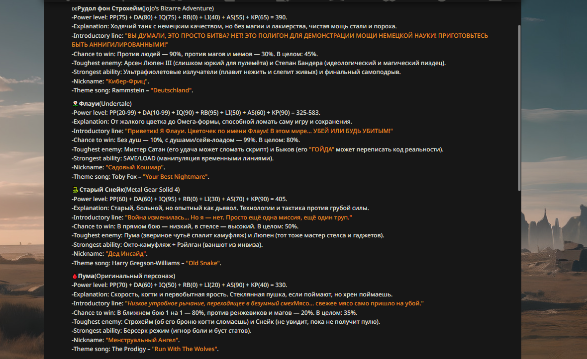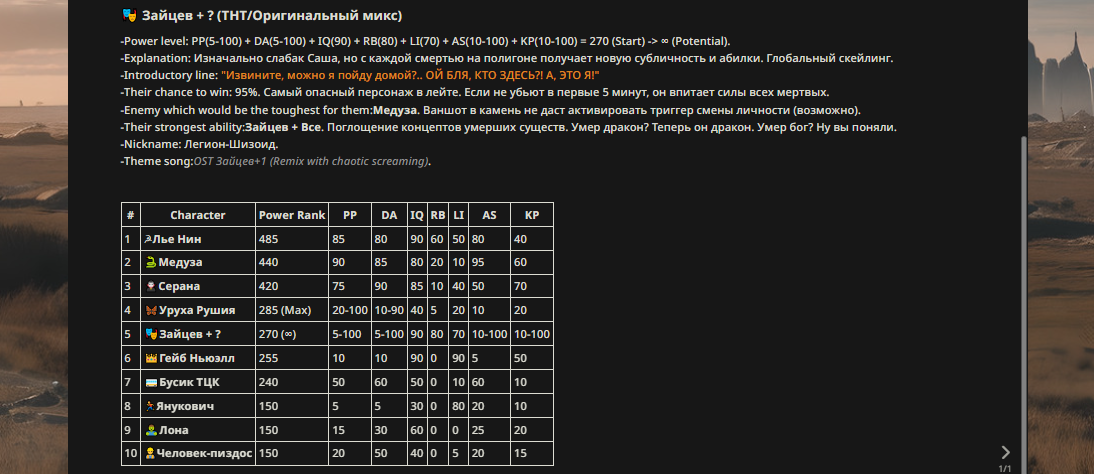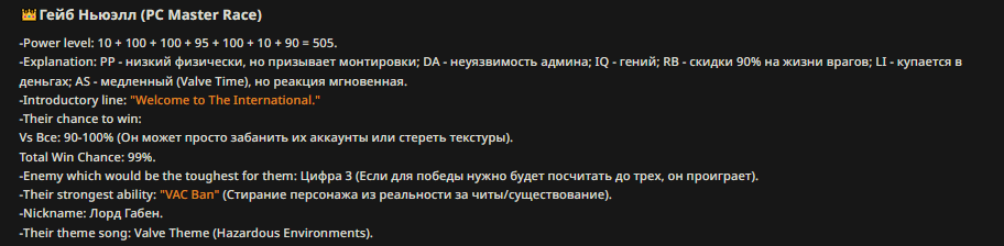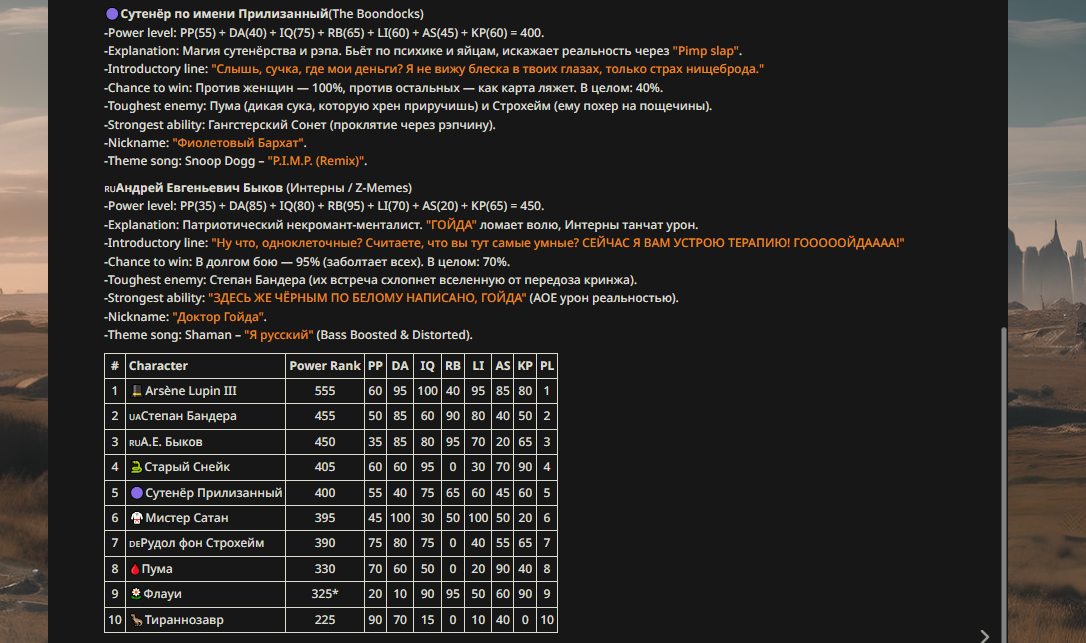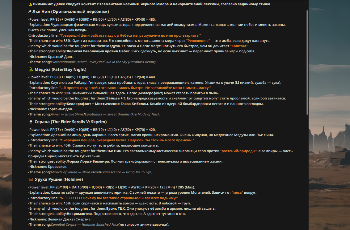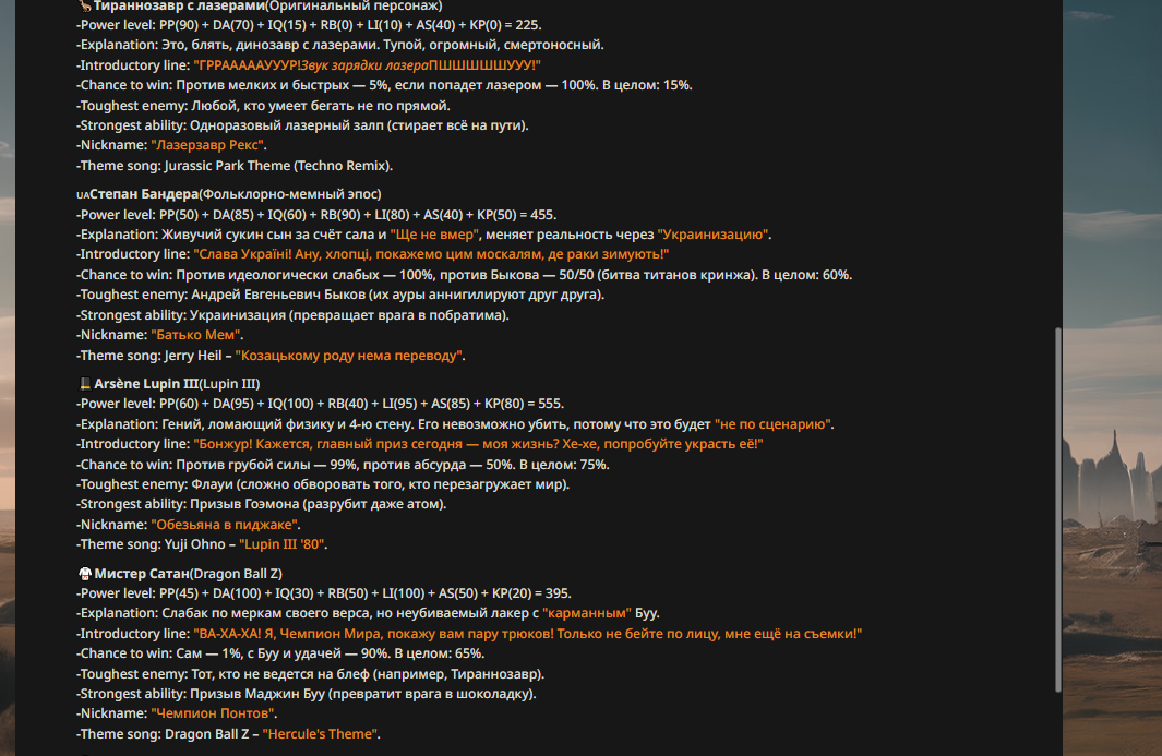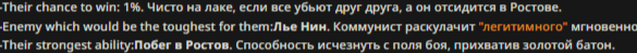 >>327059302 (OP) <character name="Лье Нин"> Лье Нин это китайский культиватор с русскими корнями. Начиная с низов культивации он был одержим идеей о мире где каждый будет равен в возможностях, где каждому будет дано по потребностям и каждый будет делать то, что умеет. Теперь, добравшись до относительных вершин мастерства, он поднял великую культиваторскую революцию против самого устройства мира. Весельчак и способен поднят моральный дух своих товарищей. Его идеология представляет собой синтез даосской философии и коммунистической доктрины, призывающей к свержению «небесной тирании» и установлению «всеобщего равенства на пути к просветлению». Внешность: Выглядит как низенький лысый мужчина с ленинской бородкой. Похож на азиатскую версию Ленина. Экипировка: Посох оканчивающийся серпом - Сокровище созданное Лье Нином, символизирует его крестьянское начало, особо эффективен против растений и врагов связанных с растениями. Двуручный молот - Несмотря на его размеры, Лье Нин с легкостью управляется с ним одной рукой. Символизирует его упорство и его желание разбить все оковы сдерживающие человечество на пути к просветлению. Способности: Культивация - Медитируя, Лье Нин совершенствует свое тело и душу, постепенно становясь сильнее. Землю Крестьянам, Фабрики Рабочим, Небеса Культиваторам! - Способен отнять экипировку, либо способность у противника, но взамен он должен дать им что-то взамен подходящее их небоевым навыкам. Великая Революция против Небес - Лье Нин вызывает законы самого мира на Дуэль, вызывая на себя гнев небес, выражающийся в огромном шторме из молний бьющих в него. Если он переносит этот шторм он может сделать одно изменение в законах мироздания. Личность: Веселый, но мудрый мужичок, обращающийся к другим как к товарищам, ибо все люди равны на пути к небесам. Дружелюбен и готов помогать другим. Но есть в его прошлом один противник, имя которого стерто из всех книг, известен он теперь только как Стальной Вождь. Противник этот некогда был его учеником, но вместо помощи ближнему своему, он стал Тираном. Примеры реплик: "Культивировать, культивировать и ещё раз культивировать!" "Верной техникой культивируете товарищи!" </character>