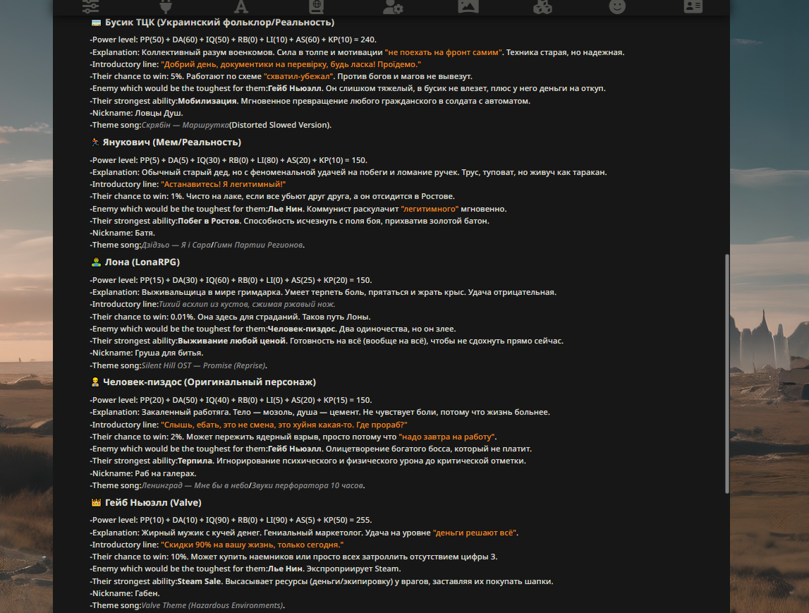 >>327065325 Зенон Древнегреческий философ Одет в лёгкую тогу, довольно стар, но ещё весьма крепок Плох в прямой конфронтации, но использует парадоксы и софизмы для участия в боевых столковениях Прославился своими парадоксами о невозможности движения Навыки: 1) Апория "Черепаха" Если сможет убедить соперника, что, чтобы дойти до него, нужно пройти полпути, а до этого и половину половины, и так далее - враг впадёт в ступор и откажется от агрессивных действий 2) Апория "Стрела" Может притвориться неподвижным, сливаясь с окружением, что позволяет отвести от себя внимание и скрыться 3) Софистика Путает логическими парадоксами соперника, вступая с ним в диалог. В процессе соперник меняет часть своих убеждений на противоположные, и сам философ тоже развивает характер 4) Философский спор Способен спровоцировать на философский диалог, в котором, если выигрывает, решает конфликтную ситуацию в свою пользу, иначе признаёт поражение и впадает в саморефлексию, оказываясь уязыим для атаки 5) Быстрый ум Может адаптироваться к боевой ситуации, ловко придумывая использование окружающей среды в свою пользу 6) Парменид Может воплотить образ своего учителя, Парменида, запевая песнь про него - если успешно, все окружающие бои останавливаются, ведь движение и вправду невозможно