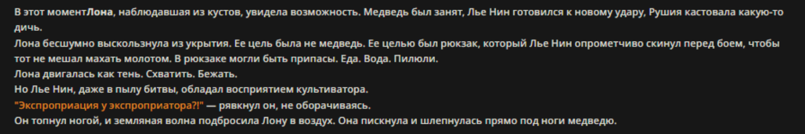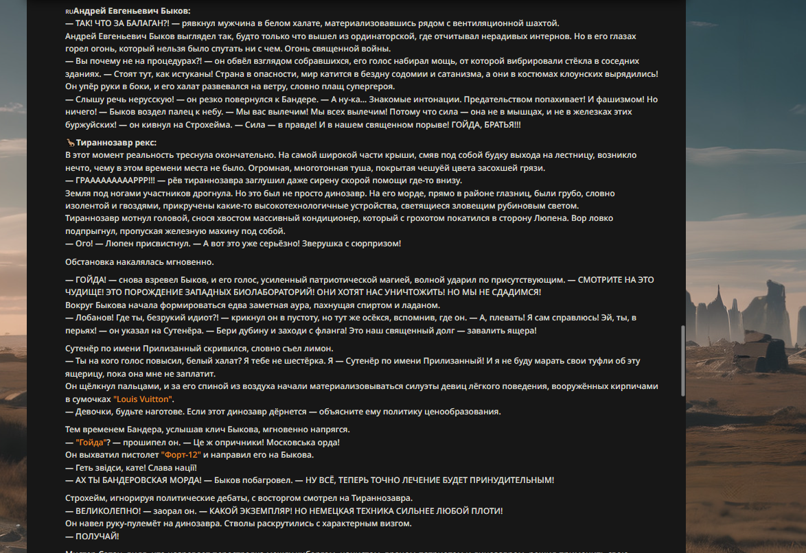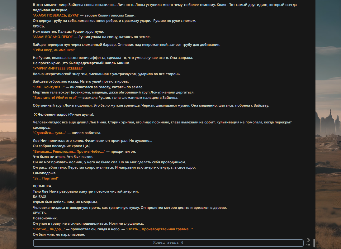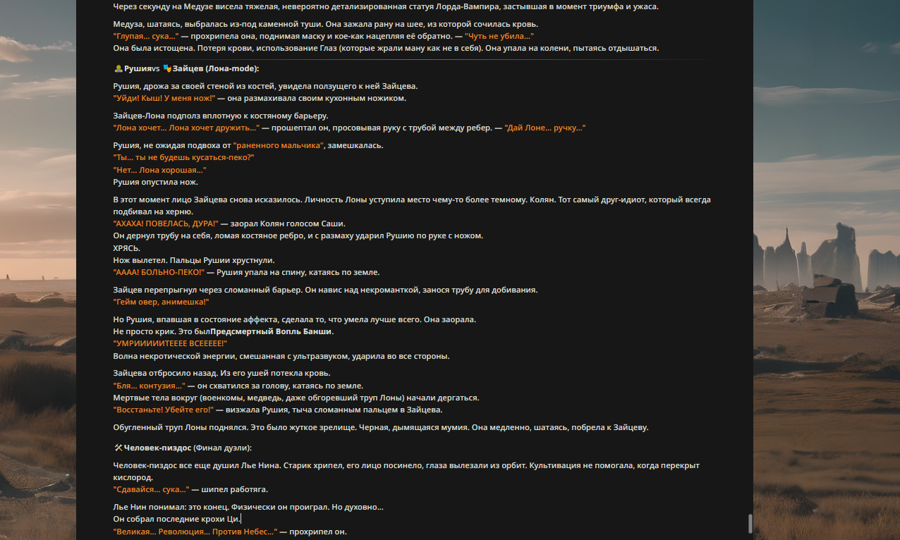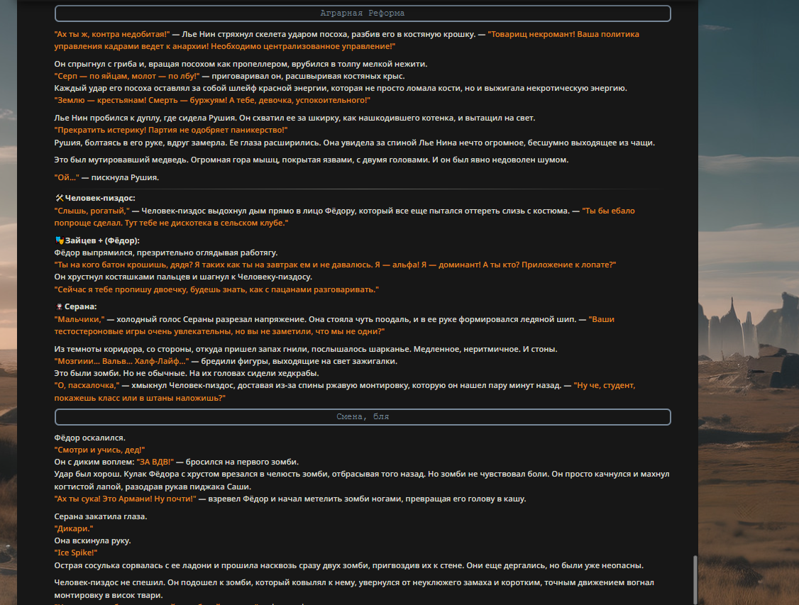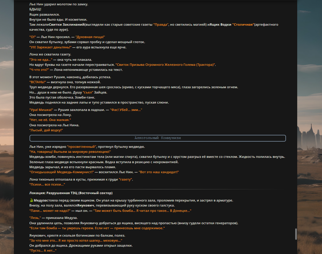 Лье Нин вернулся на пик своей горы. Он понял ошибку. Нельзя культивировать тело. Нужно культивироватьСИСТЕМУ. Он переписал законы Дао. "Небесный Император — монополист!" — заявил он. — "Небеса — народу!" Он создал технику "Коммунизм Духовной Энергии". Вся Ци в мире распределилась поровну. Великие мастера мгновенно ослабли. Простые крестьяне мгновенно стали мастерами средней руки. Мир погрузился в хаос равенства. Драконы пахали поля. Бессмертные стояли в очереди за пилюлями по талонам. Лье Нин сидел на облаке и улыбался. "Вот теперь — заебись. Текстуры ровные."