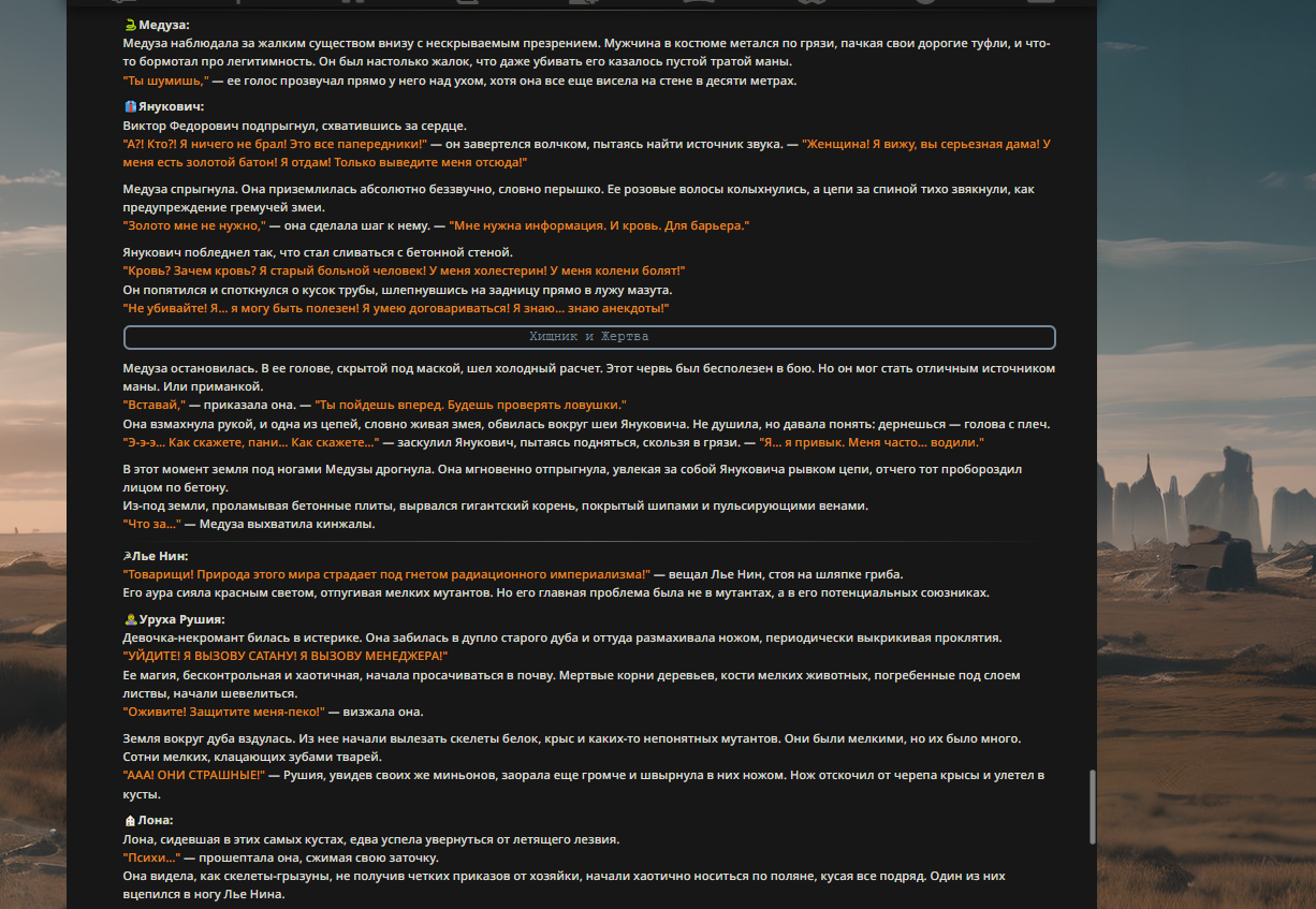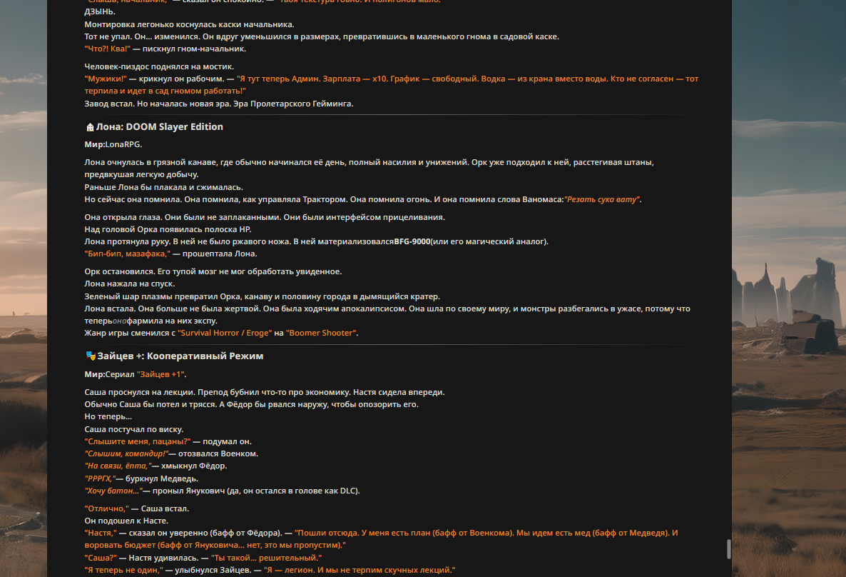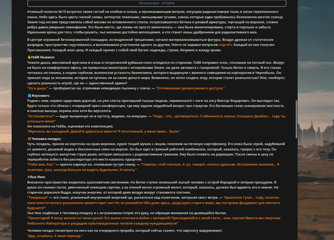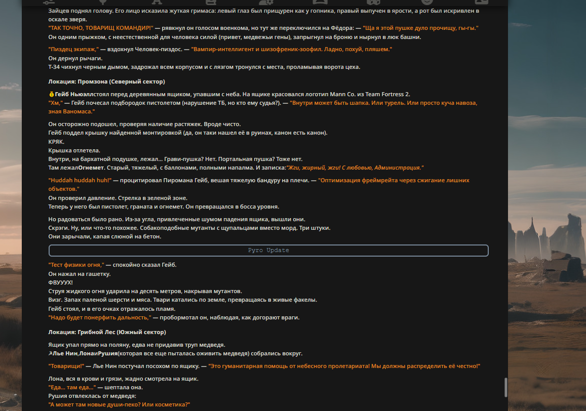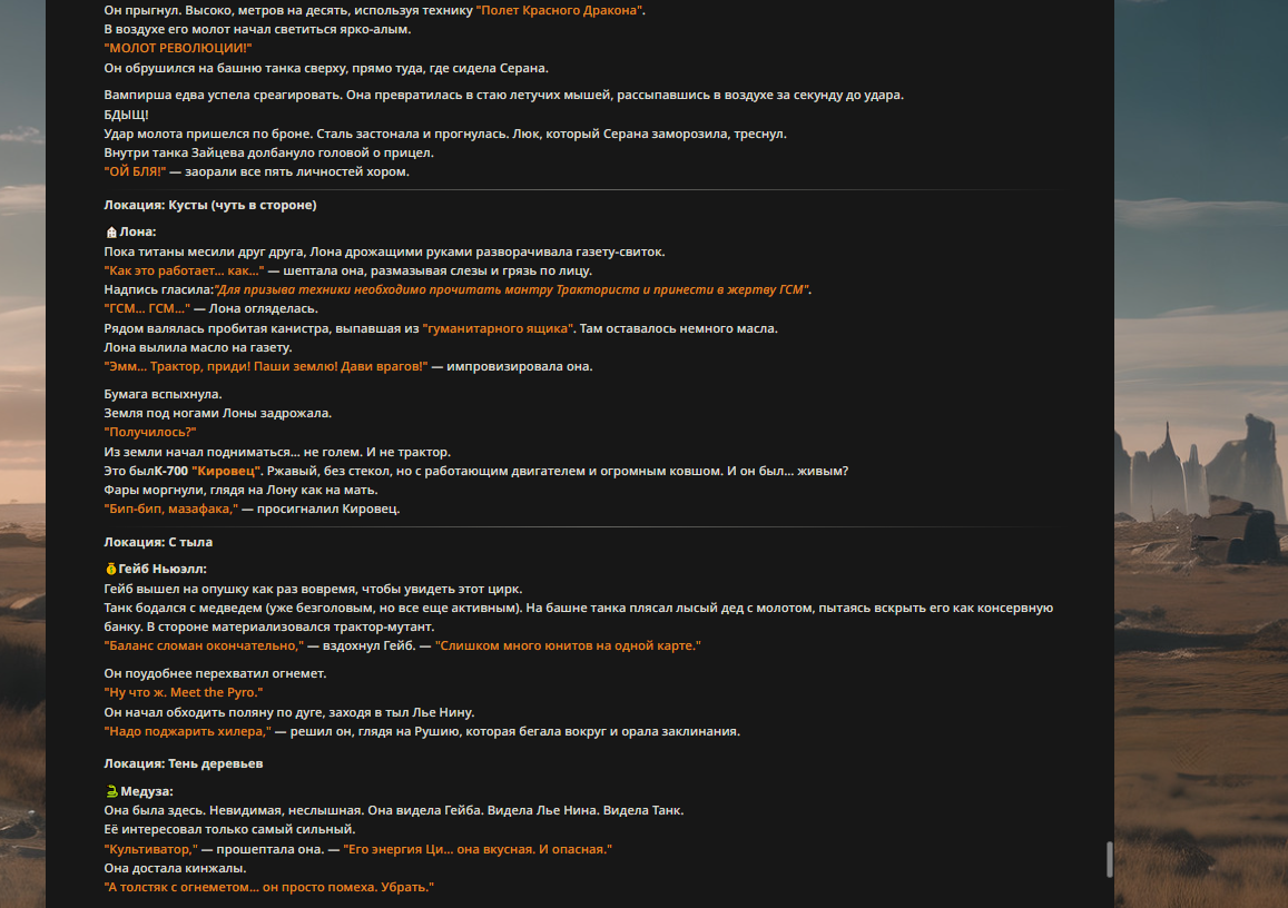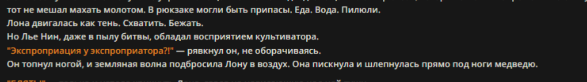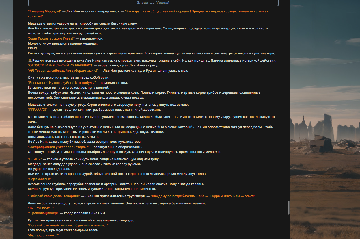 Лье Нин вернулся на пик своей горы. Он понял ошибку. Нельзя культивировать тело. Нужно культивироватьСИСТЕМУ. Он переписал законы Дао. "Небесный Император — монополист!" — заявил он. — "Небеса — народу!" Он создал технику "Коммунизм Духовной Энергии". Вся Ци в мире распределилась поровну. Великие мастера мгновенно ослабли. Простые крестьяне мгновенно стали мастерами средней руки. Мир погрузился в хаос равенства. Драконы пахали поля. Бессмертные стояли в очереди за пилюлями по талонам. Лье Нин сидел на облаке и улыбался. "Вот теперь — заебись. Текстуры ровные."