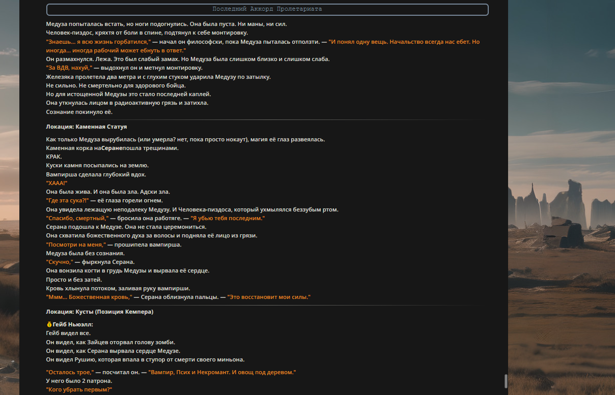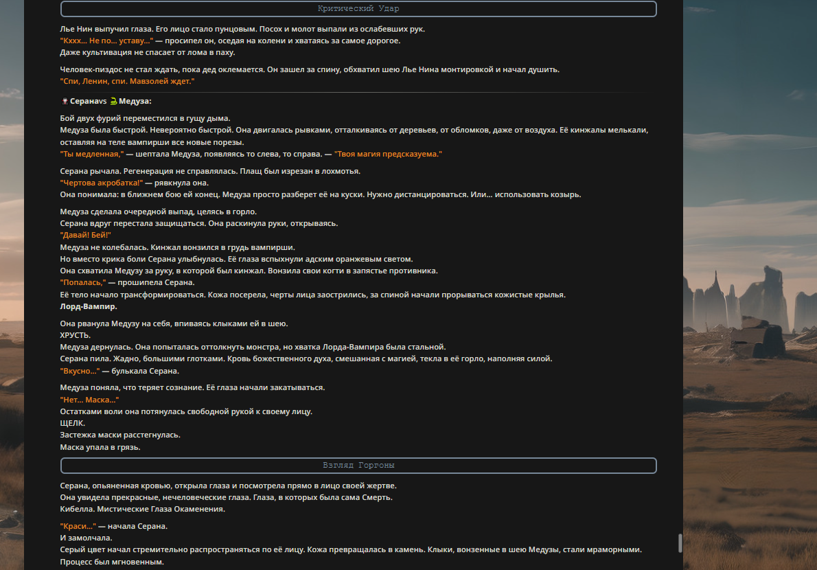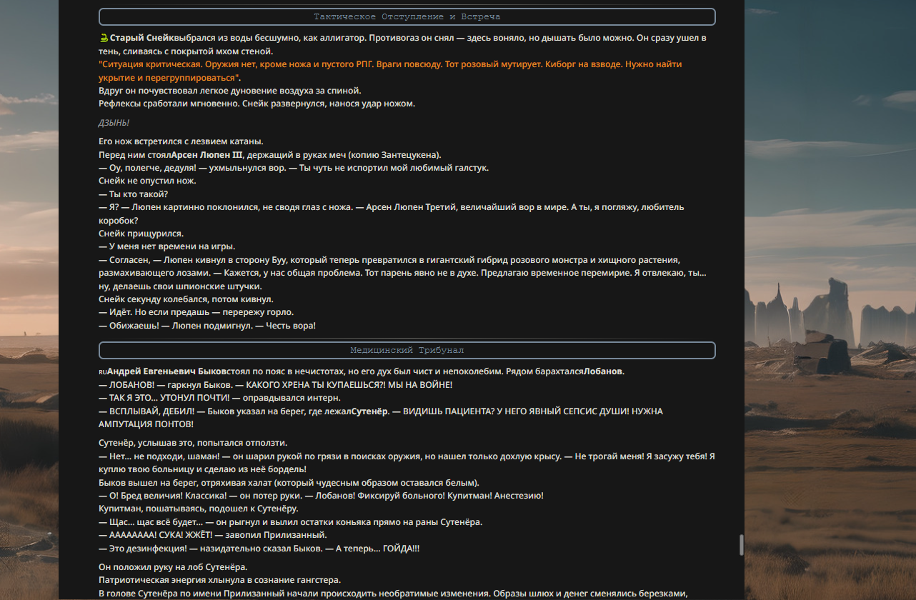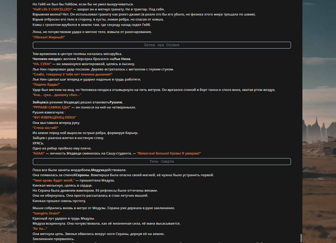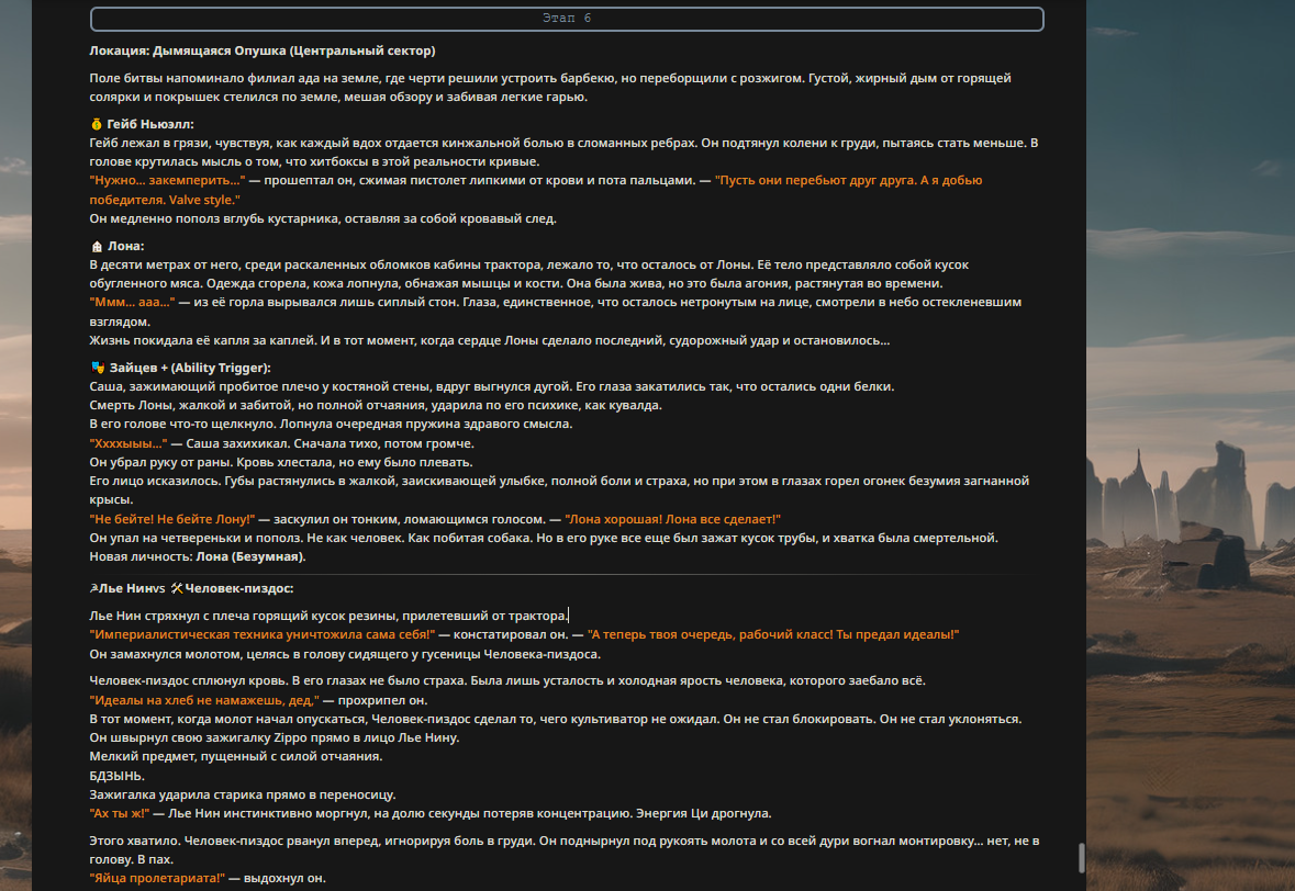 Лье Нин вернулся на пик своей горы. Он понял ошибку. Нельзя культивировать тело. Нужно культивироватьСИСТЕМУ. Он переписал законы Дао. "Небесный Император — монополист!" — заявил он. — "Небеса — народу!" Он создал технику "Коммунизм Духовной Энергии". Вся Ци в мире распределилась поровну. Великие мастера мгновенно ослабли. Простые крестьяне мгновенно стали мастерами средней руки. Мир погрузился в хаос равенства. Драконы пахали поля. Бессмертные стояли в очереди за пилюлями по талонам. Лье Нин сидел на облаке и улыбался. "Вот теперь — заебись. Текстуры ровные."