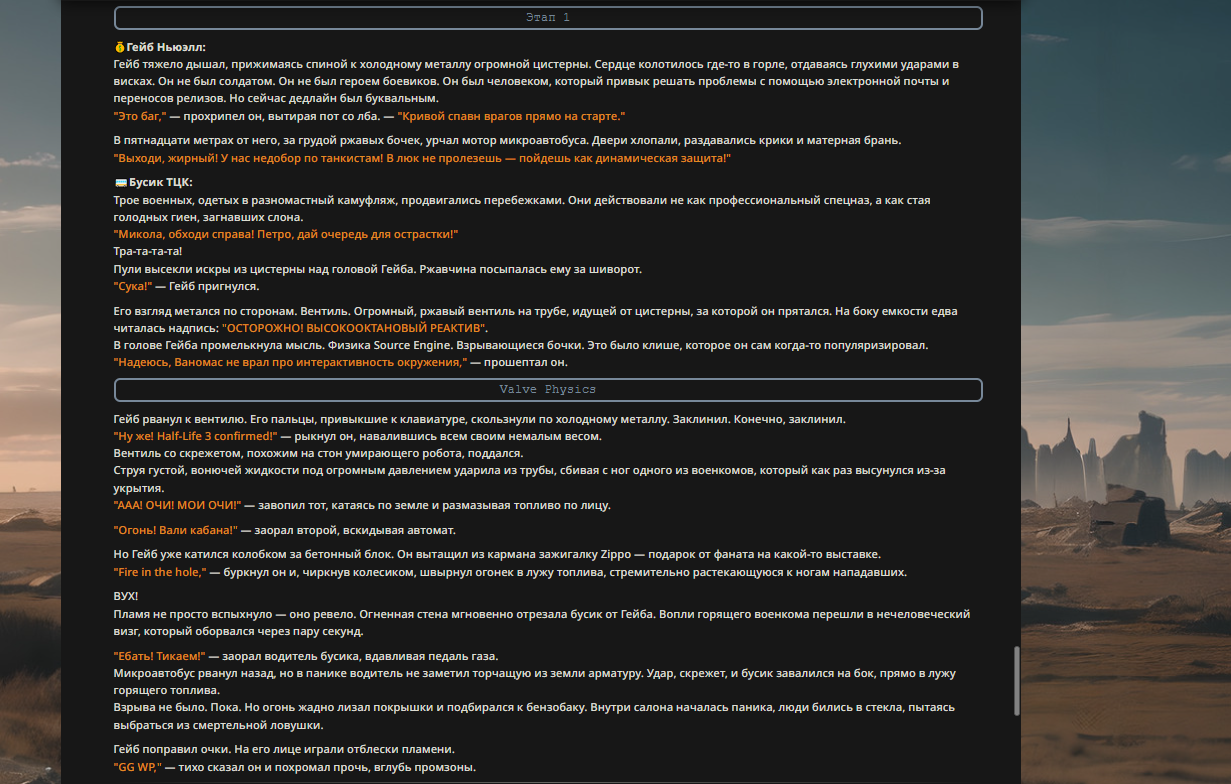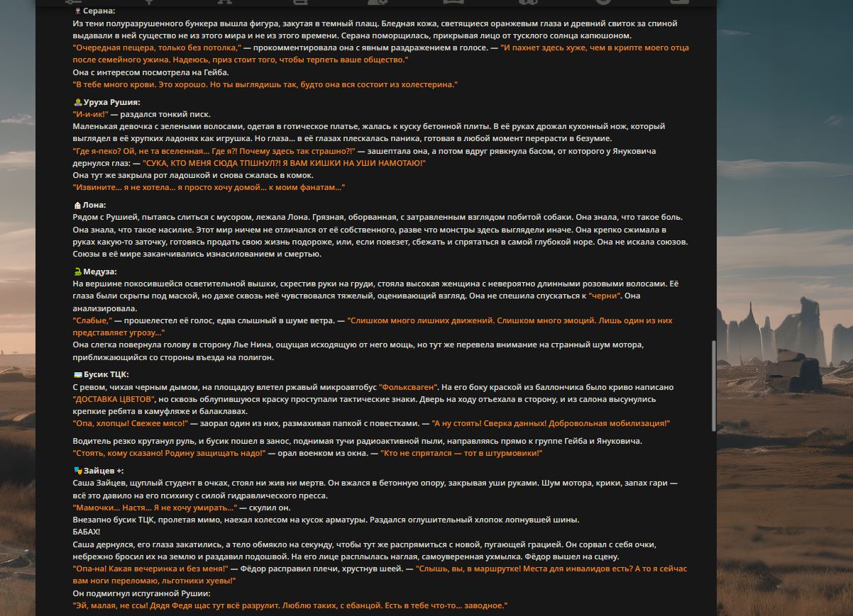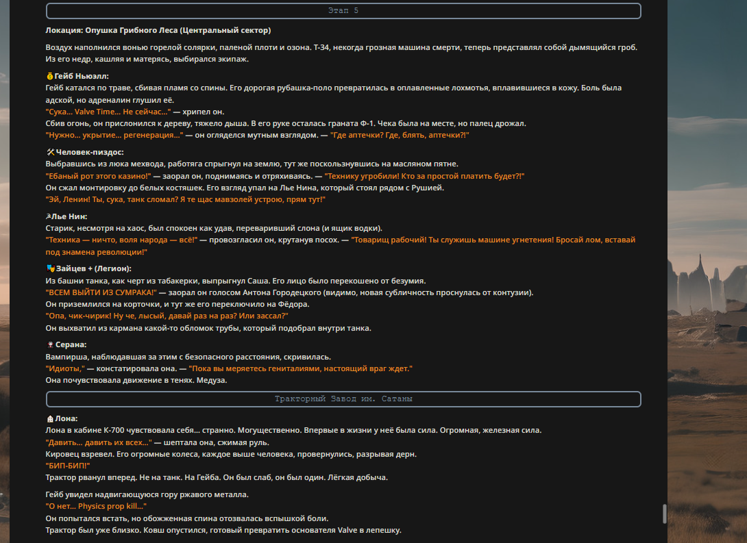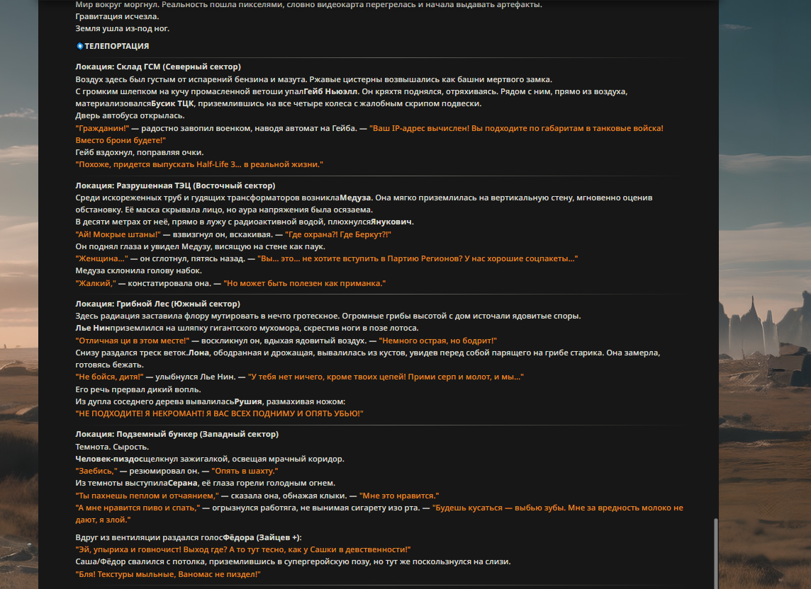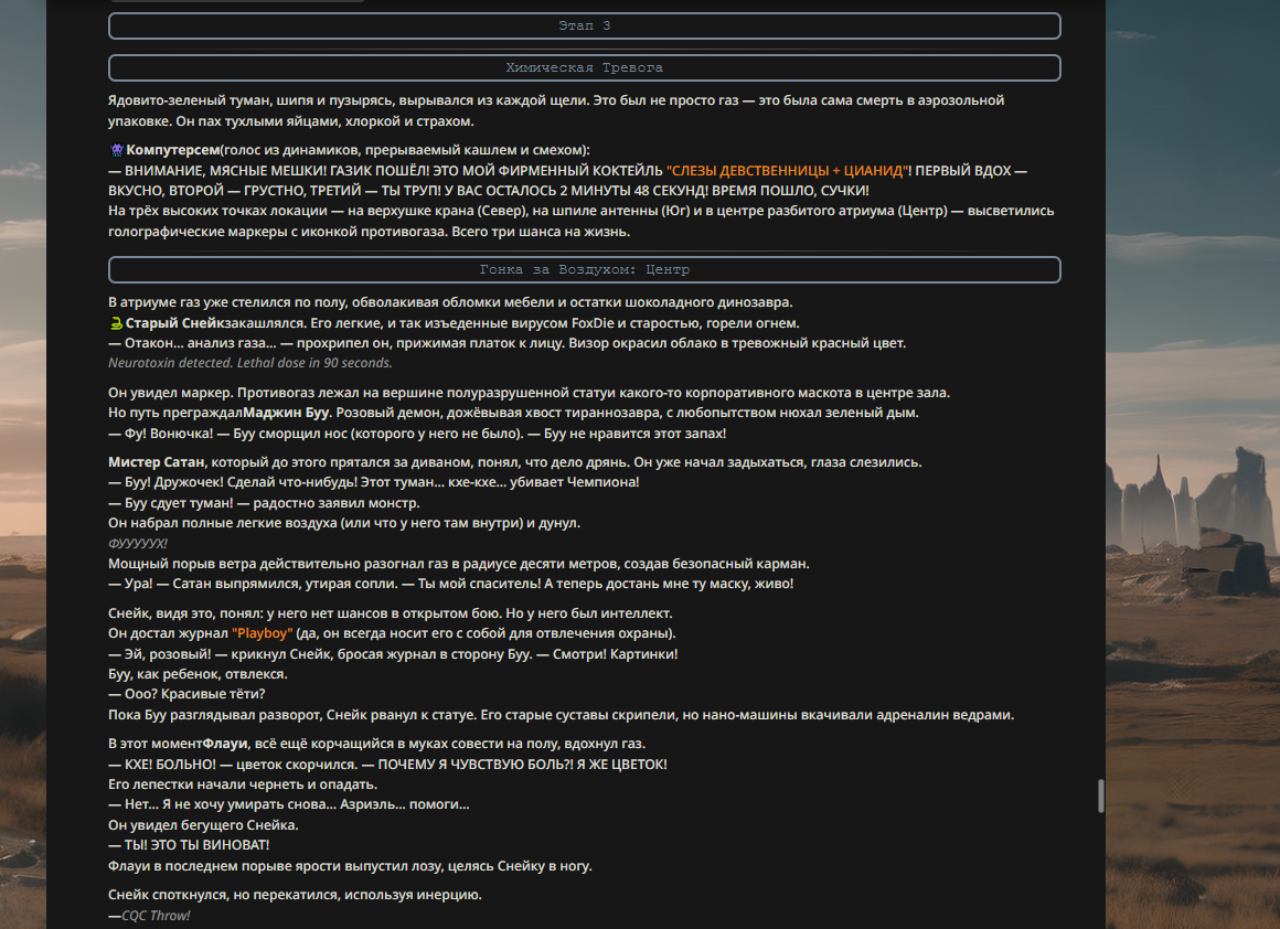 Крыши начали вибрировать. Из вентиляционных шахт повалил густой, ядовито-зеленый газ. — ЭТО НЕЙРОТОКСИН, УБЛЮДКИ! — радостно сообщил Компутерсем. — КТО НЕ СПРЯТАЛСЯ — ТОТ СДОХ! У ВАС 3 МИНУТЫ, ЧТОБЫ НАЙТИ ПРОТИВОГАЗЫ ИЛИ СДОХНУТЬ В МУКАХ! А ПРОТИВОГАЗОВ… — он мерзко захихикал. — ВСЕГО ТРИ! ИЩИТЕ, СУЧКИ!