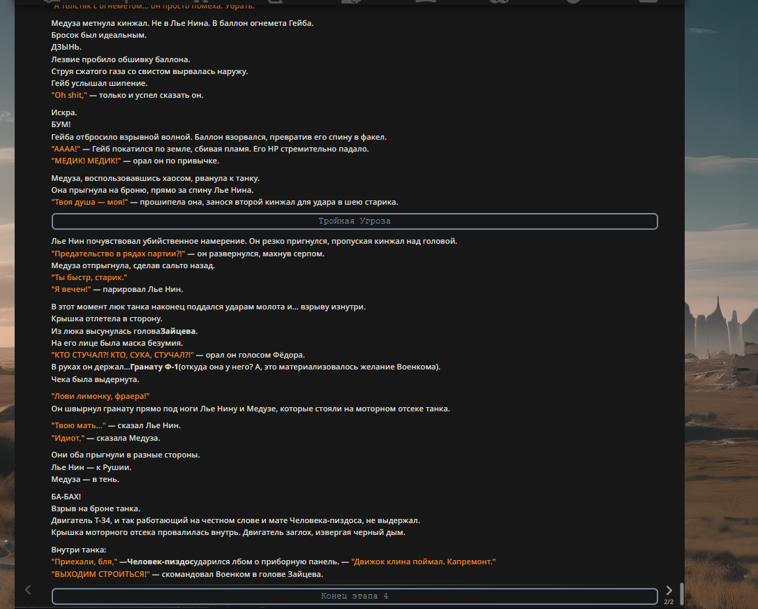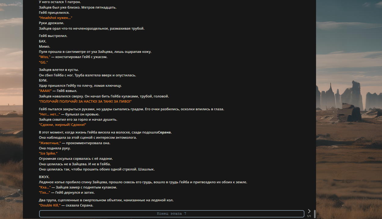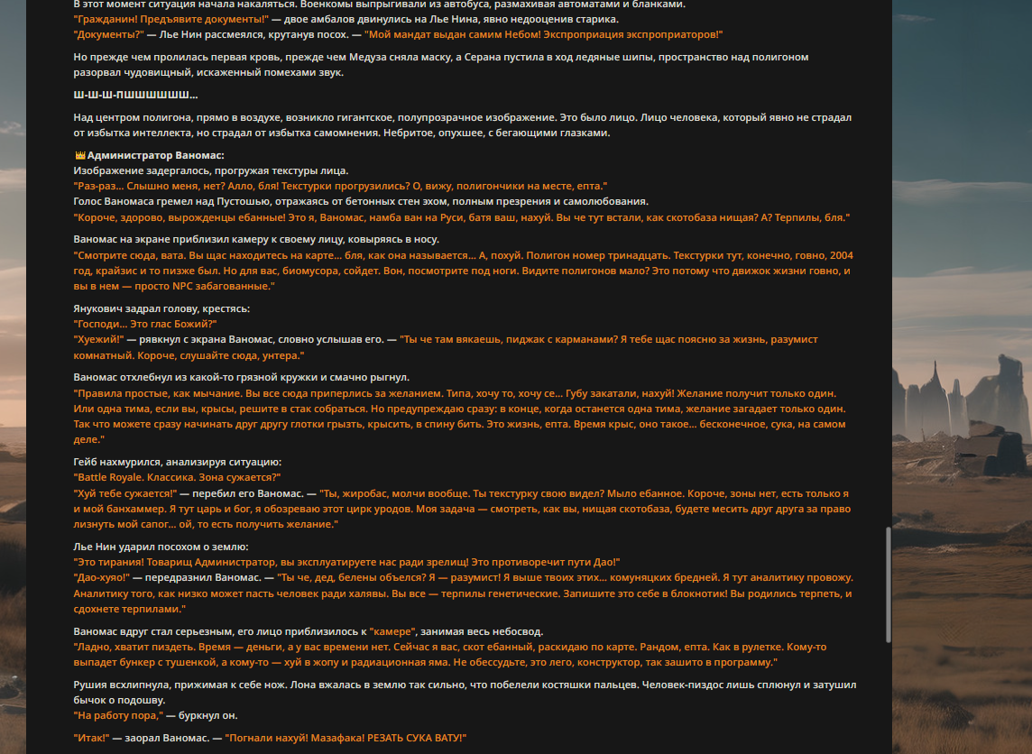 "Ну че, обсосы! Второй раунд закончен!" Вижу, кто-то уже отъехал, земля ему стекловатой. Кто-то залутался. А кто-то, как этот жиробас, все еще крысит. Короче, слушайте сюда. Сейчас будет ивент. Я называю его 'Дождь из говна'. С неба начнут падать припасы. Но не просто так, а с сюрпризом. В каждом ящике — либо пушка, либо бомба. Рандом, епта! Проверяйте удачу, неудачники!""
