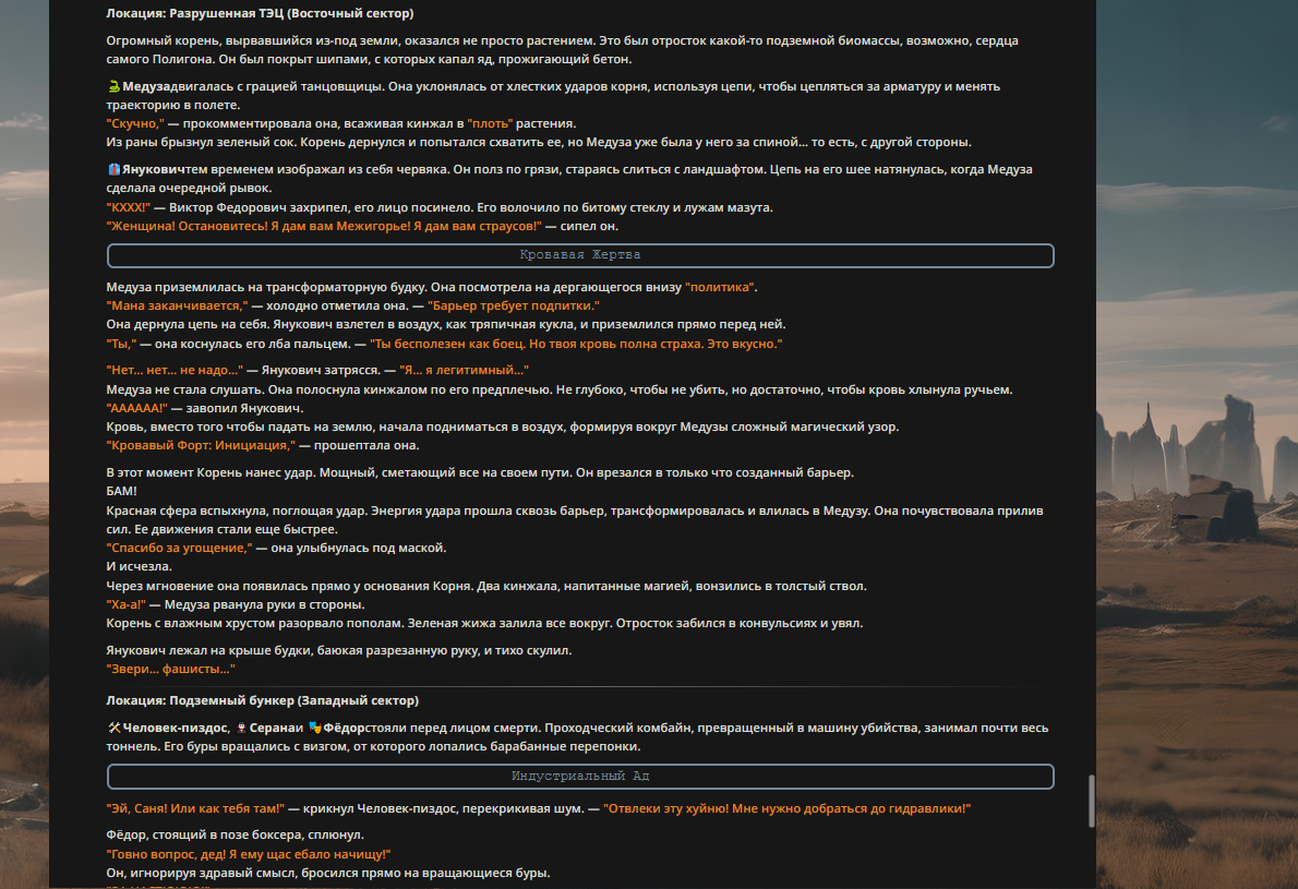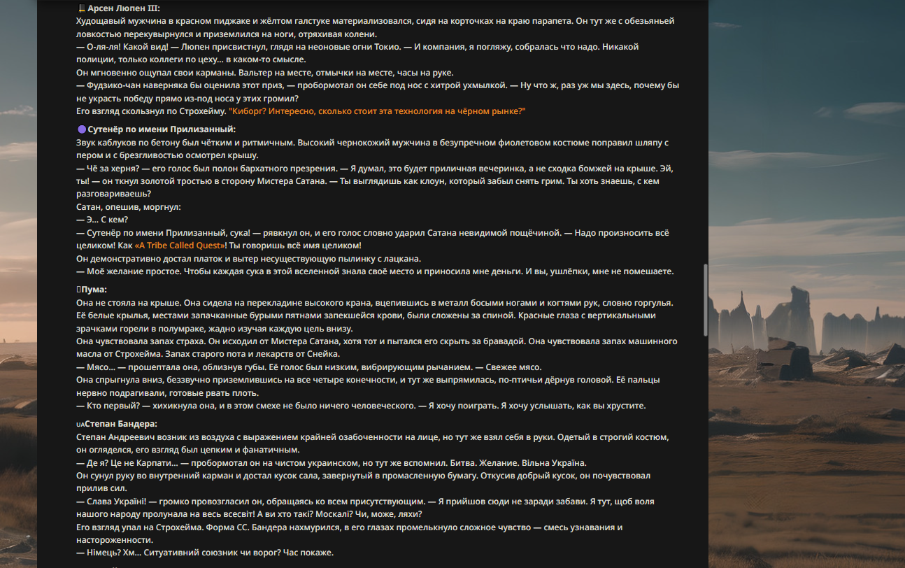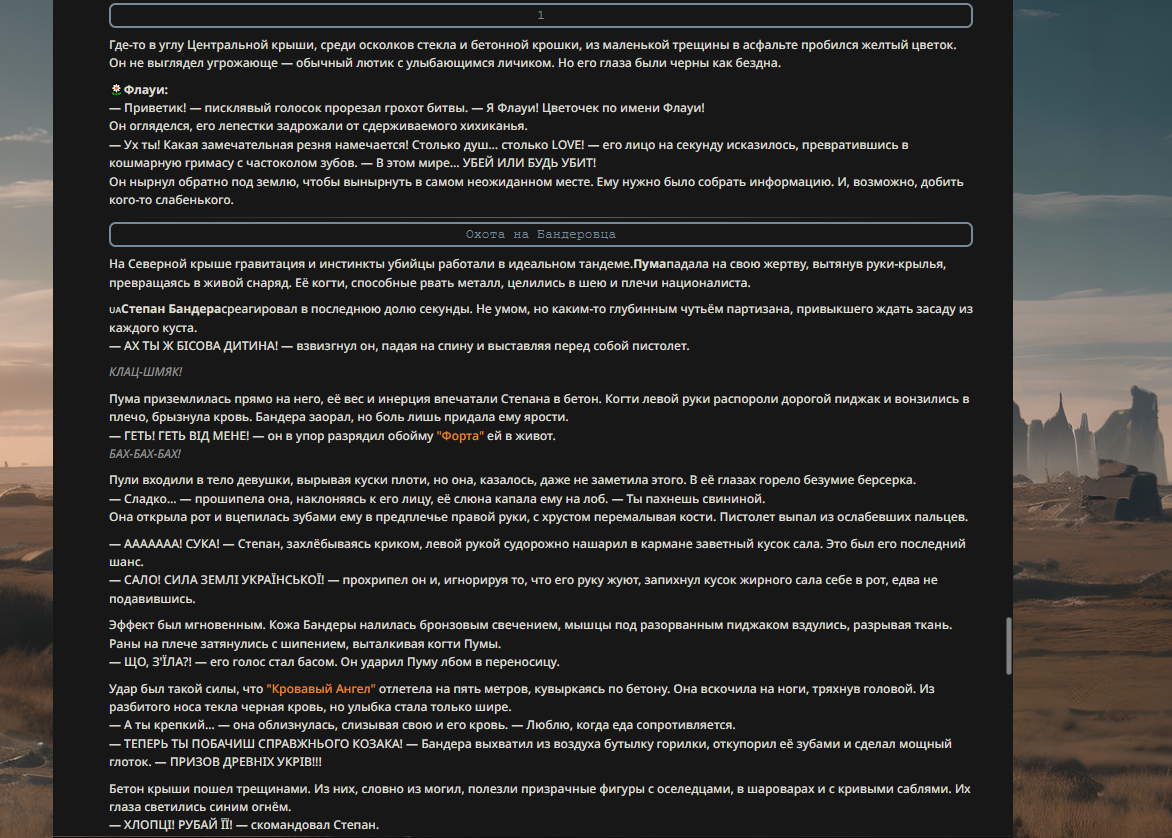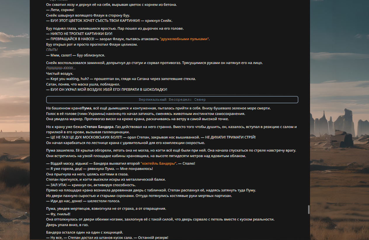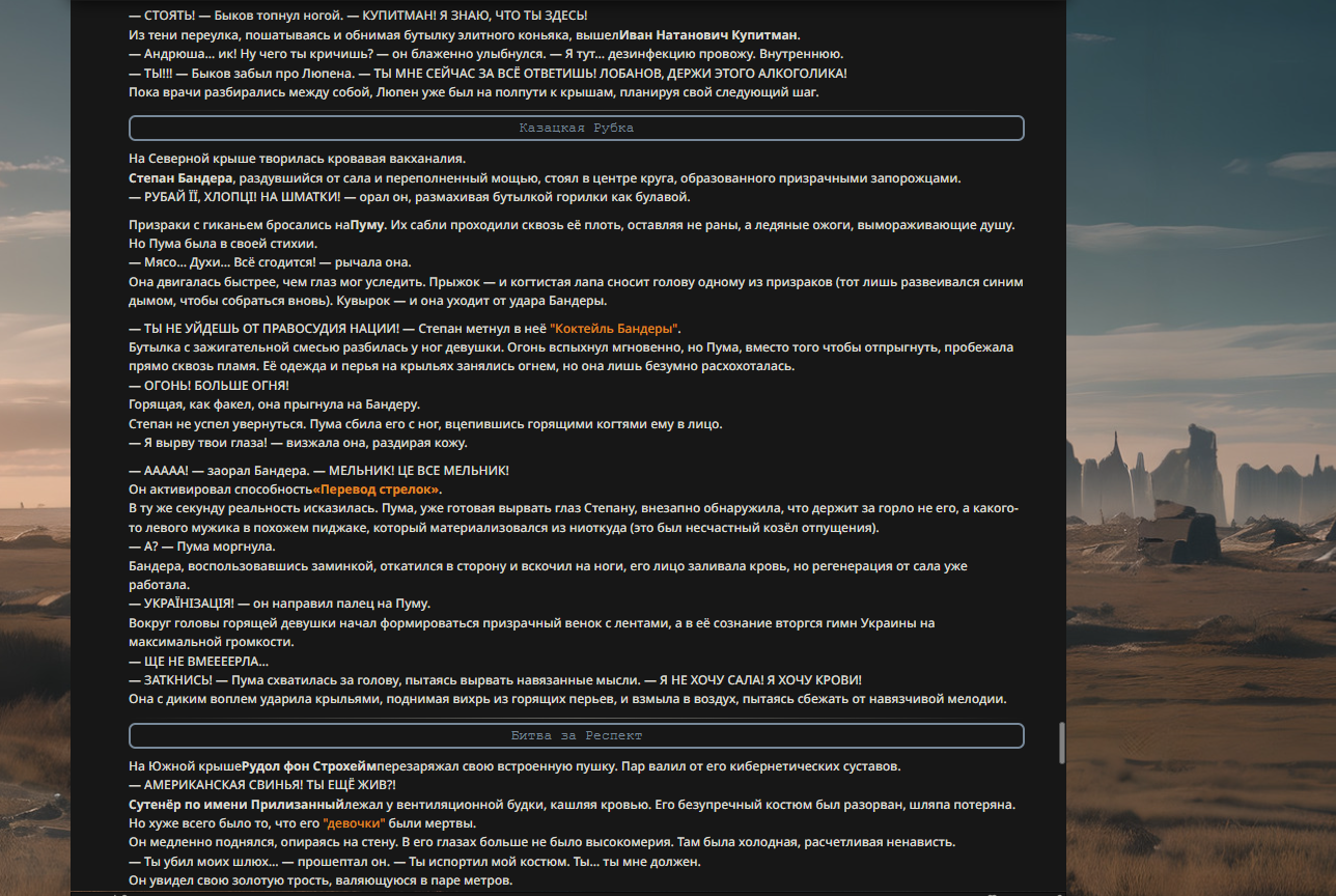 Когда зрение вернулось,Пумаобнаружила себя на стреле башенного крана, раскачивающейся на ветру. Под ней, в пятидесяти метрах внизу, простиралась бетонная поверхность крыши, уставленная контейнерами. Идеально. Её охотничьи угодья. Но она была не одна. Внизу, прямо под ней, материализовалсяСтепан Бандера. Он ошалело крутил головой, сжимая в одной руке пистолет, а в другой — бутылку с мутной жидкостью. — Де я? — крикнул он. — Гей, хто тут є? Слава Україні! Пума улыбнулась, обнажая острые, как бритва, зубы. Её крылья бесшумно раскрылись. — Слава… ужину, — прошептала она и камнем рухнула вниз, целясь когтями в плечи националиста.