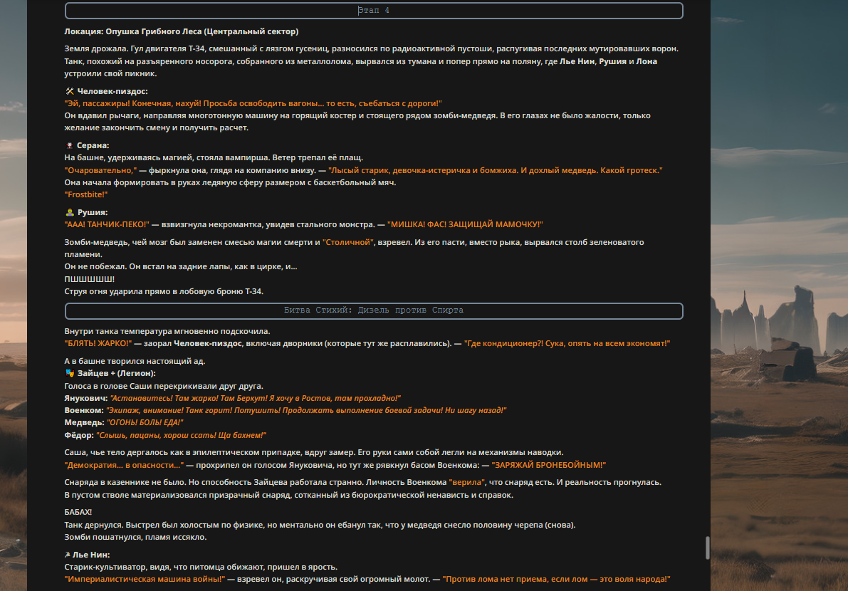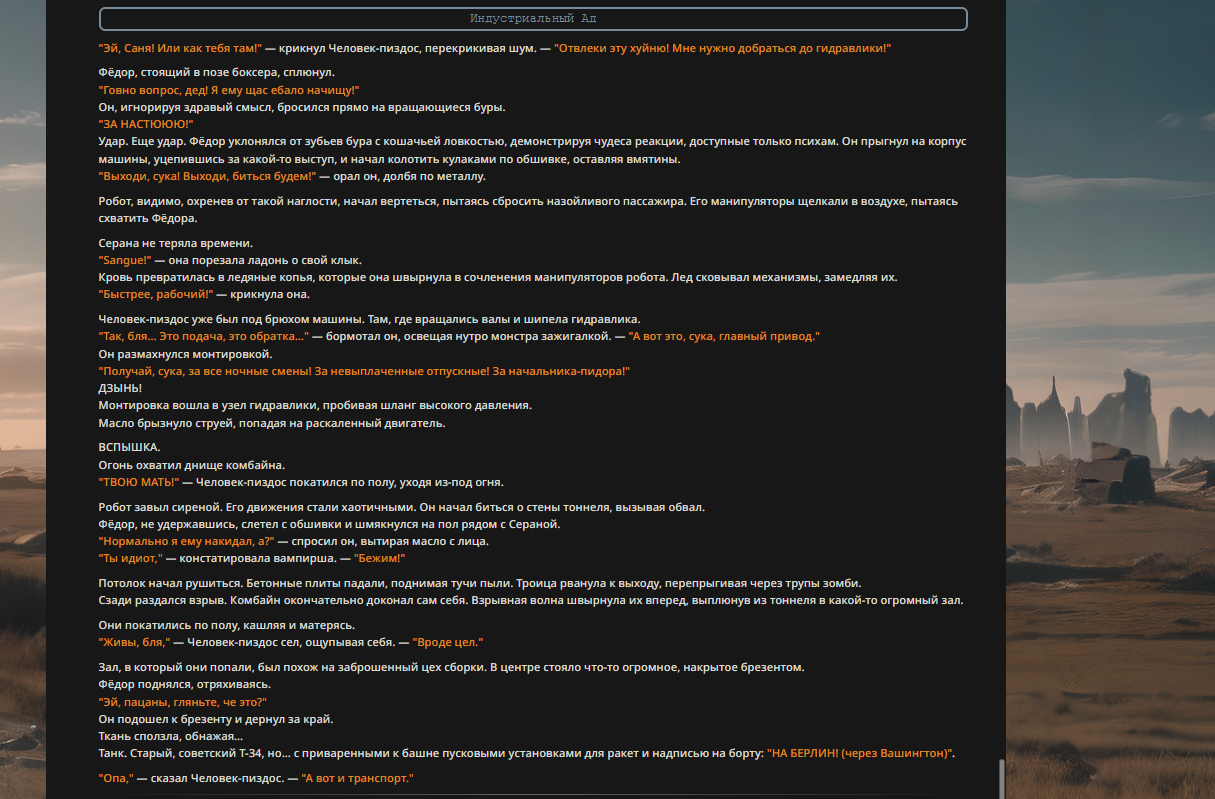 "Блядь, это цирк," — резюмировал Человек-пиздос. — "Серана! Заморозь этого долбоеба, пока он нам боеукладку не взорвал!"