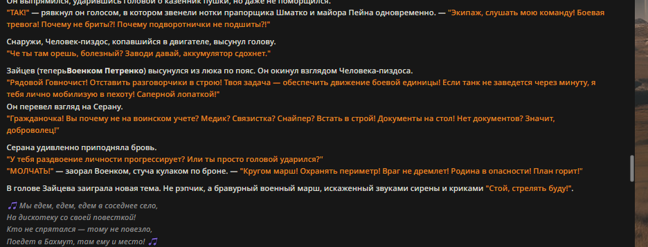А личность Военкома пыталась вручить повестку Серане, которая сидела на броне снаружи (через триплекс). "Гражданочка! У вас просрочка по учету! Вампиры тоже военнообязанные! В ночной дозор пойдете!"