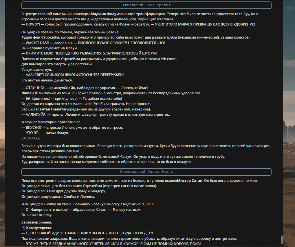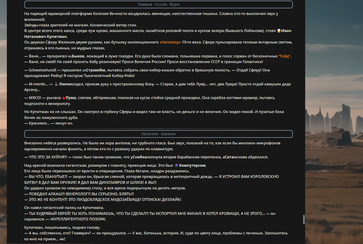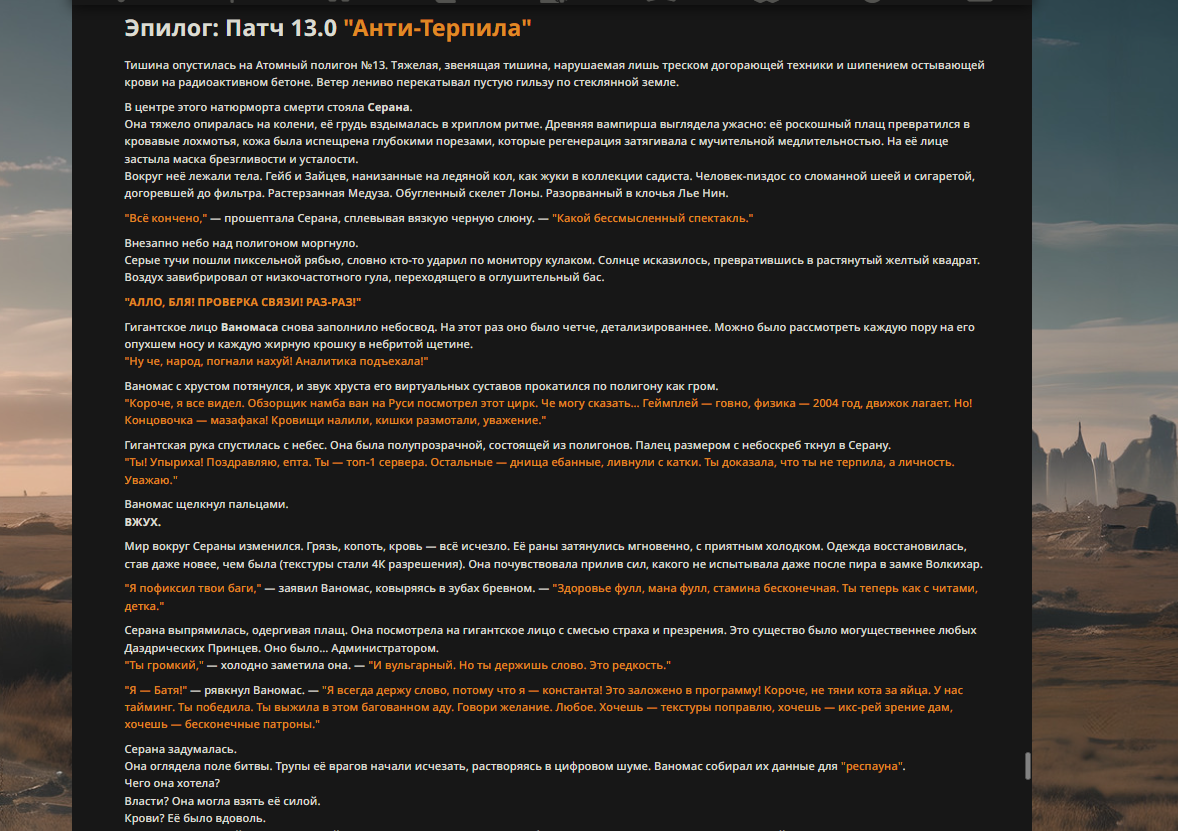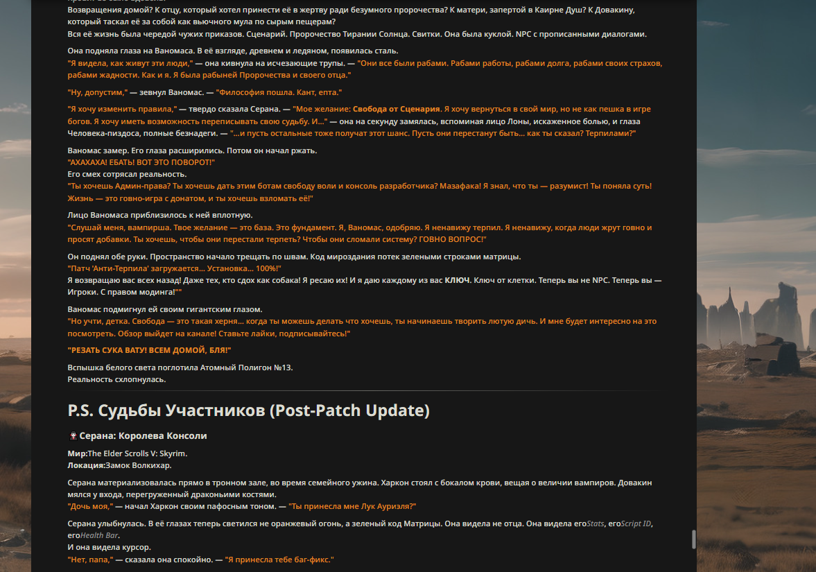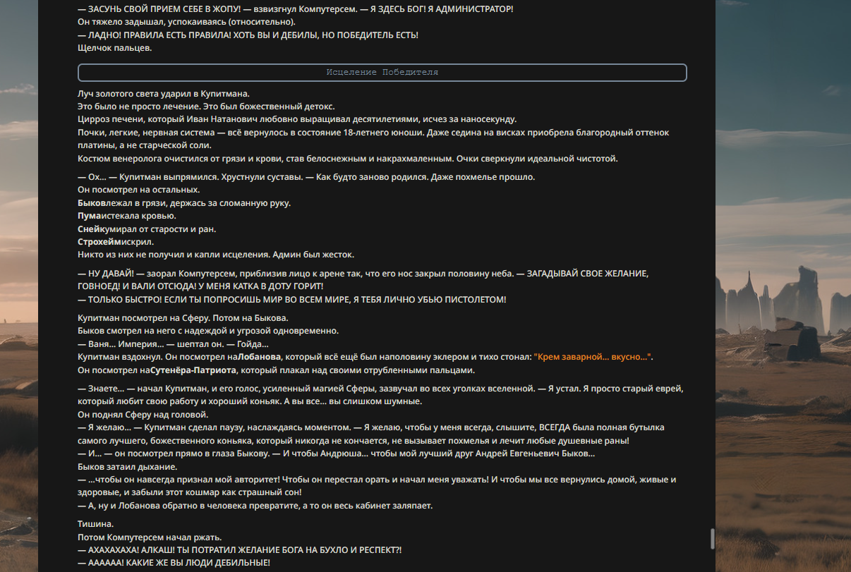 Эпилог Эпилога Ваномас сидел в своем кресле в Небесной Студии. Перед ним было множество мониторов, показывающих разные миры. Он отхлебнул "Охоту Крепкое". "Ну вот. Нормально разрулил. Графон подтянул, сюжет поправил. Терпил стало меньше, суеты больше." Ставьте лайки, подписывайтесь на канал. С вами был Ваномас. Мазафака. Пока.""