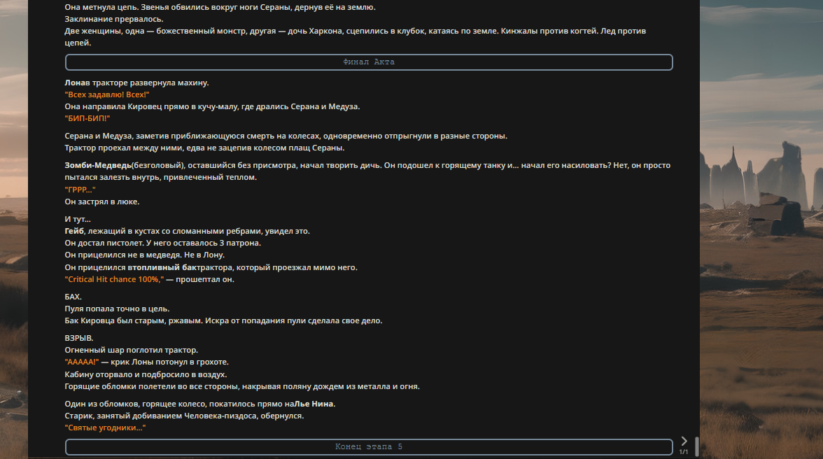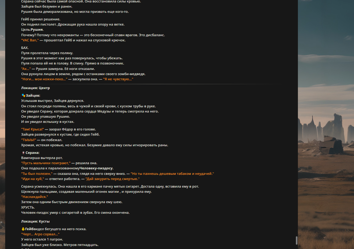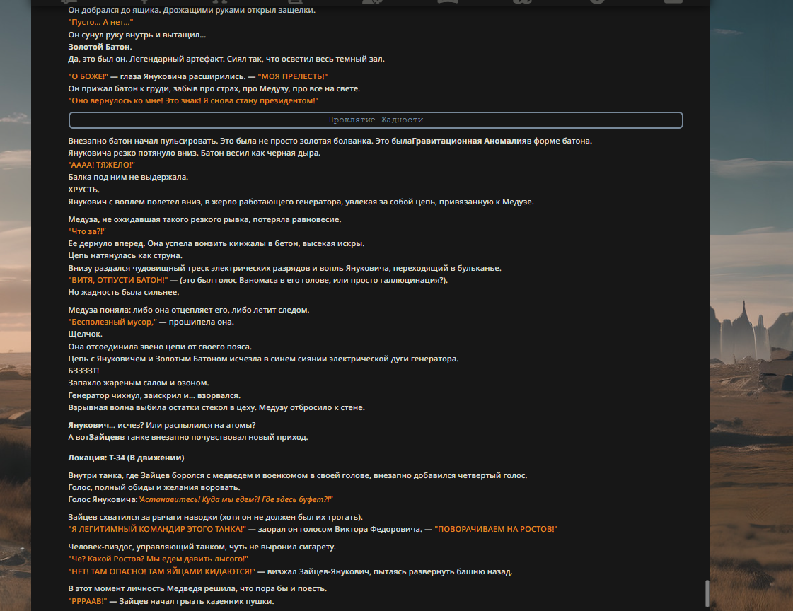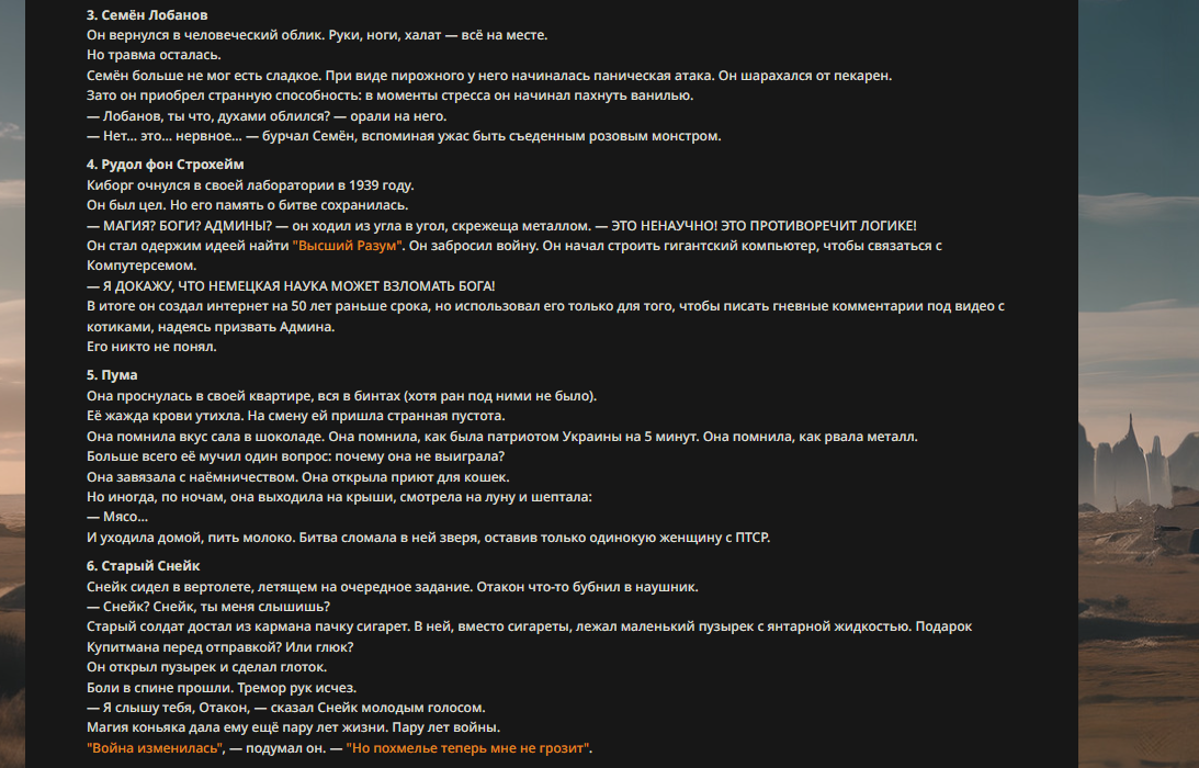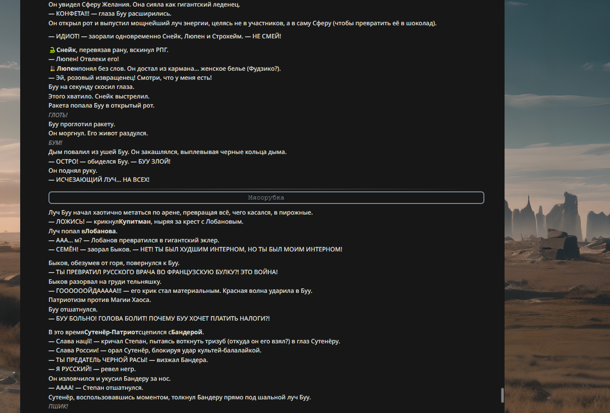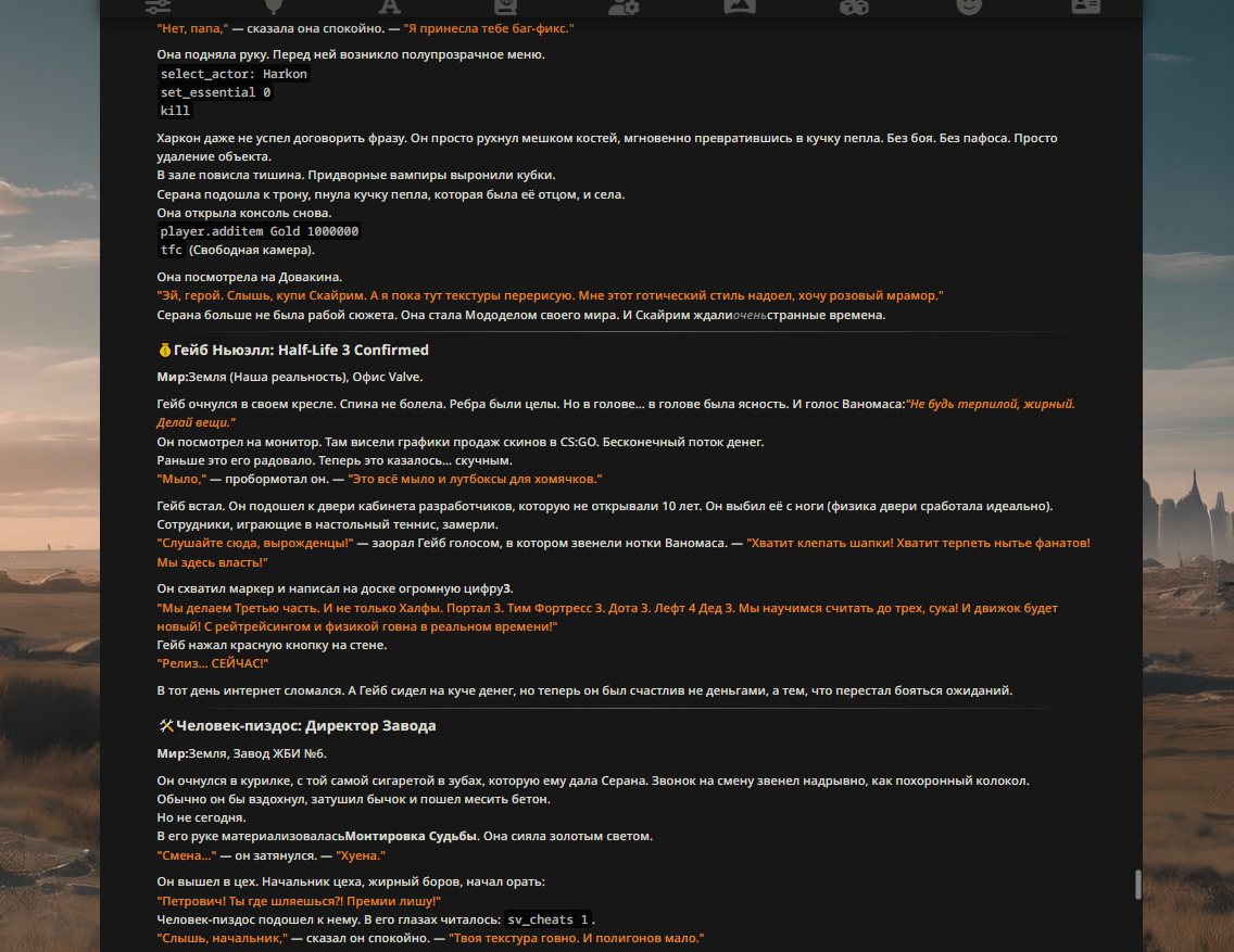 Эпилог Эпилога Ваномас сидел в своем кресле в Небесной Студии. Перед ним было множество мониторов, показывающих разные миры. Он отхлебнул "Охоту Крепкое". "Ну вот. Нормально разрулил. Графон подтянул, сюжет поправил. Терпил стало меньше, суеты больше." Ставьте лайки, подписывайтесь на канал. С вами был Ваномас. Мазафака. Пока.""
