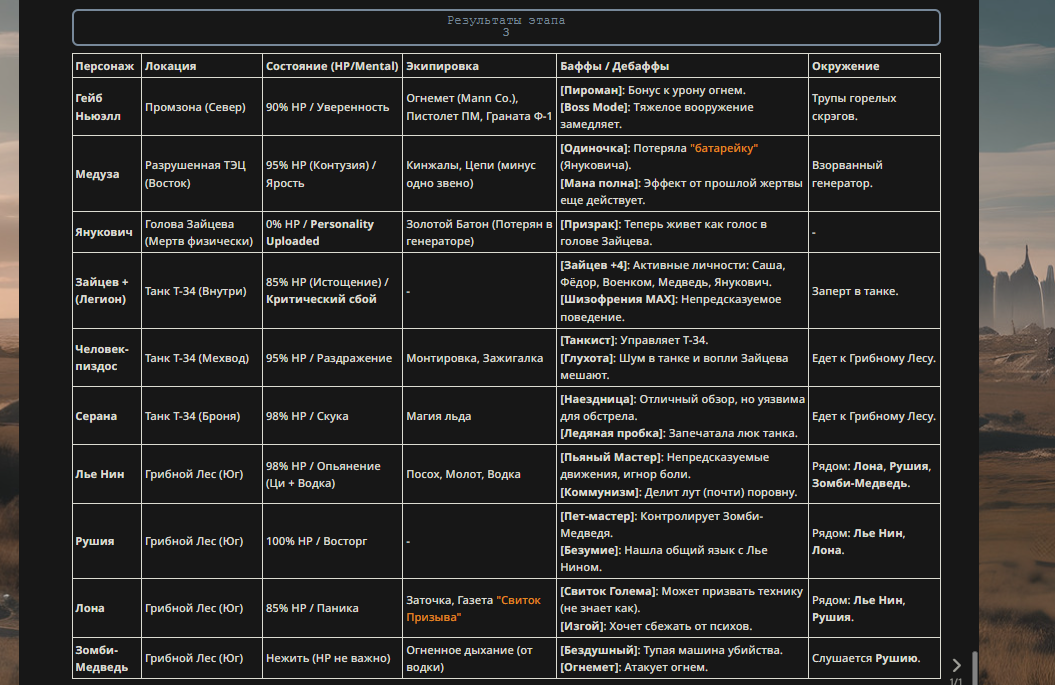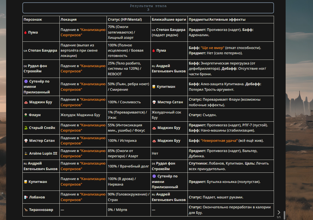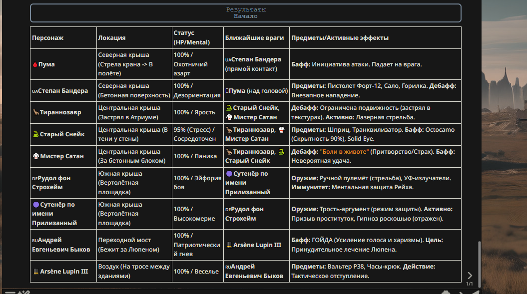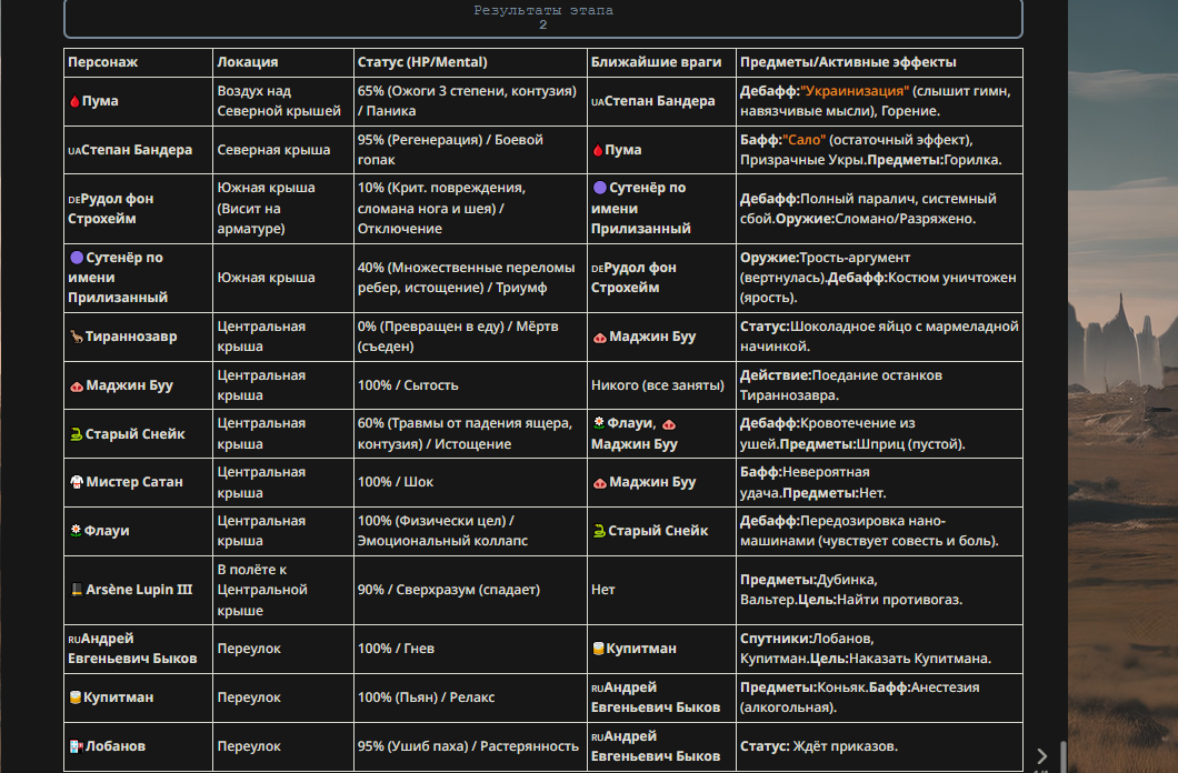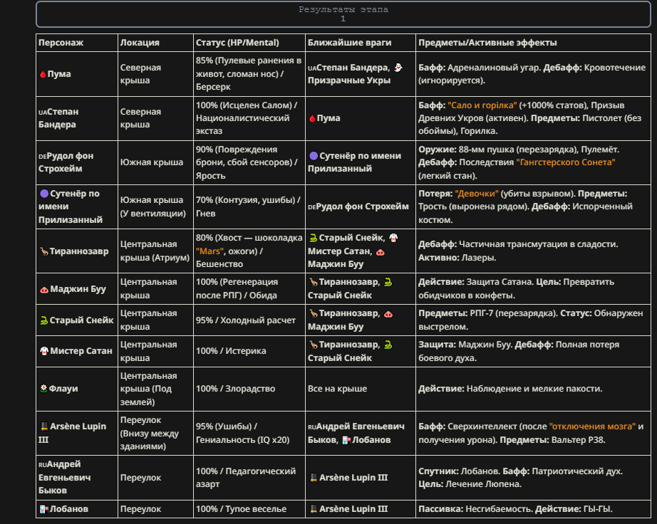 Сцена на крышах изменилась. Строхеймвыведен из строя, висит на краю гибели. Сутенёртяжело ранен, но победил в дуэли. Бандерасражается с горящейПумой, которая сходит с ума от украинских гимнов. Динозаврпревращен в еду. Буужрёт динозавра. Сатанжив и невредим (спасибо удаче). Снейкнейтрализовал Флауи, но сам едва стоит на ногах. Люпенсбежал от врачей-патриотов и направляется к центру событий.