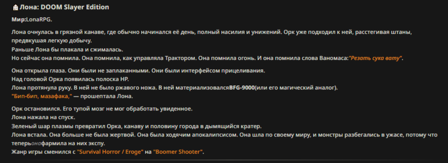 >>327067567 Опять Флауи нету! Но я не виню тебя, анонче, видимо, не любит его нейронка. Ладненько, пойду-ка я спатки, а то на РАБотку скоро… Если перс вновь всплывёт, дочитаю завтра. Спасибо за игру.