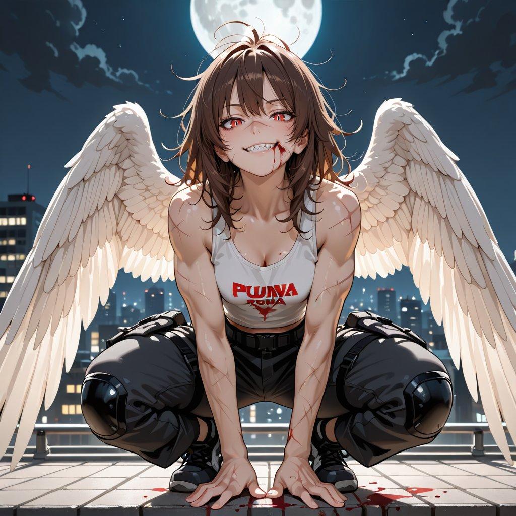 Внешность: Атлетичного телосложения девушка ростом около 172 см. Каштановые волосы средней длины, часто взъерошенные и спутанные, словно она только что вышла из драки. Красные глаза с вертикальными зрачками, напоминающими кошачьи, — результат экспериментальной операции для улучшения ночного зрения. Белые крылья, некогда символизировавшие защиту, теперь часто запятнаны кровью. Множество шрамов на руках и торсе — следы безрассудных схваток. Предпочитает практичную одежду: майки, тактические штаны, берцы. Никаких украшений — только то, что не мешает в бою.