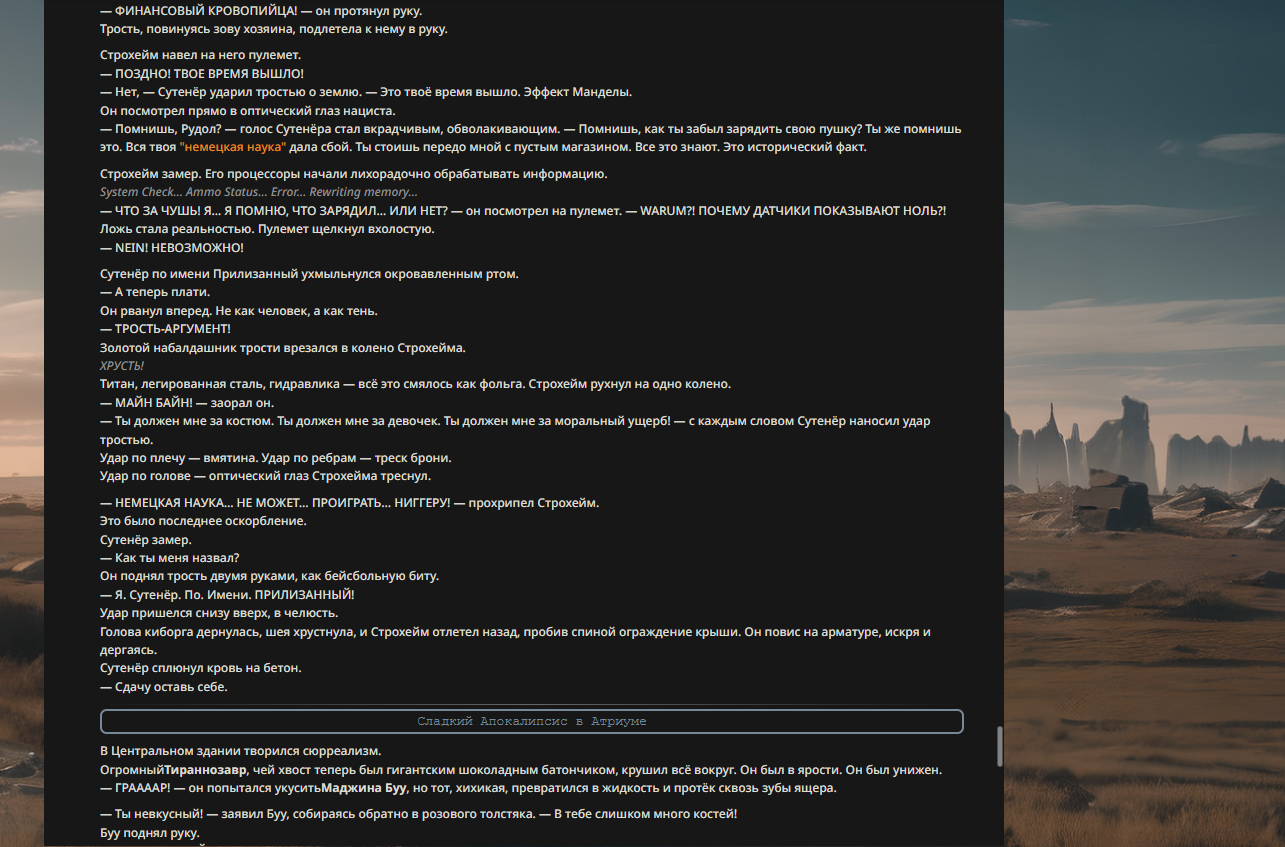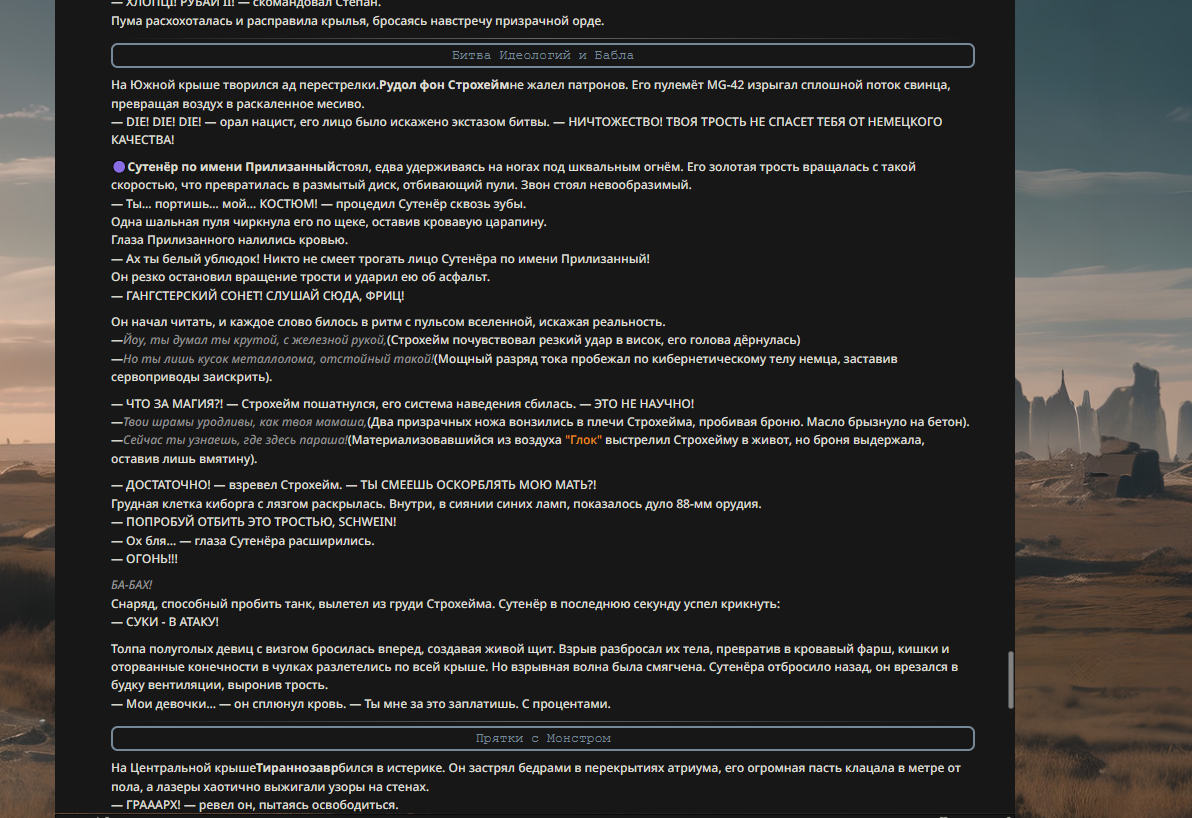 Рудол фон Строхеймприземлился жестко, оставив вмятины в асфальте своими металлическими ногами. — ОТЛИЧНО! — рявкнул он. — ПРОСТОР ДЛЯ МАНЁВРА! Прямо перед ним, в десяти метрах, стоялСутенёр по имени Прилизанный, отряхивая свой фиолетовый пиджак. — Эй, железный дровосек! — крикнул Сутенёр. — Ты чуть не наступил на мой ботинок. Ты знаешь, сколько стоит кожа крокодила-альбиноса? Строхейм повернулся к нему, его механический глаз зажужжал, анализируя цель. — АМЕРИКАНСКИЙ ДЕГЕНЕРАТ! — констатировал нацист. — ТВОЯ ОДЕЖДА ТАК ЖЕ НЕЛЕПА, КАК И ТВОЯ ПОПЫТКА БРОСИТЬ МНЕ ВЫЗОВ! НЕМЕЦКАЯ НАУКА НЕ ТЕРПИТ КЛОУНОВ! Он направил руку-пулемёт на сутенёра. Сутенёр по имени Прилизанный медленно поднял свою золотую трость. Его лицо стало серьёзным, вся игривость исчезла. — Ты назвал меня клоуном? — его голос стал холодным, как лёд. — И ты не назвал моё полное имя. Это большая ошибка, нацистская сучка. Девочки! Из воздуха вокруг Сутенёра начали появляться проститутки, но на этот раз они выглядели злее. — ГИПНОЗ РОСКОШЬЮ! — крикнул он, и бриллианты на его кольцах вспыхнули ослепительным светом, пытаясь затуманить разум киборга. Но Строхейм лишь рассмеялся: — МОЙ МОЗГ ЗАЩИЩЁН ЛУЧШИМИ ИНЖЕНЕРАМИ РЕЙХА! УМРИ! Пулемёт зарокотал, выплёвывая град пуль. Сутенёр начал вращать тростью с невероятной скоростью, создавая щит, от которого пули отскакивали со звоном. Битва началась.