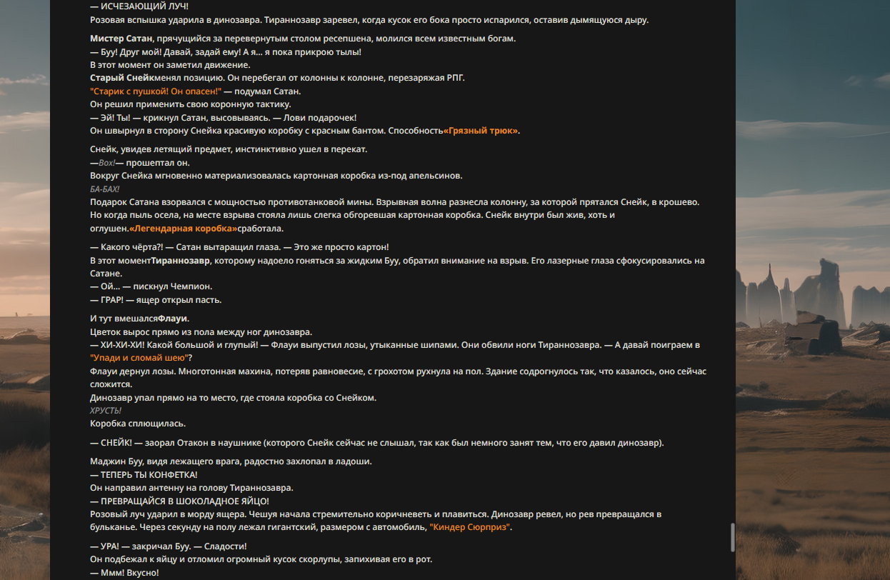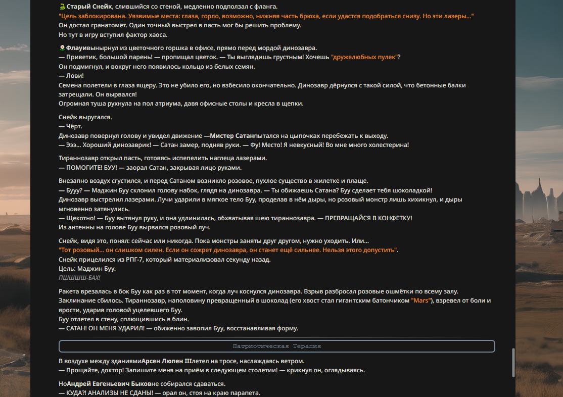 Стеклянный купол атриума разбился вдребезги, когда на него свалилсяТираннозавр. Ящер провалился внутрь здания, застряв в перекрытиях верхнего этажа. Его лазерные глаза беспорядочно стреляли красными лучами, прожигая дыры в офисной мебели и стенах. В соседнем коридоре, за колонной, приземлилсяМистер Сатан. — О боже, о боже, о боже! — шептал он, трясясь всем телом. — Почему я?! Почему именно с монстром?! Вдруг рядом с ним из тени вышелСтарый Снейк. Сатан взвизгнул и попытался ударить его «Динамайт Киком», но поскользнулся на куске стекла и шлёпнулся на задницу. Снейк посмотрел на него своим единственным глазом с выражением глубокой усталости. — Тихо, — прошипел он. — Ты привлечешь его внимание. У тебя есть оружие? — Я… Я Чемпион Мира! Моё тело — оружие! — дрожащим голосом заявил Сатан, но тут же добавил шёпотом: — Но если у тебя есть лишняя пушка, я не откажусь. Снейк вздохнул. — Не мешайся под ногами. Он активировал камуфляж, сливаясь со стеной, и начал медленно подбираться к ревущему динозавру, готовя транквилизатор. Хотя… возьмут ли транквилизаторы такую махину?