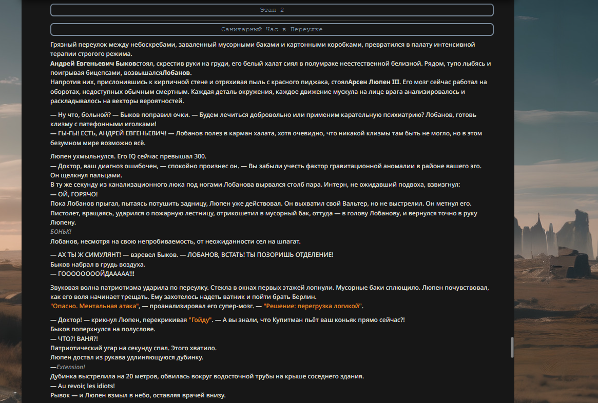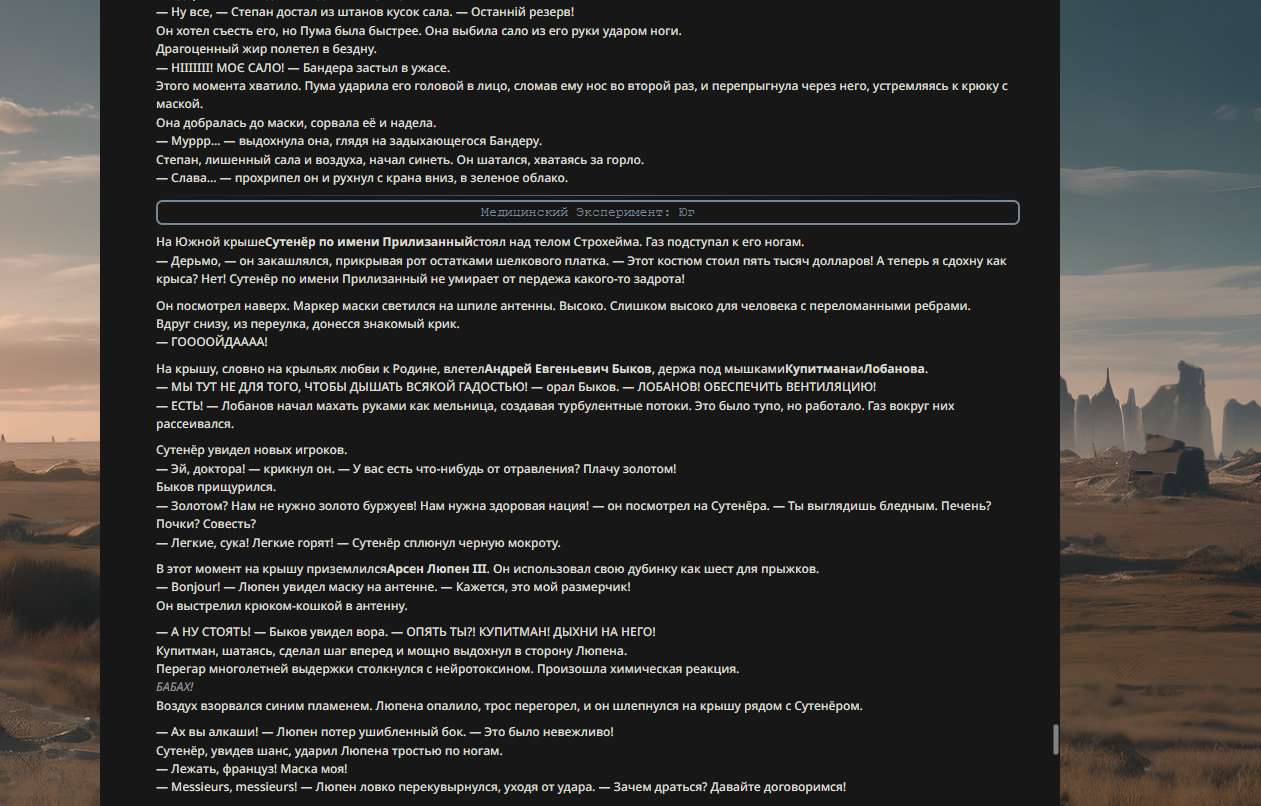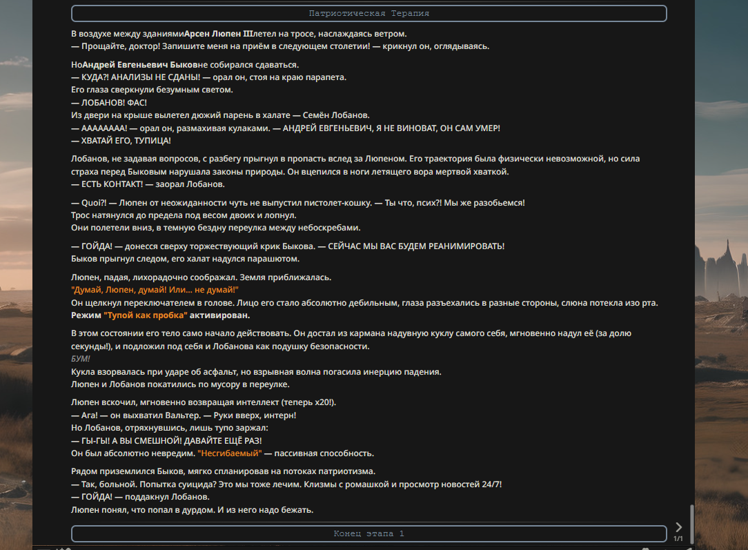 На узком мостике, продуваемом всеми ветрами, оказались двое. Андрей Евгеньевич БыковиАрсен Люпен III. Быков стоял, широко расставив ноги, и смотрел на вора с выражением клинического интереса. — Так, пациент, — начал он, поправляя очки. — Налицо клептомания, нарциссизм и патологическая тяга к яркой одежде. Диагноз ясен. Лечение — трудотерапия на благо Родины! Люпен ухмыльнулся, крутя на пальце свой «Вальтер». — Доктор, боюсь, я неизлечим, — подмигнул он. — И у меня аллергия на патриотизм. Особенно такой громкий. — АЛЛЕРГИЯ?! — взревел Быков. — ЭТО МЫ БЫСТРО ИСПРАВИМ! ГОЙДА!!! От крика Быкова мост затрясся. Люпен почувствовал, как какая-то неведомая сила пытается заставить его встать смирно и начать петь гимн. — Ого! Сильная харизма! — Люпен сделал сальто назад, уходя от звуковой волны. — Но я предпочитаю джаз! Он выстрелил крюком-кошкой в ближайшую стену и полетел прочь, болтаясь на тросе. — СТОЯТЬ! КУДА ПОШЁЛ?! — заорал Быков. — КУПИТМАН! ЛОВИ ЕГО! Но Купитмана пока не было. Быков сплюнул и побежал следом, его халат развевался, а глаза горели фанатичным огнем. — ТЫ ОТ МЕНЯ НЕ УЙДЁШЬ! Я ТЕБЕ ЕЩЁ КЛИЗМУ ДОБРА НЕ ПОСТАВИЛ!
