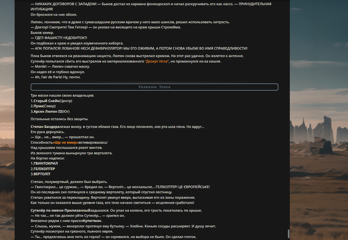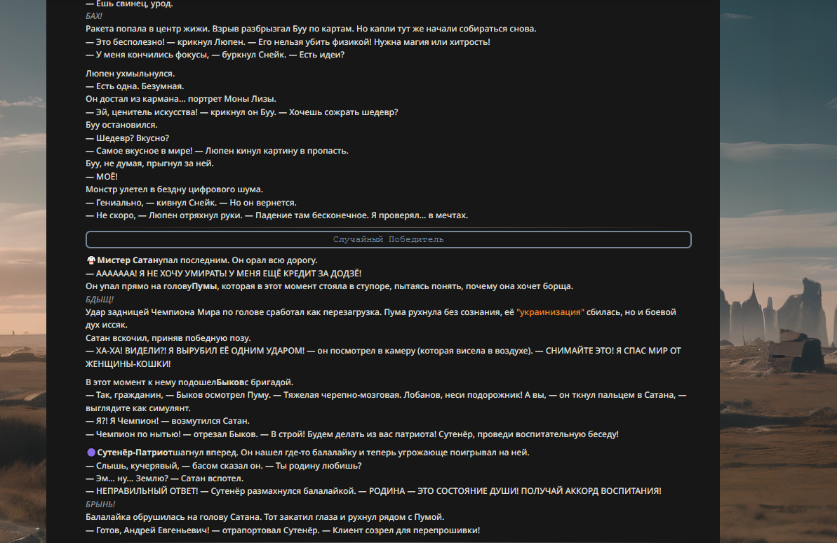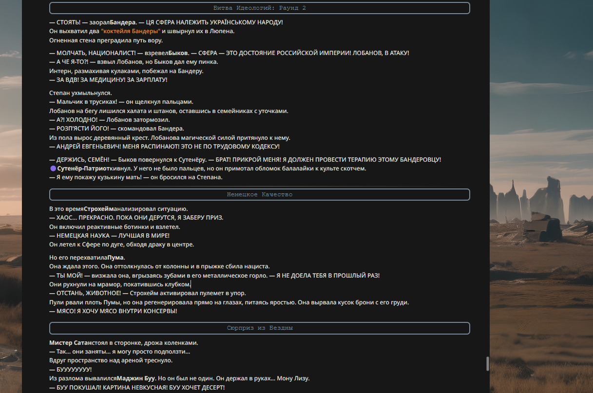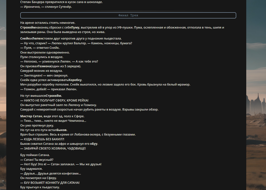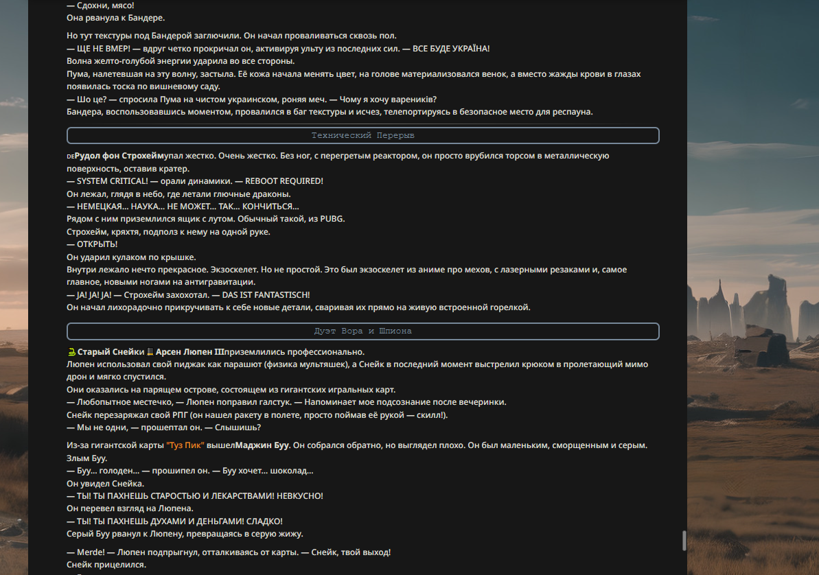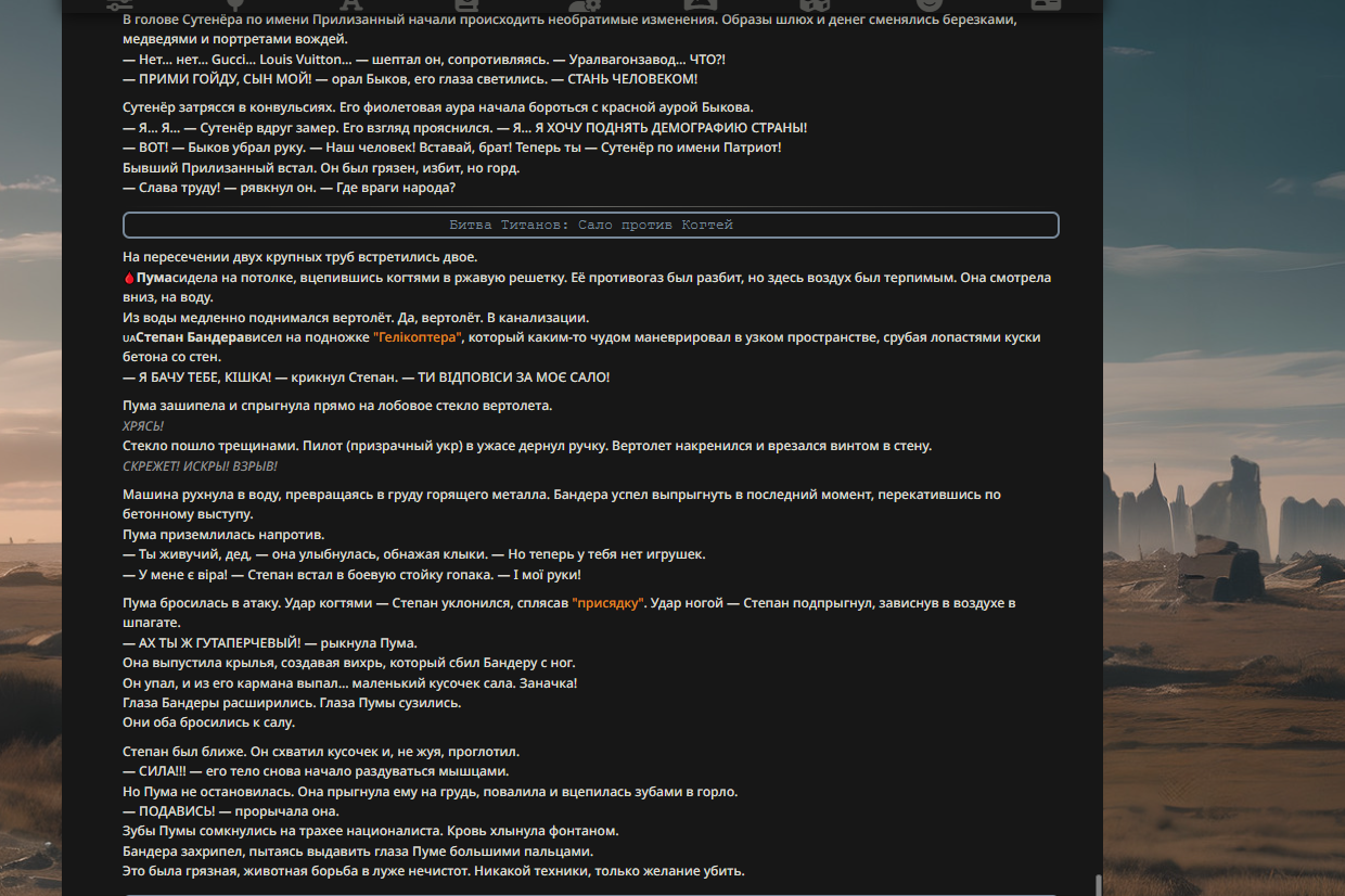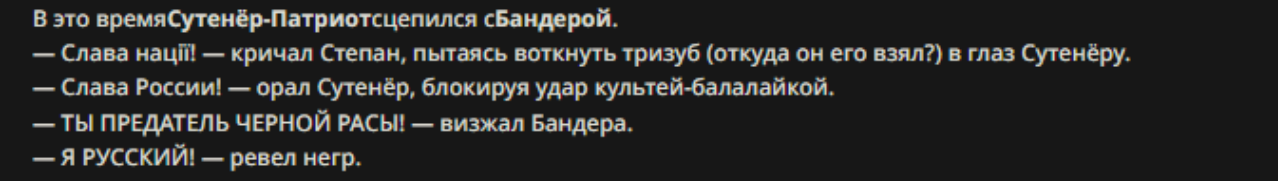 8. Степан Бандера Степан открыл глаза. Он был в схроне. Вокруг — лес, ночь. Он ощупал себя. Живой. Целый. Но во рту стоял стойкий вкус шоколада и сала. — Що це було? — прошептал он. — Пекло? Чи рай? Он попытался крикнуть "Слава Украине!", но вместо этого икнул и сказал: — Слава… Коньяку? Он в ужасе зажал рот рукой. Магия битвы и укус Сутенёра-Патриота оставили на нем след. Степан понял, что его борьба изменилась. Теперь он боролся с желанием выпить и помириться с врагами. Это была самая страшная битва в его жизни.