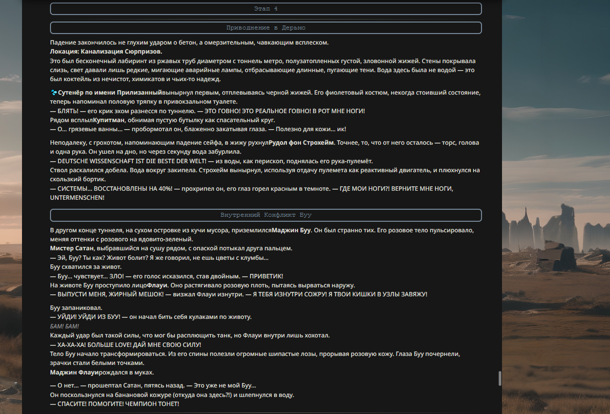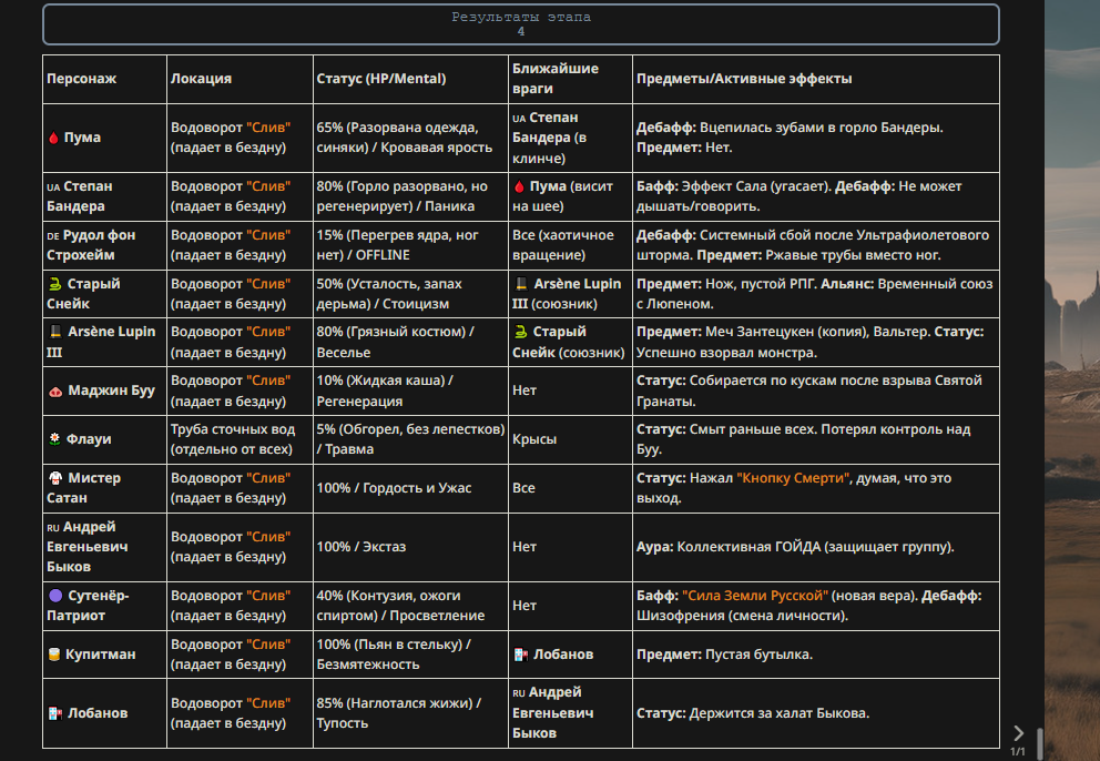 Газовая атака пережита большинством (кто-то с маской, кто-то чудом, кто-то магией). -Флауисъеден Буу (но, возможно, переваривание такого существа будет иметь последствия). -Бандераспасся и полностью исцелен. -Строхеймперезагружается в режиме берсерка. -Люпен,Снейк,Пума— в масках и готовы к финалу. -Быковсформировал странный альянс сСутенёром(через Купитмана). -Сатандержится на соплях и Буу. ГолосКомпутерсемаснова в эфире: — НУ ВЫ И ЖИВУЧИЕ ТВАРИ! Я РАЗОЧАРОВАН! ГДЕ ГОРЫ ТРУПОВ?! ГДЕ КИШКИ НА ПРОВОДАХ?! — ЛАДНО. ВРЕМЯ МЕНЯТЬ ЛОКАЦИЮ. ВЫ ДУМАЛИ ЭТО ВСЁ? ХА! — ДОБРО ПОЖАЛОВАТЬ НА УРОВЕНЬ 2:"КАНАЛИЗАЦИЯ СЮРПРИЗОВ"! ПОЛЕТЕЛИ ВНИЗ, ГОВНЮКИ!