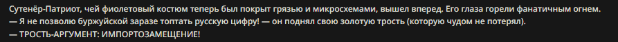 10. Сутенёр-Патриот (бывший Прилизанный) Он вернулся на улицы своего города. Но фиолетовый костюм исчез. Теперь он носил строгий костюм депутата с триколором на лацкане. Его пальцы не отросли, но он заказал себе протезы из чистого золота в форме куполов. Он больше не продавал женщин. Он открыл фонд "Патриотическое воспитание молодежи". — Слышь, йоу! — говорил он с трибуны. — Люби Родину, мать твою! Иначе я приду к тебе с балалайкой! Его рейтинг рос. Он нашел себя. Он стал самым честным и безумным политиком в истории. И он все еще помнил вкус пальцев венеролога (метафорически).