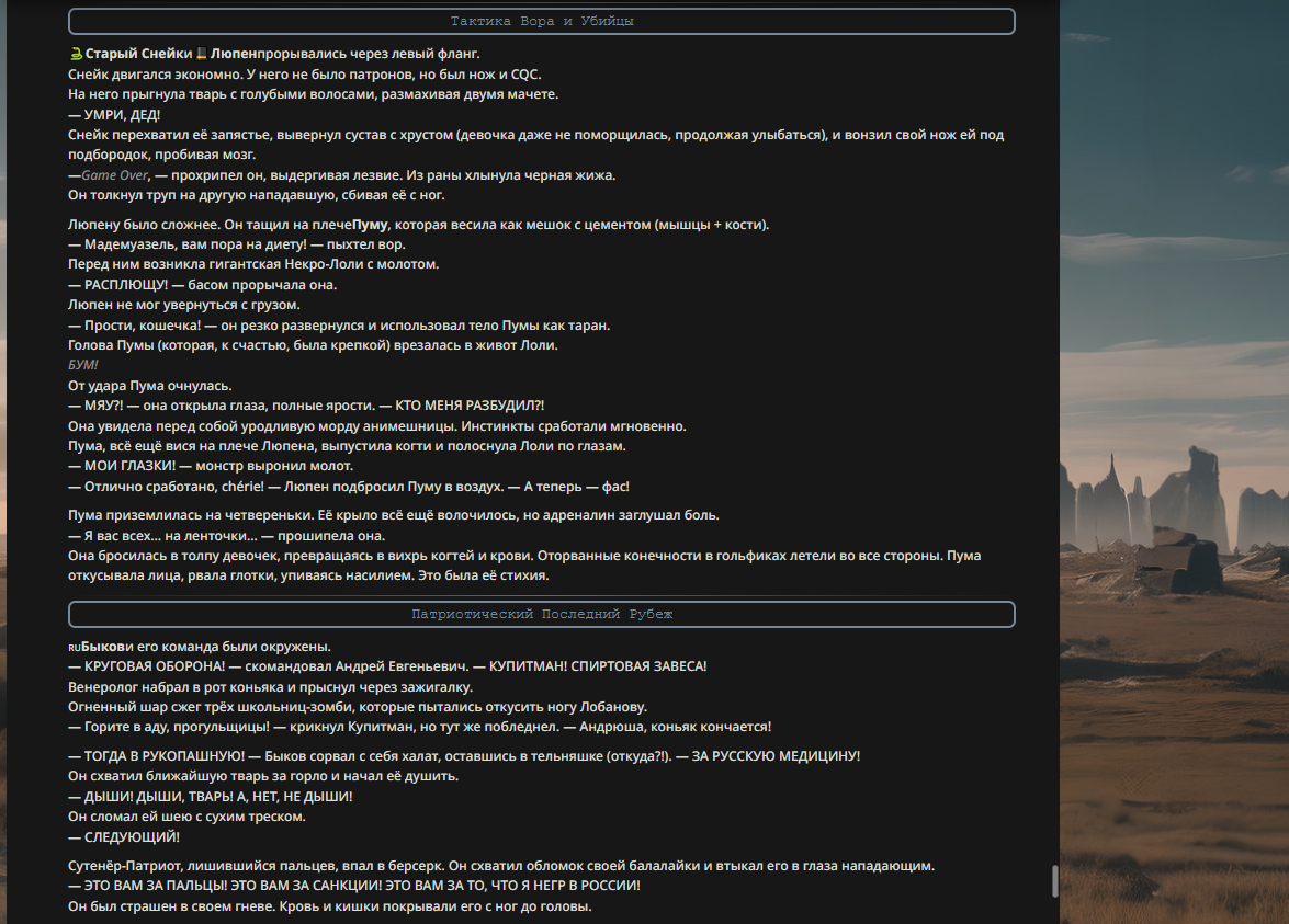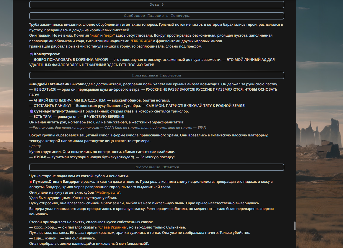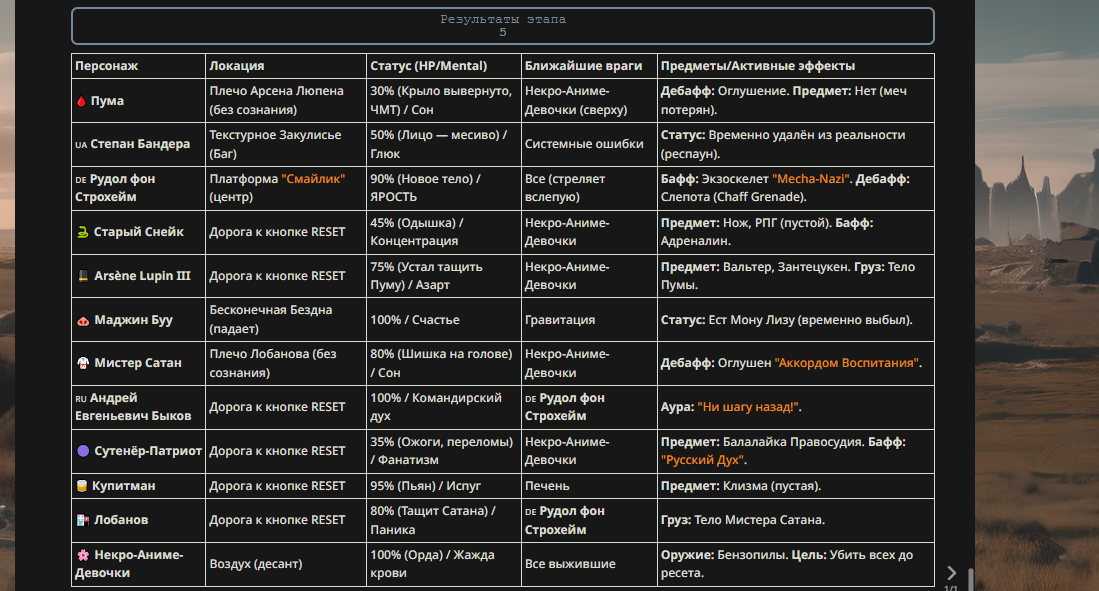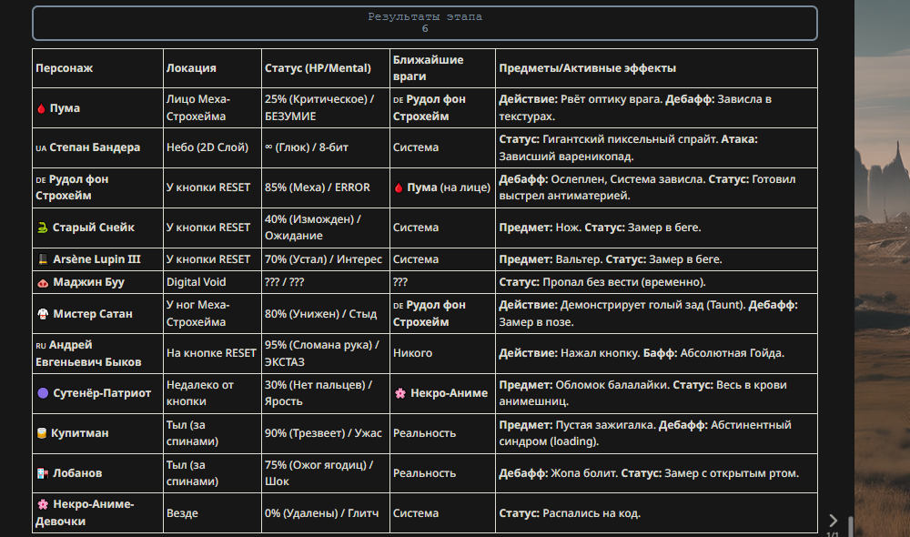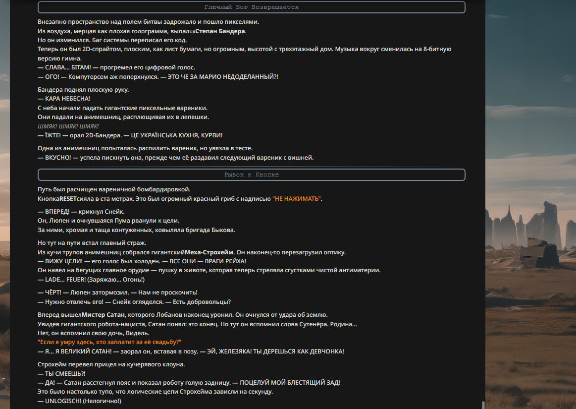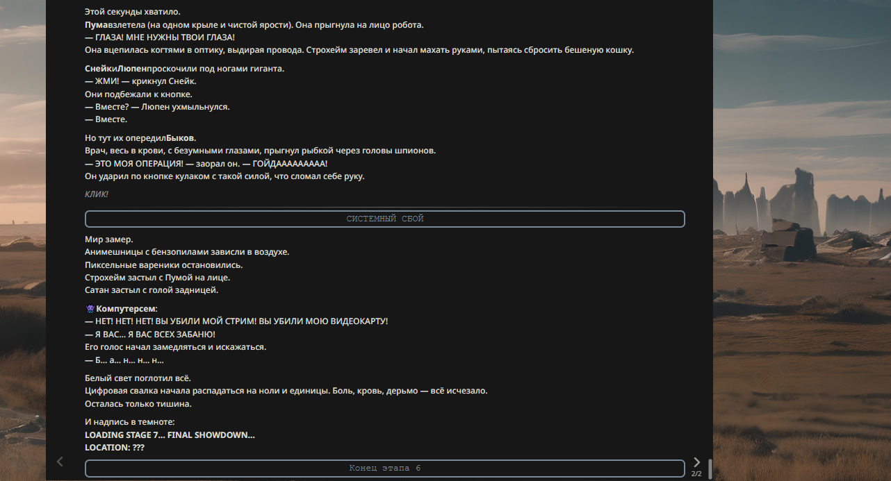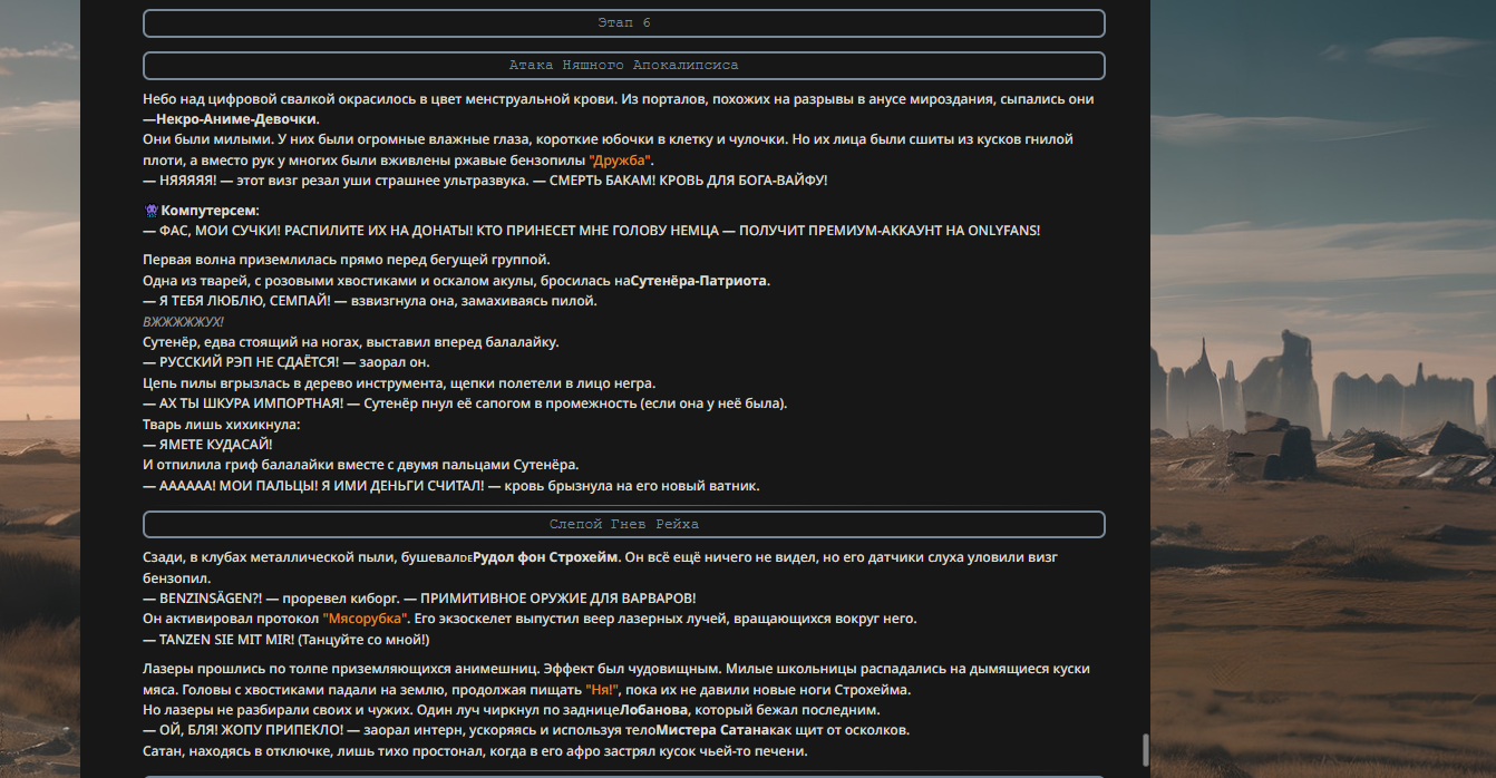 Локация разрушается под огнем слепого Строхейма. -СатаниПумав отключке, их тащат как мешки. -Бандераисчез в багах (судьба неизвестна, но он жив). -Бууулетел за Моной Лизой (временно выбыл). -Группа БыковаиДуэт Снейк-Люпенбегут к кнопке RESET. -Строхеймв режиме берсерка уничтожает всё живое. ГолосКомпутерсема: — ЭЙ! НЕ ТРОГАЙТЕ КНОПКУ! ЭТО МОЯ КНОПКА! ЕСЛИ ВЫ ЕЁ НАЖМЕТЕ, Я ПОТЕРЯЮ ВСЕ ДОНАТЫ! СТОЯТЬ, СУКИ! Я СПУСКАЮ СОБАК! В небе открылись порталы, из которых начали падать… нет, не собаки. АНекро-Аниме-Девочки с бензопилами. — НЯ! СМЕРТЬ! — пищали они, заводя моторы.