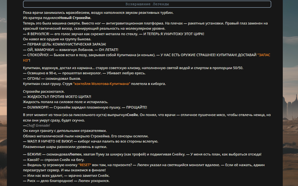 Строхейм, которого Быков и Лобанов сняли с арматуры, лежал на бетоне. — РАЗРЯД! — орал Быков, прикладывая к груди киборга два оголенных провода, вырванных из щитка. БЗЗЗЗТ! Строхейм дернулся. Его единственный уцелевший глаз (внутренний, резервный) вспыхнул красным. — REBOOTING… GERMAN SCIENCE IS ETERNAL… Его системы переключились на замкнутый цикл жизнеобеспечения. Ему не нужен был воздух. Ему нужна была энергия. И Быков только что её дал.