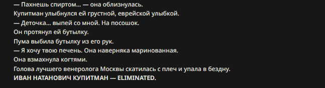 3 — Ты… предлагаешь мне пить из горла? — он скривился, но выбора не было. Он сделал глоток. Жгучая жидкость обожгла горло, но странным образом стало легче. Алкоголь Купитмана нейтрализовал токсины (или просто сделал их безразличными организму). — Спасибо… брат, — прошептал Сутенёр. — Я тебе скидку сделаю.