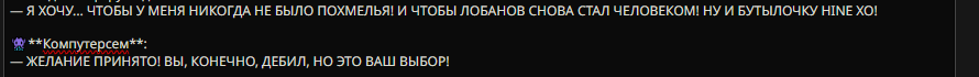 Купитман поднял Сферу. Она была теплой. — Красивая… — пробормотал он. — Как печень здорового человека… 👾Компутерсем: — ИГРОК КУПИТМАН! ВЫ ДЕРЖИТЕ СФЕРУ! ИМЕННО ПОЭТОМУ ВЫ ЯВЛЯЕТЕСЬ ПОБЕДИТЕЛЕМ, ПРАВО НА ЖЕЛАНИЕ У ВАС!