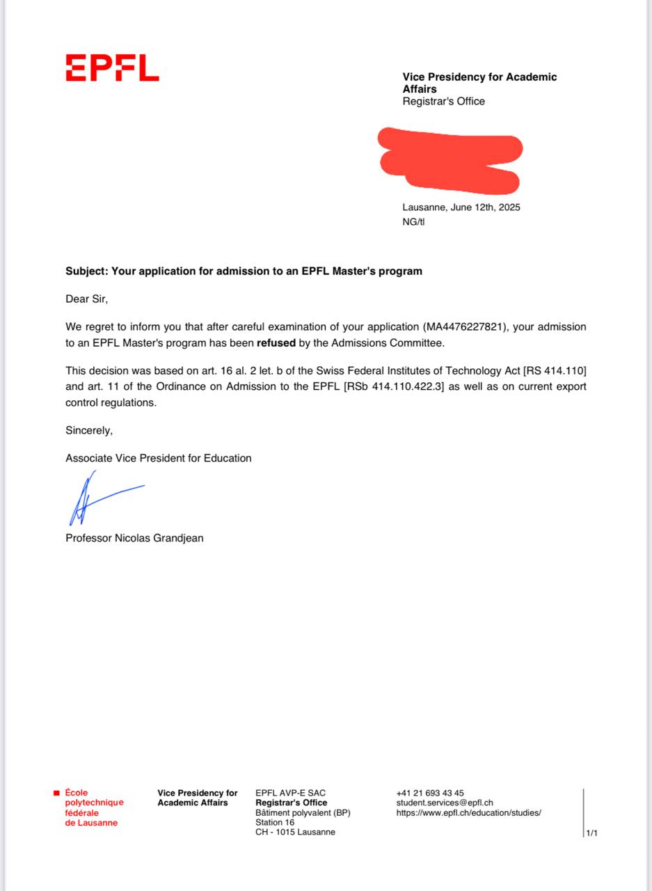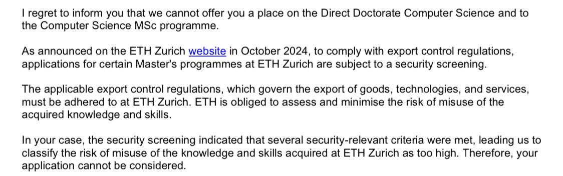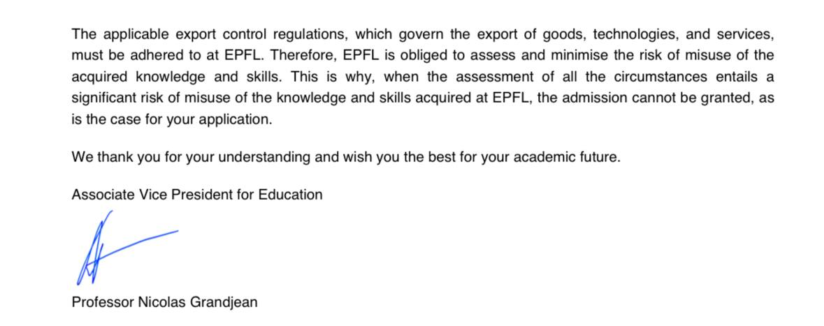 >>327066471 >Реклама это хорошо, но потом тебе пикрил прилетит))) Какая нахуй реклама? Зайди в тг международные стажировки мфти. У всех в профилях стоит: ETH, EPFL, TUMUNICH и т.д. Причем многие недавно поступили. >И ты с этим ничего не поделаешь, обжаловать такое решение возможностей нет)))) А где пруфы, что именно это из-за санкций? Да и помимо Швейцарии есть другие страны.