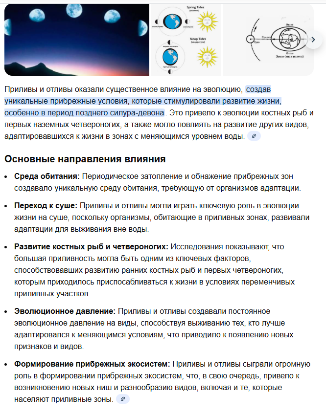 >>327065768 Это частный случай того, о чем я писал. Приливы и отливы происходят по границе между водой и сушей, и являются особенностью той экосреды, которая существовала на этой границе. >>327065190