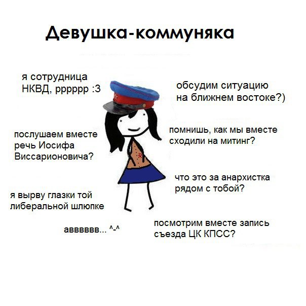 >>327060891 (OP) О коммунизме и революции. Если девушке не интересно уничтожить систему угнетения для таких как я и таких как она - то с ней говорить не о чем. Можно даже без сексизма - в принципе с таким человеком говорить не о чем. Он глуп. Ищу коммунистку, анархистку или хотя бы панкуху. У которой есть яйца послать нахуй систему.