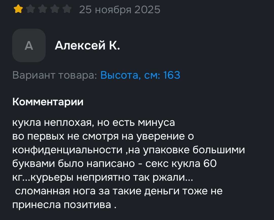 А еще в моем ближайшем ПВЗ работает худенькая миниатюрная зумерша, которая на вид сама весит не более 45кг. Как она эту фигню волочить будет и какая у нее вообще будет реакция, когда она увидит в своей проге, что в этой 50килограмовой коробке лежит 18+ товар?