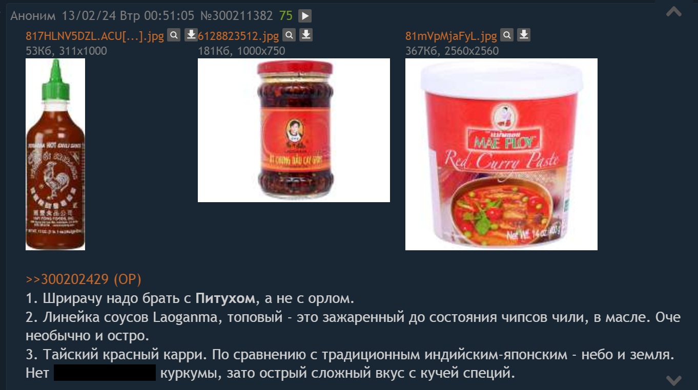 >>327201507 Шрирача это бренд, сам соус называется toung ot, вьетнамский соус чили. У вьетнамцев их огромное кол-во брендов, заебешься пробовать. Если в большом городе живешь, найти рынок с вьетнамцами и попробуй пару разных брендов, они в Россию привозят только самые популярные у них на родине бренды. Еще на озоне видел продаются, но барыги накручивают х2-3 цену от вьетнамца.
